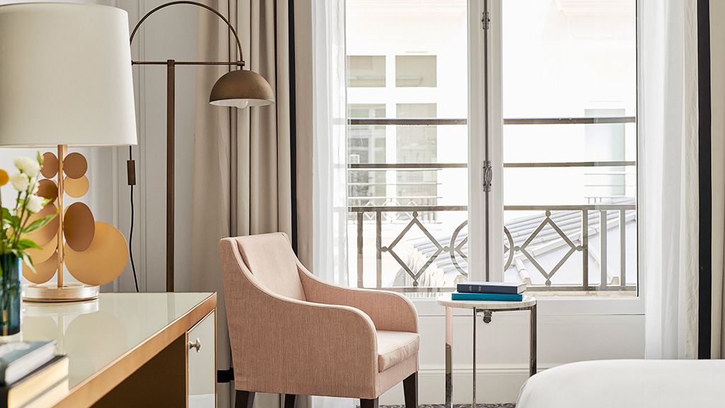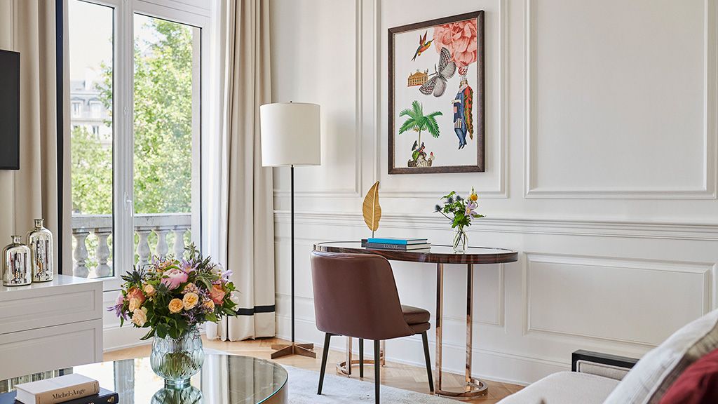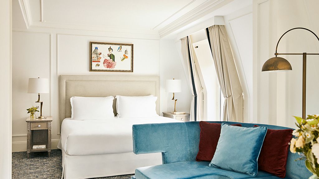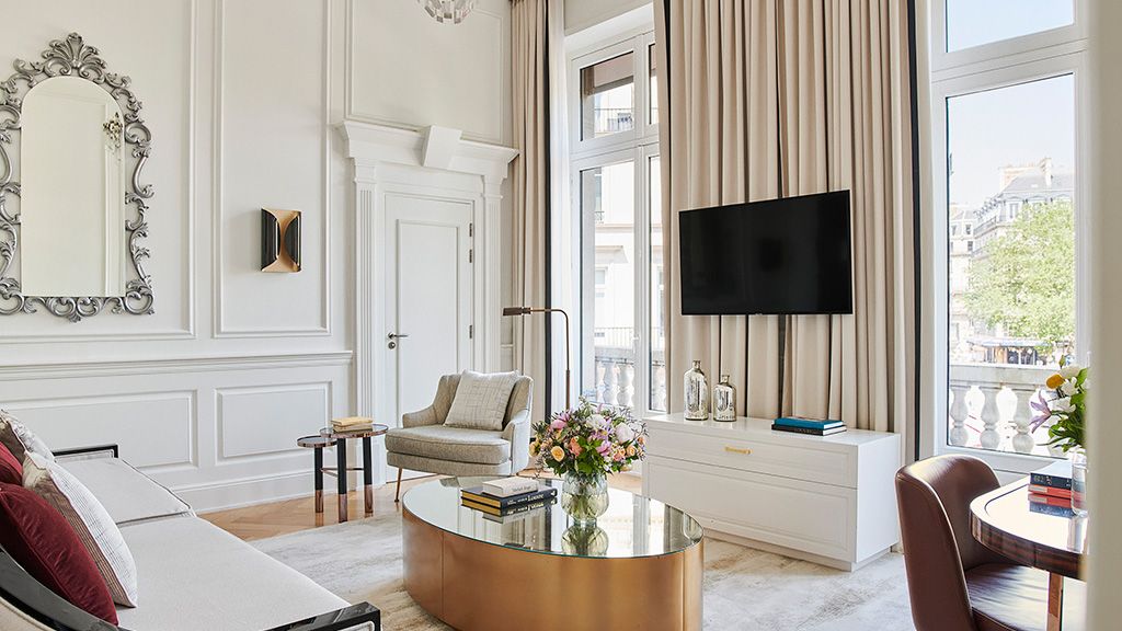 These bright 35-square-meter (375 sq.ft.) junior suites offer a generous king-bed room leading to a large seating area with sofa, as well as unique views over iconic Parisian monuments.