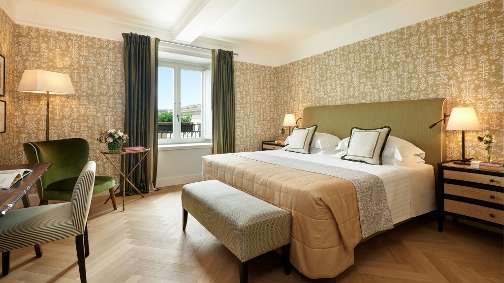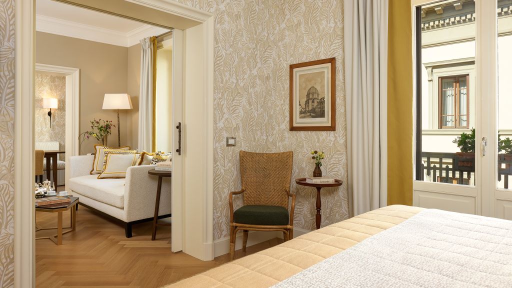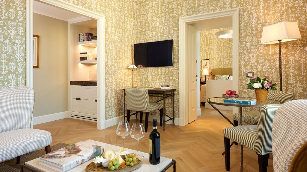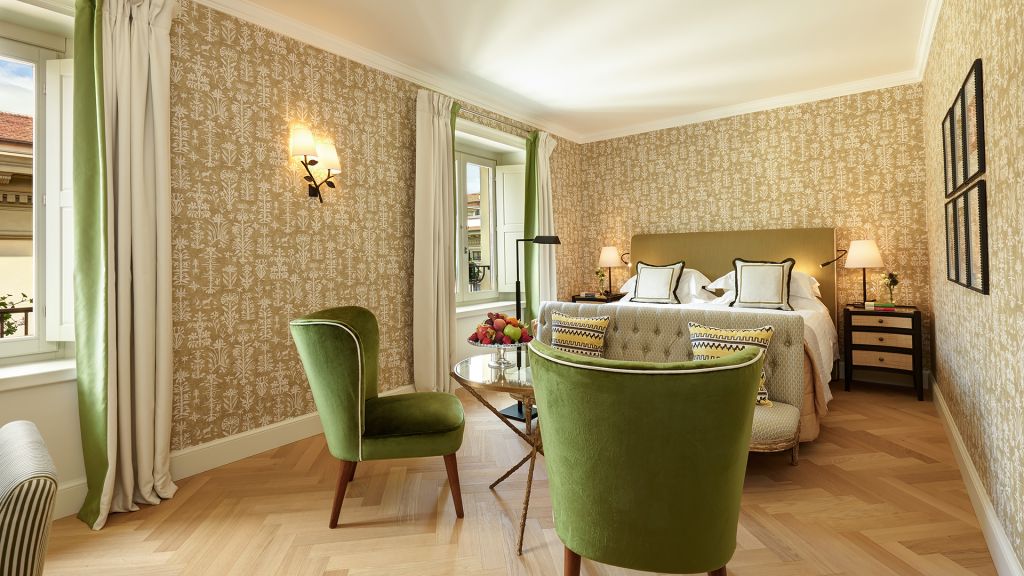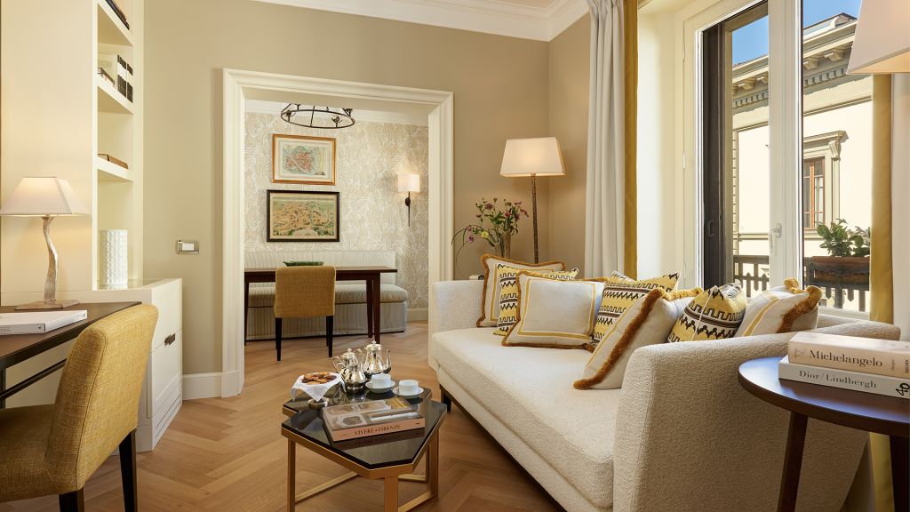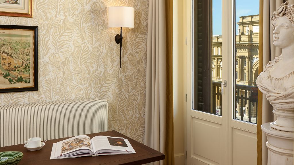 Our sumptuous Junior Suites offer style and comfort in equal measure. Overlooking the picturesque historical city centre or Piazza della Repubblica, these generously-sized suites bring the majesty of Florence into their light-flooded spaces through a curated collection of Italian furnishings and deluxe Tuscan-inspired fabrics. The spacious bathrooms showcase fine Carrara marble, chic mosaics, and a range of our pampering, exclusive Irene Forte Skincare toiletries products, while the combined living and sleeping areas have a lush woodland theme running throughout the elegant, contemporary decor. From the wooden parquet floor and leaf-bedecked wallpaper to the soft furnishings in shades of moss, stem and sunflower, our Junior Suites promise serene luxury and relaxation.