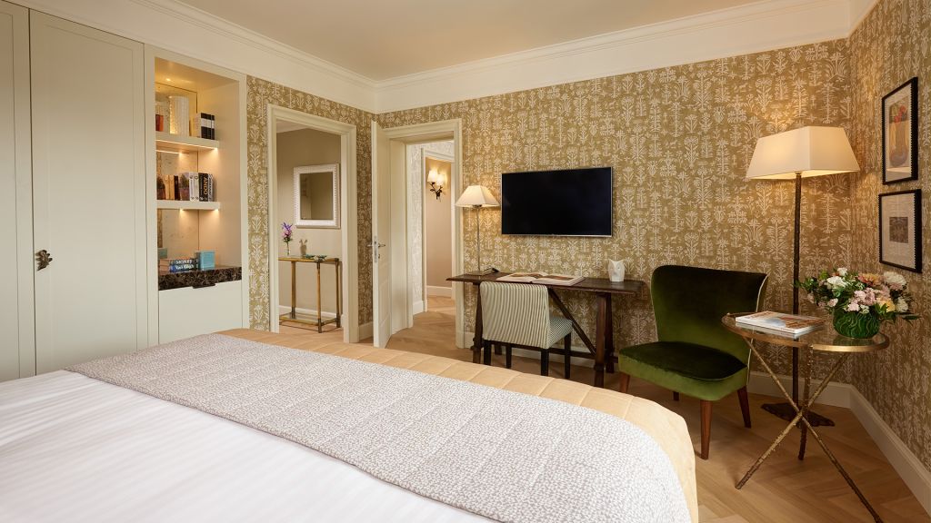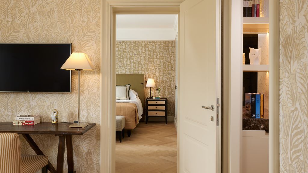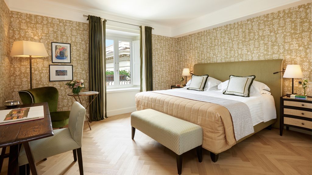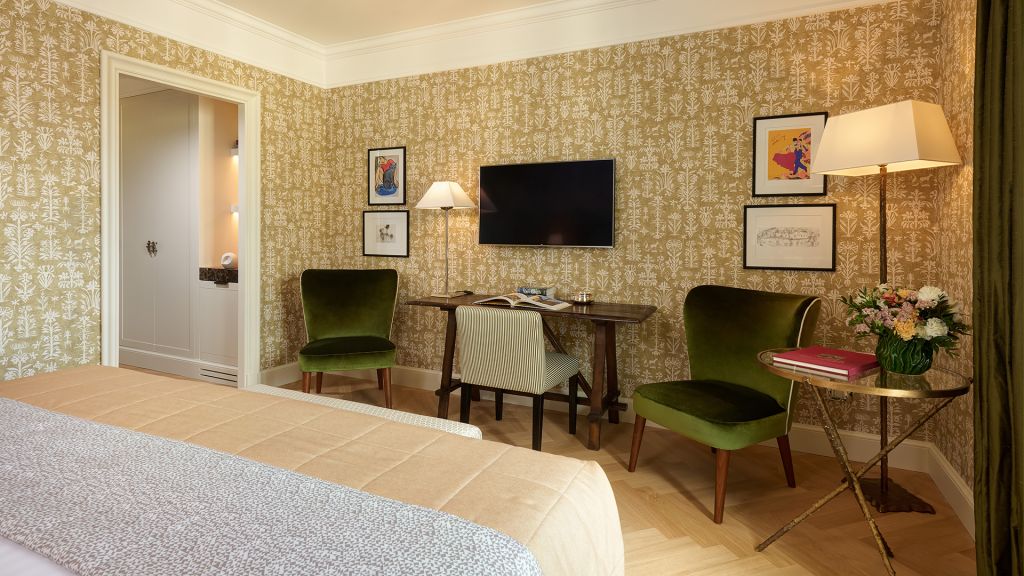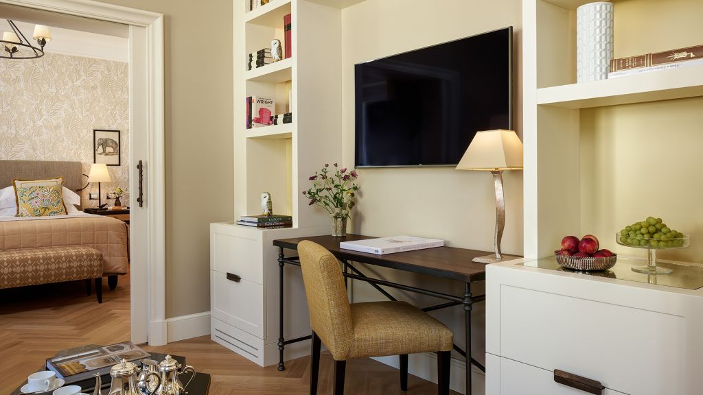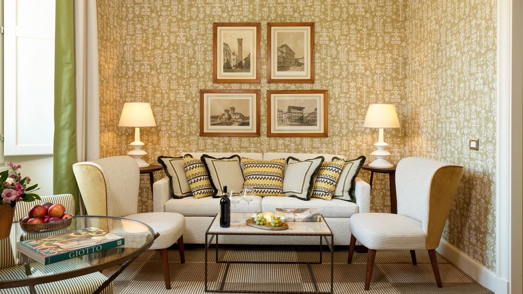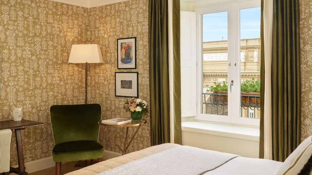 Our sumptuous Junior Suites offer style and comfort in equal measure. Overlooking the picturesque historical city centre or Piazza della Repubblica, these generously-sized suites bring the majesty of Florence into their light-flooded spaces through a curated collection of Italian furnishings and deluxe Tuscan-inspired fabrics. The spacious bathrooms showcase fine Carrara marble, chic mosaics, and a range of our pampering, exclusive Irene Forte Skincare toiletries products, while the combined living and sleeping areas have a lush woodland theme running throughout the elegant, contemporary decor. From the wooden parquet floor and leaf-bedecked wallpaper to the soft furnishings in shades of moss, stem and sunflower, our Junior Suites promise serene luxury and relaxation.