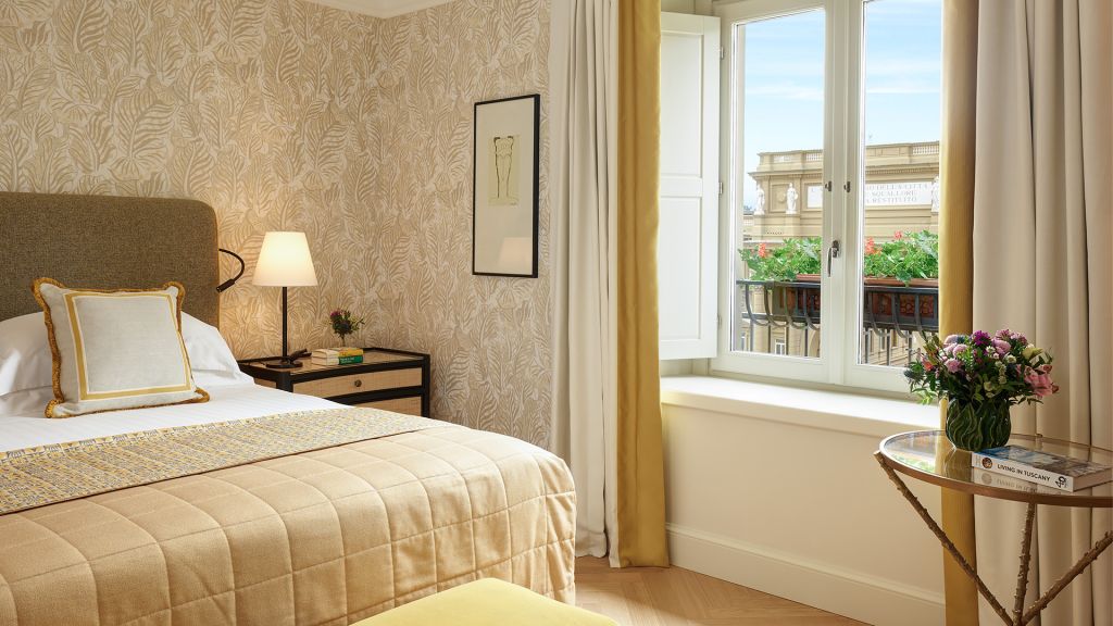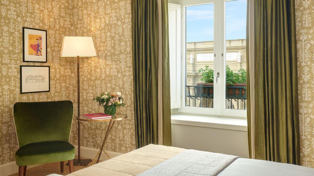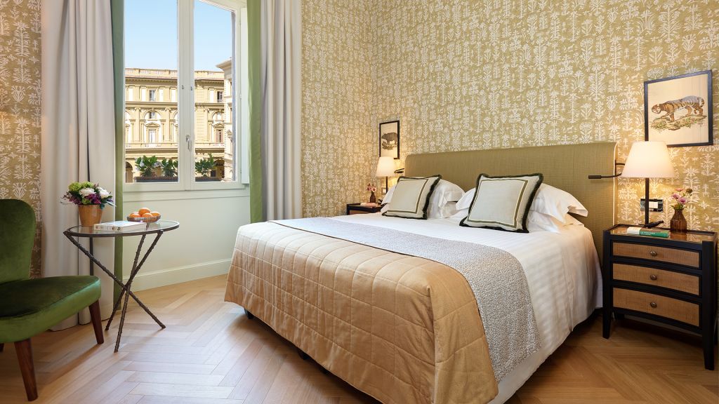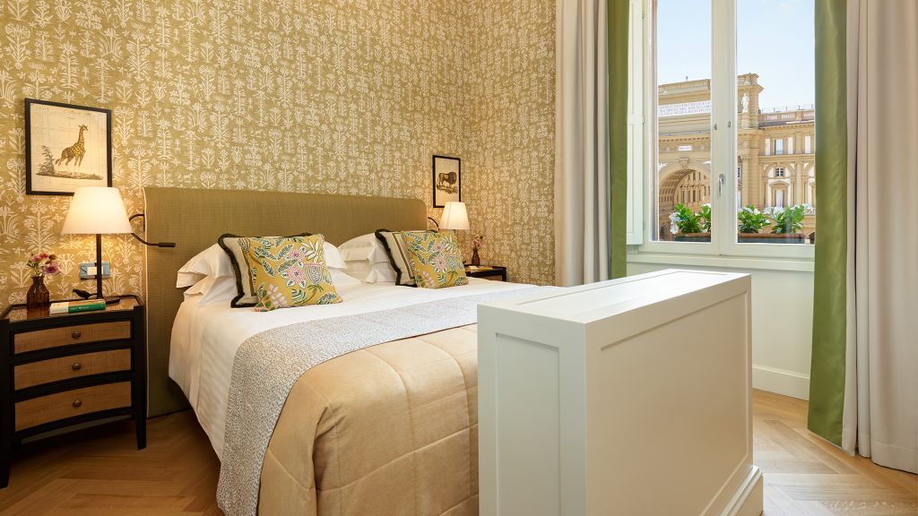 Our Superior Rooms are decorated with parquet floors and Tuscan-inspired fabrics in vivid colours, from red to orange and green, marrying the Renaissance heritage of Florence with the contemporary modernity of the hotel. Looking out over Piazza della Repubblica or the charming historic centre of Florence, the rooms bring the outside world in through Florentine artefacts and bespoke furniture from local artisans, while supremely comfortable double beds and armchairs are perfect for relaxing in. In addition, some of our Superior Rooms have a spacious walk-in wardrobe, adding a little extra glamour to dressing for dinner. As night falls, pamper yourself with Irene Forte Skincare products in a chic marble bathroom.