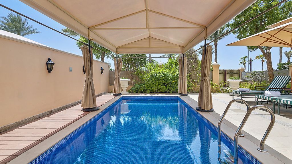 2 bedroom family apartment with pool - 2 bedrooms, living room with dining area, large furnished terrace with 3x5 meter individual pool overlooking palm jumeirah crescent road and arabian sea, bathrooms inside both bedrooms, lcd screen tvs, dvd player, bose audio system with ipod connectivity, laptop size safe box, wi-fi. Fully equipped kitchen with non-alcoholic minibar, nespresso coffee machine, electric kettle, microwave, toaster and cooker. Maximum occupancy: 4 adults and 2 children (a child up to 5 years can share parents room at no charge. Only 1 extra bed is allowed upon availability for a child between 6 and 12 at a surcharge of aed 240.) suite size excluding terrace: 150 to 185 sqm.