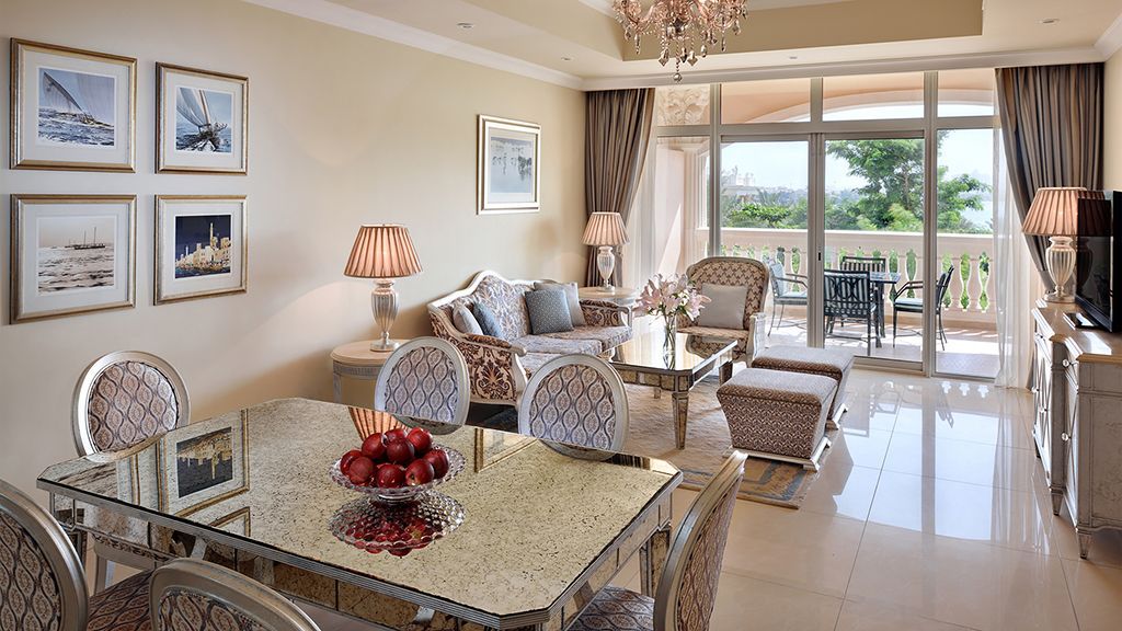 Palm 2 bedroom family apartment- 2 bedroom, living room with dining area, large furnished terrace, bathrooms inside both bedrooms, lcd screen tvs, dvd player, bose audio system with ipod connectivity, laptop size safe box, wi-fi. Fully equipped kitchen with non-alcoholic minibar, nespresso coffee machine, electric kettle, microwave, toaster and cooker. Maximum occupancy: 4 adults and 2 children (a child up to 5 years can share parents room at no charge. Only 1 extra bed is allowed upon availability for a child between 6 and 12 at a surcharge of aed240.) suite size excluding terrace: 112 to 150 sqm.