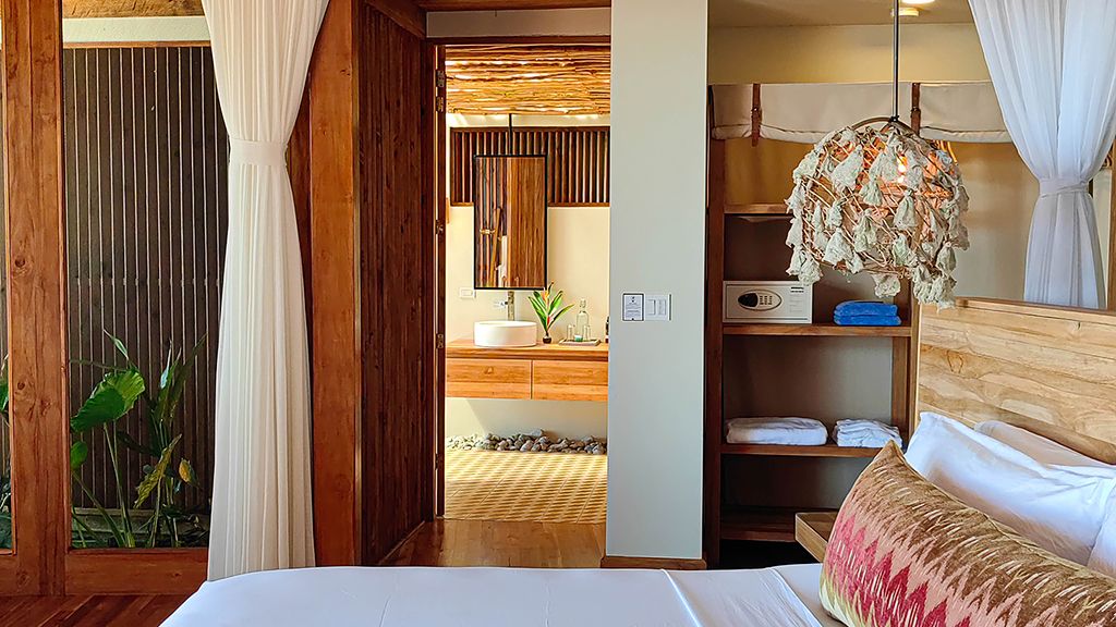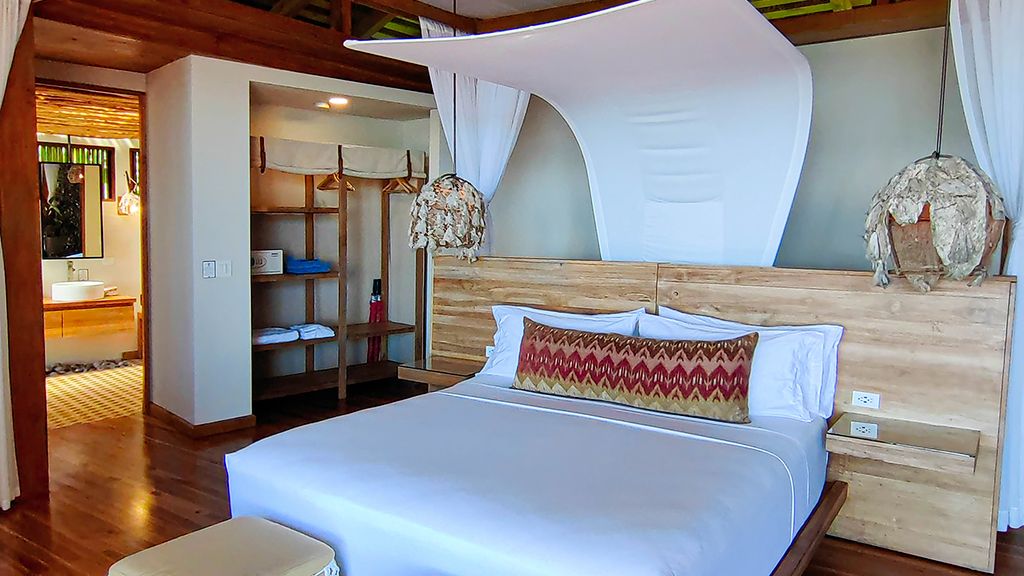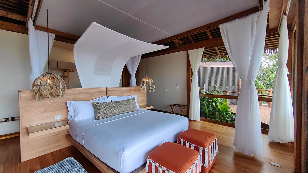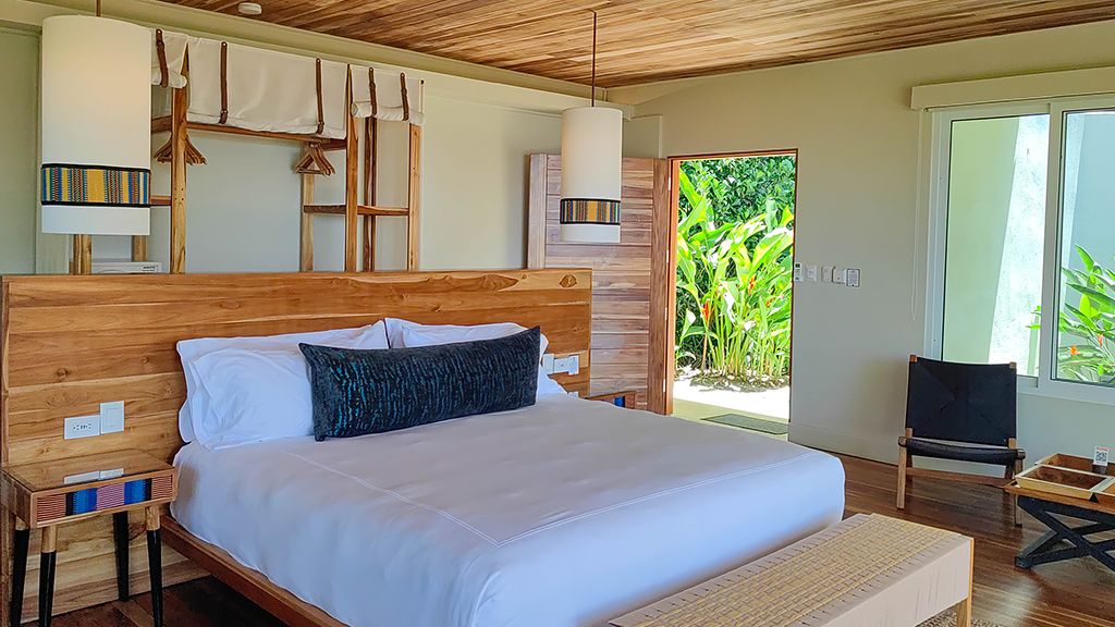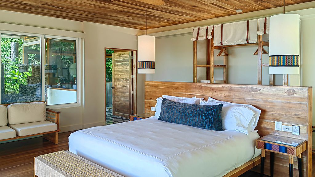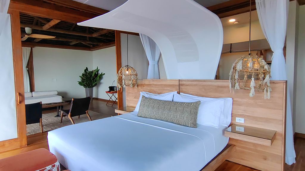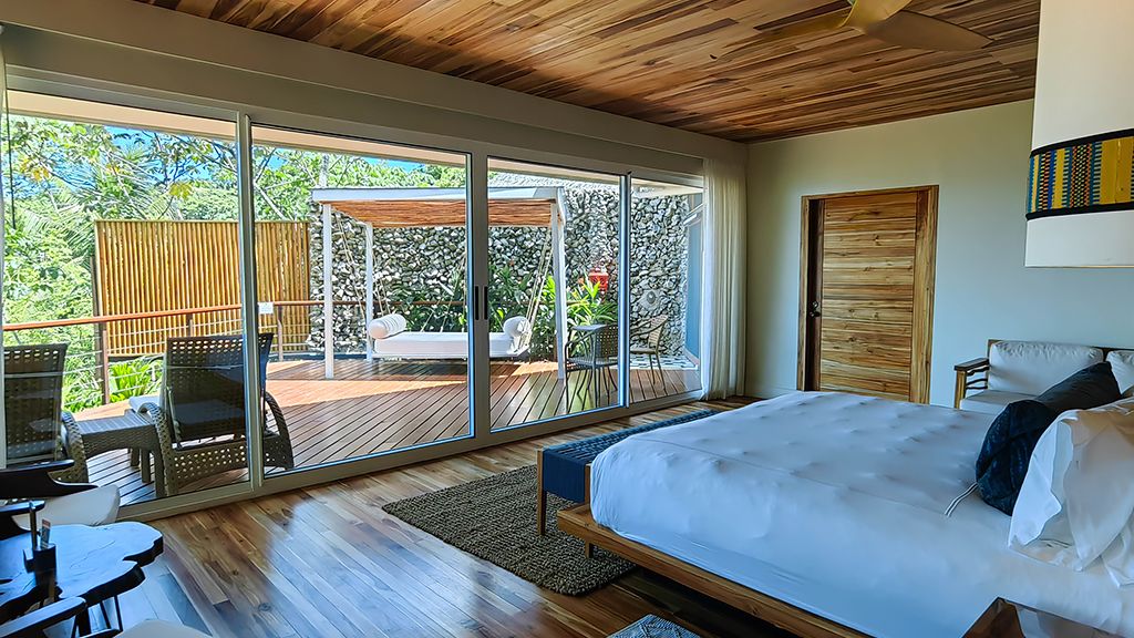 Villa with king bed, ocean view and day bed.