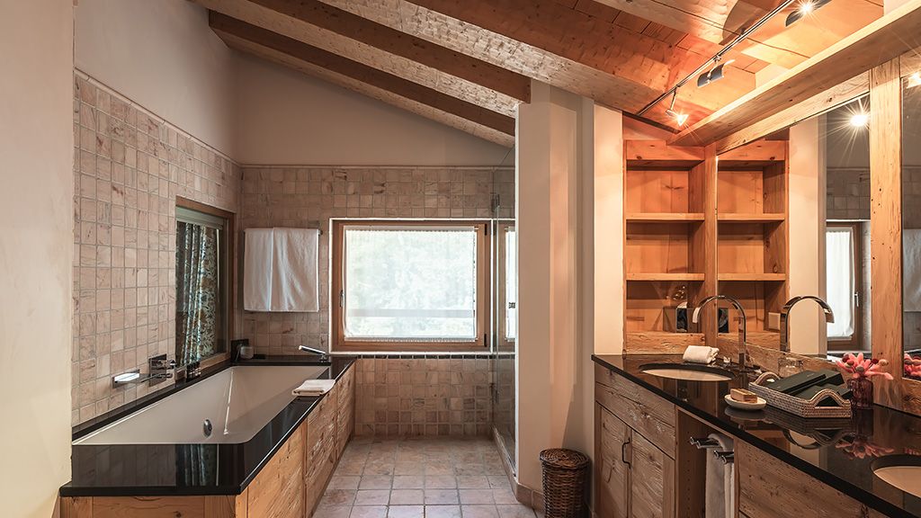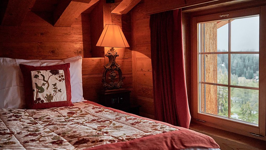 Lounge with fireplace and sofa bed, CD-DVD player, Nespresso machine, minibar, terrace with panoramic view on the mountains.Master bedroom with king-size bed, fireplace, CD-DVD player, safe, bathroom with shower and Jacuzzi bathtub, plasma TV. Access to the terrace. On the first floor, desk, king size bed, bathroom with Jacuzzi bathtub and plasma TV.