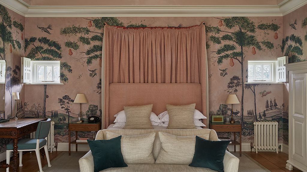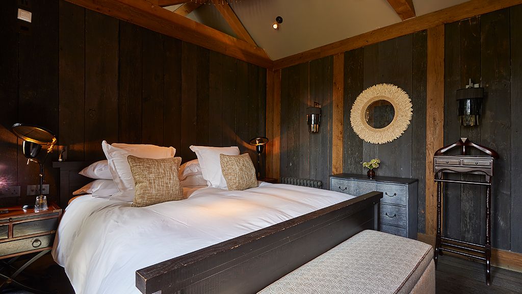 Designed exclusively with couples in mind, an elegant and romantic grownups getaway. The suite reflects the surrounding woodland through its forested wallpaper, with a soft pink ceiling creating an enchanting retreat. Downstairs consists of a spacious lounge with a private terrace and big bar larder. Upstairs, the master bedroom has a super king-size bed with fireplace.