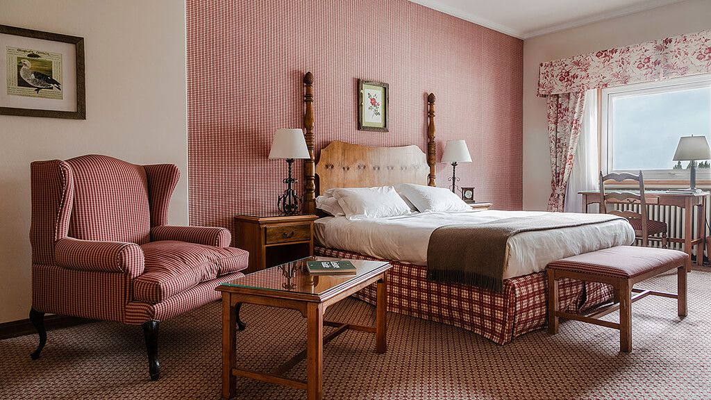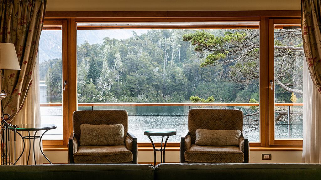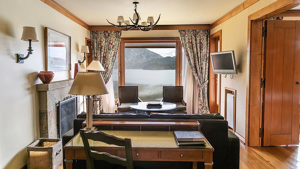 Deluxe Moreno Lake Royal Suite King Spacious Suite with large windows and fireplace, beautiful views of Moreno Lake and Mt. Tronador, bathroom with double Jacuzzi and sauna, dressing room, terraced balcony, air-conditioning.