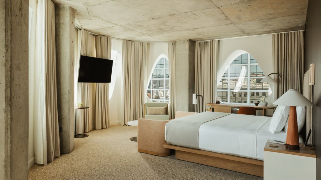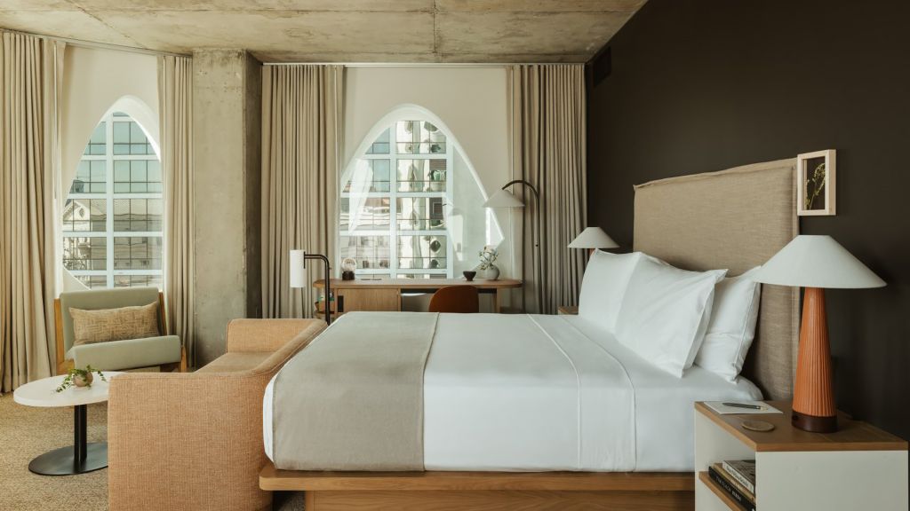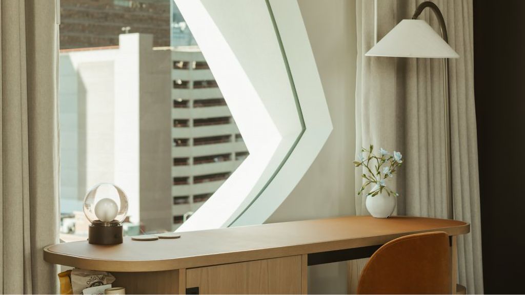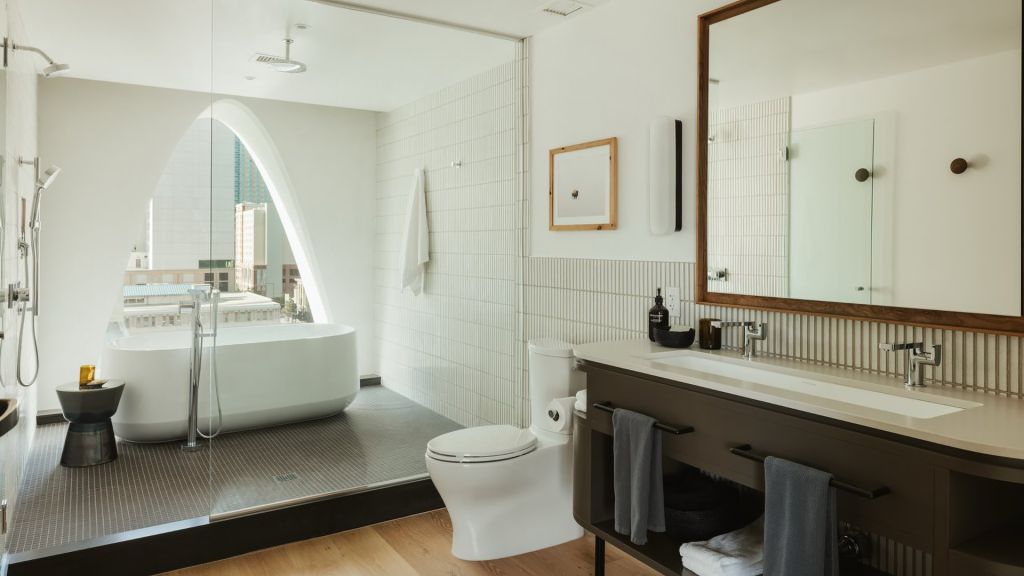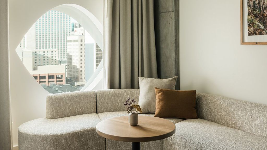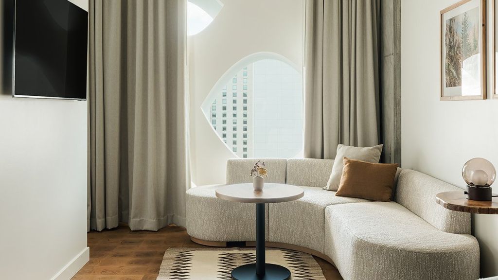 Guest rooms and suites are defined by light and proportion. Floor-to-ceiling Aspen-eye windows frame shifting Denver light and skyline, offering views that feel curated. Furnishings are spare but warm; materials feel tactile and grounded, and thoughtful touches like artisan bath products and in-room bar offerings nod to quality. The larger corner suites unfurl into living spaces that feel like the perfect place to linger with a book or the view.