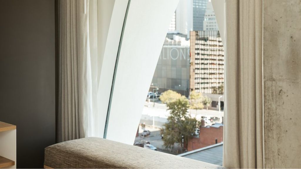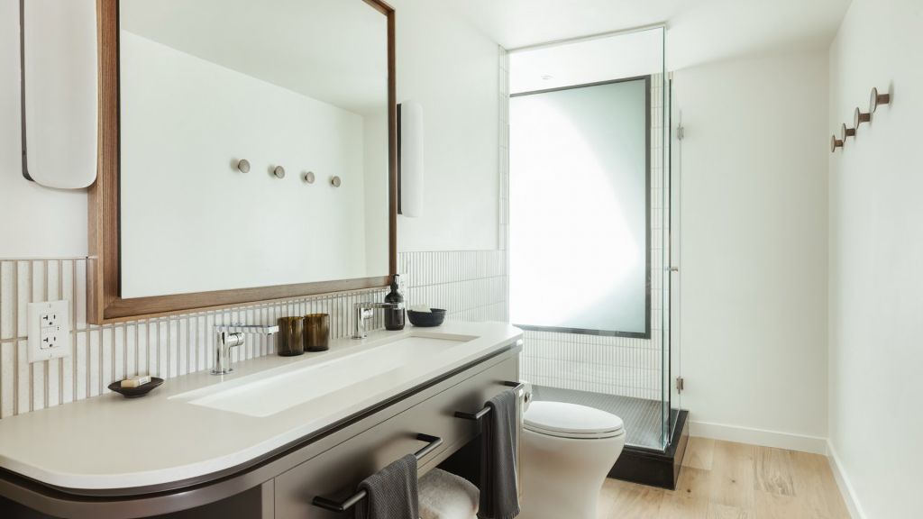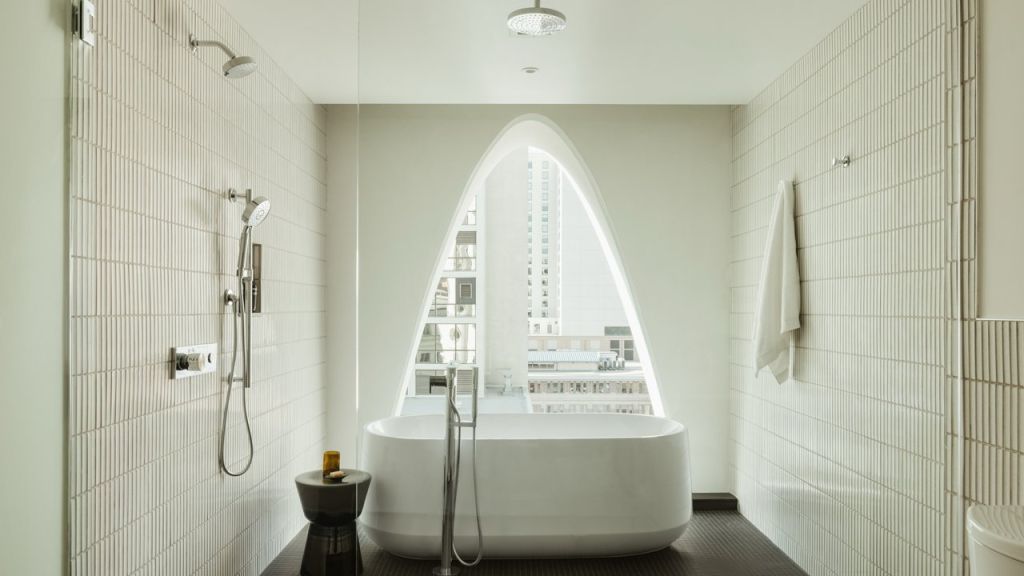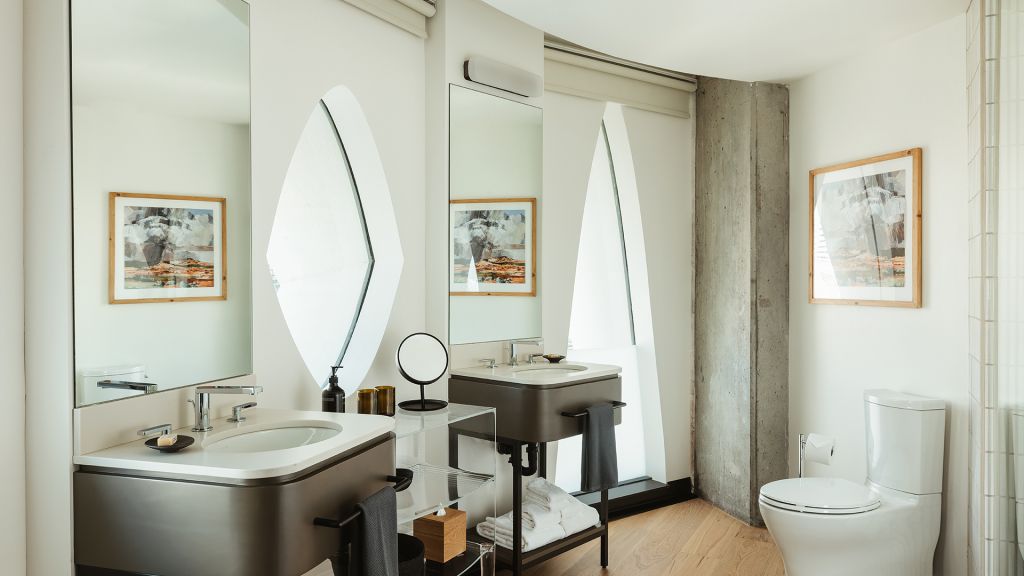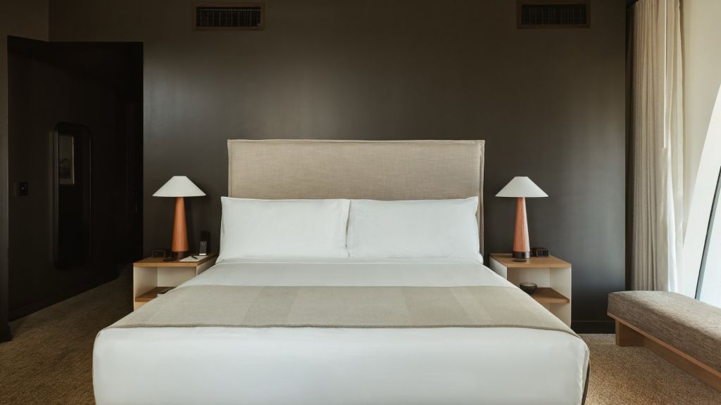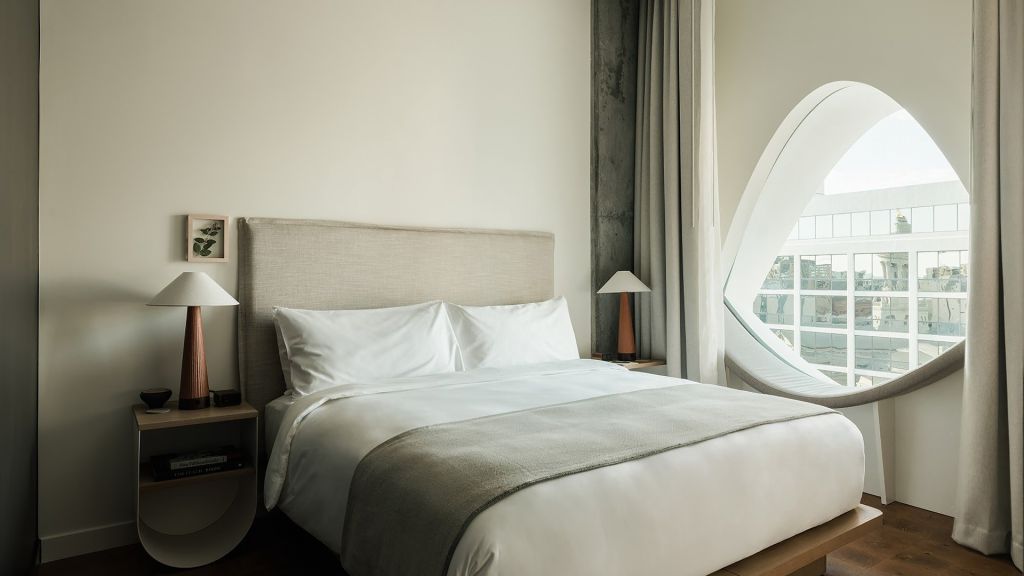 Guest rooms and suites are defined by light and proportion. Floor-to-ceiling Aspen-eye windows frame shifting Denver light and skyline, offering views that feel curated. Furnishings are spare but warm; materials feel tactile and grounded, and thoughtful touches like artisan bath products and in-room bar offerings nod to quality. The larger corner suites unfurl into living spaces that feel like the perfect place to linger with a book or the view.