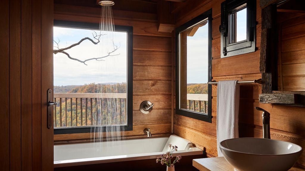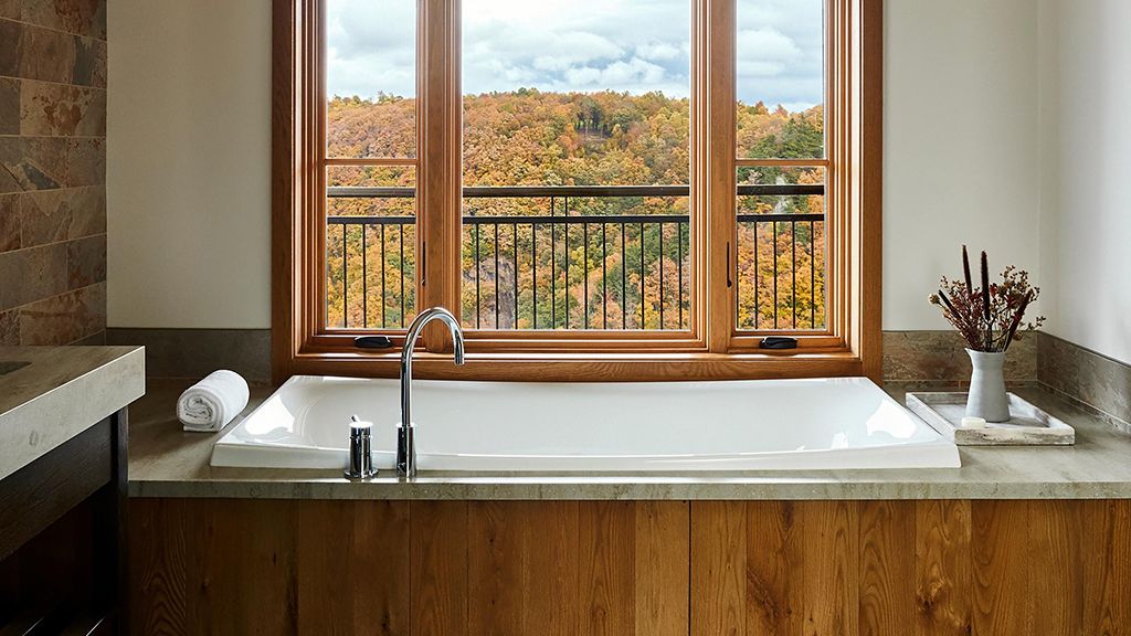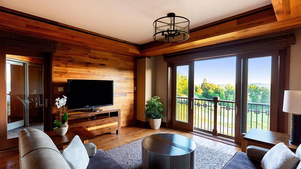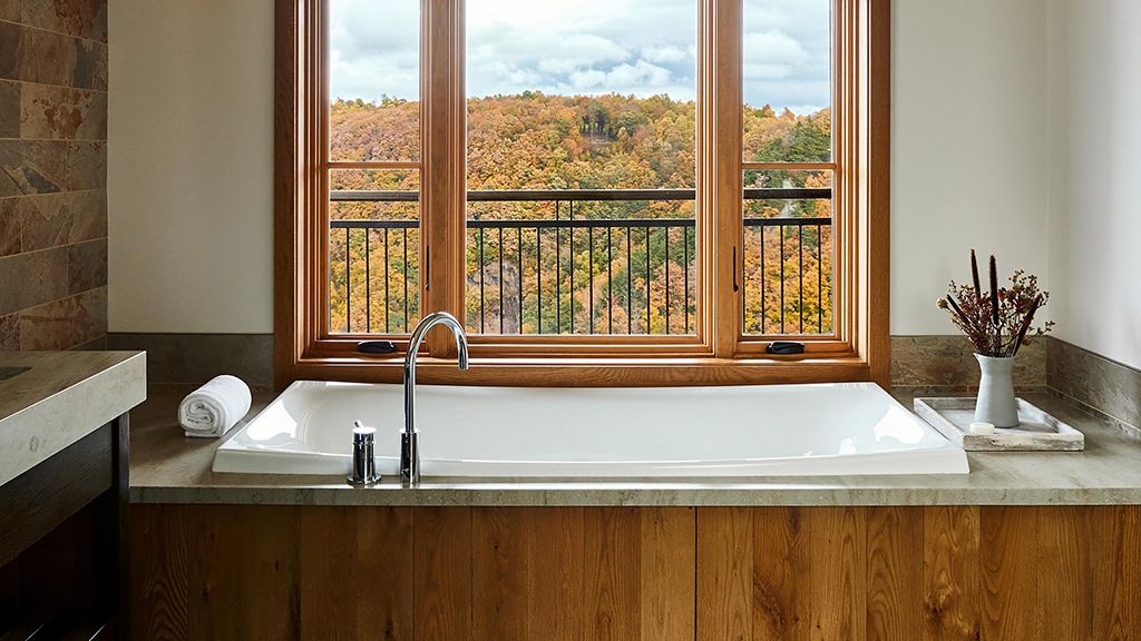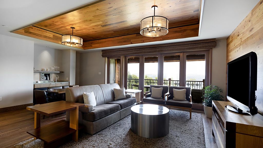 With their own 248-square-foot decks, juliette balconies, and separate living rooms offering sweeping views of the verdant valley below, pinnacle suites are situated within each of the four pinnacle cottages. Luxuriate in the spacious master bedroom with one king bed, where down duvets, plush frette robes and slippers, and custom-designed frette sheets ensure maximum comfort. The generous bathroom features luxurious bvlgari bath products, while a gas fireplace in the private living room creates a cozy atmosphere. Dan river suite guests also enjoy access to the cottage shared living areas.