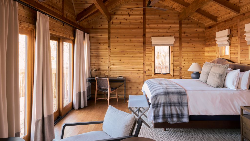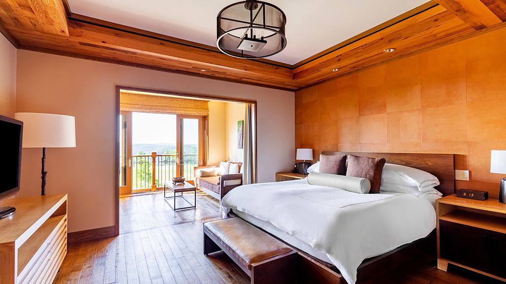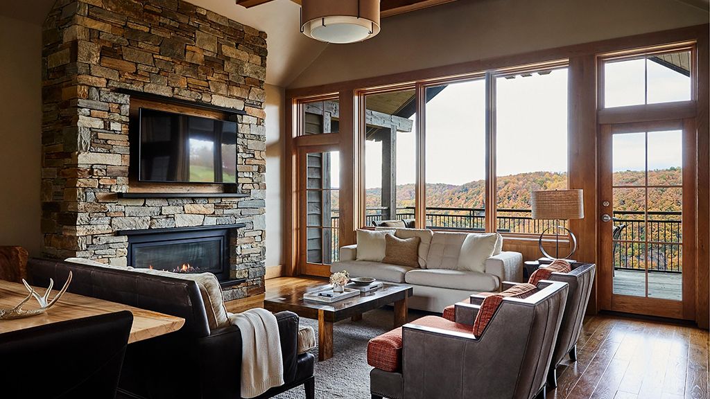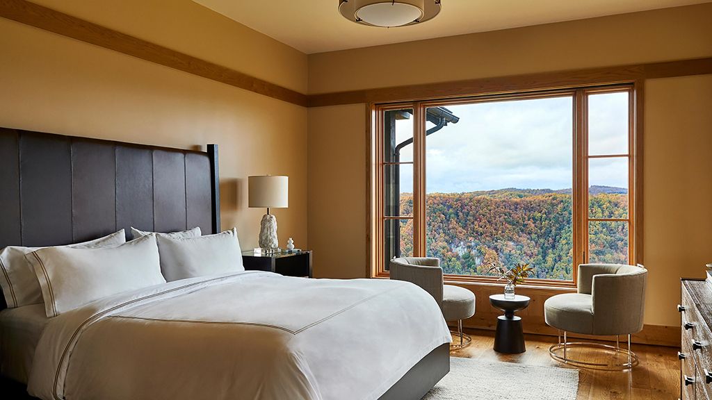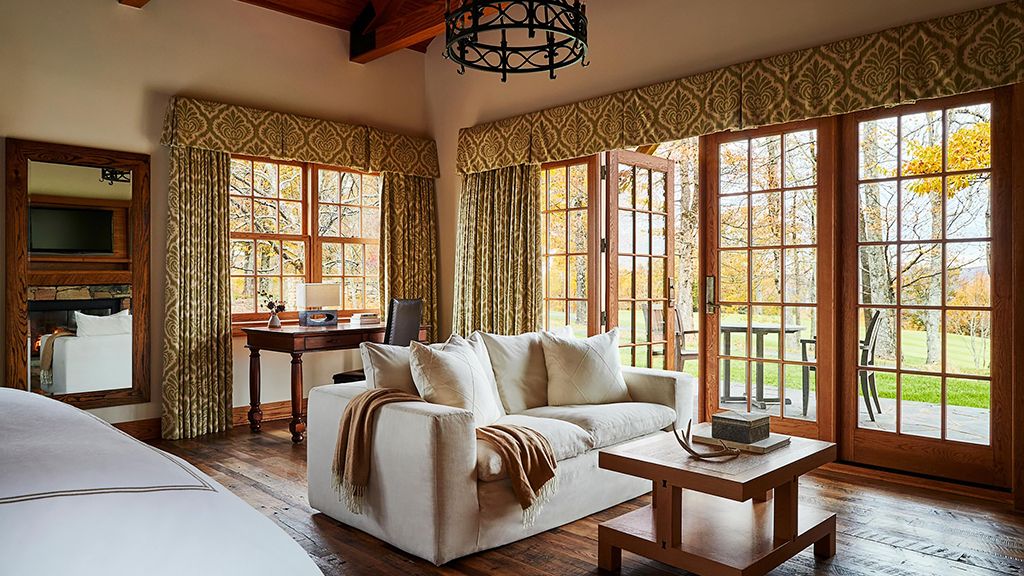 With their own 248-square-foot decks, juliette balconies, and separate living rooms offering sweeping views of the verdant valley below pinnacle suite two queens are situated within each of the four pinnacle cottages. Luxuriate in the spacious master bedroom with two queen beds, where down duvets, plush frette robes and slippers, and custom-designed frette sheets ensure maximum comfort. The generous bathroom features luxurious bvlgari bath products, while a gas fireplace in the private living room creates a cozy atmosphere. Dan river suite guests also enjoy access to the cottage shared living areas.