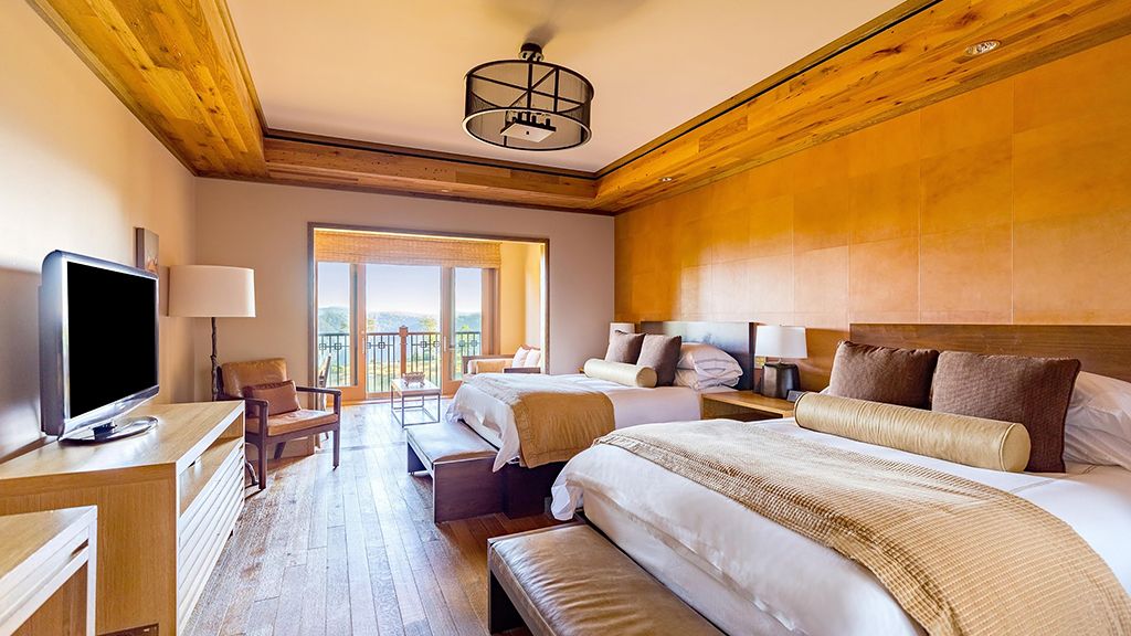 Claiming panoramic mountain views, these elegant, light-filled rooms are configured with two queen beds, and many boast sliding panels to personalize your layout. Bathrooms feature imported european glass mosaic tiles and the clean lines of dornbracht fittings, and can bring the outdoors in through sliding doors that open up the rooms. Original wooden floors are complemented by a milk and honey palette rich in texture, while down duvets, plush robes and slippers, bvlgari bath products, and custom-designed frette sheets satisfy the senses on every level.