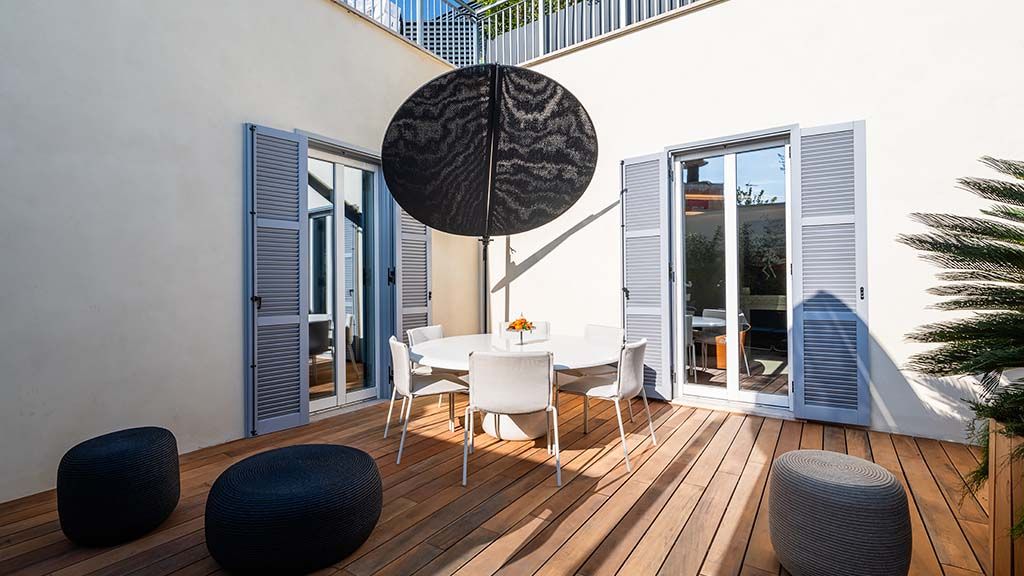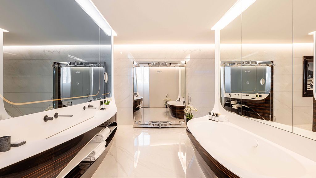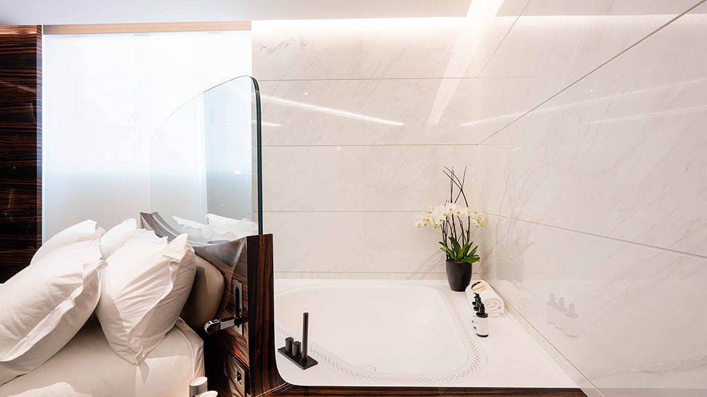 There’s also a sprinkling of celebrity magic to be found at ROMEO Roma’s signature dining experience, Il Ristorante Alain Ducasse Roma. The Michelin-starred chef’s incomparable style seduces the palate across a menu crafted from the finest seasonal ingredients. All hotel guests enjoy an à la carte Alain Ducasse breakfast included with their stay. LA TERRAZZA, located on the 6th floor, in collaboration with Krug Champagne, offers unique experiences with an exclusive selection of bubbles and breathtaking views over Rome’s rooftops—perfect for special events or luxurious aperitifs. IL BAR is a stunning lounge with mesmerizing chrome ceilings and beautiful lighting. Be sure to check out IL CORTILE, located in the internal courtyard. It offers a Mediterranean menu with all-day dining and features an outdoor pool, where guests can admire ancient Roman ruins visible through a glass panel at the bottom of the pool.