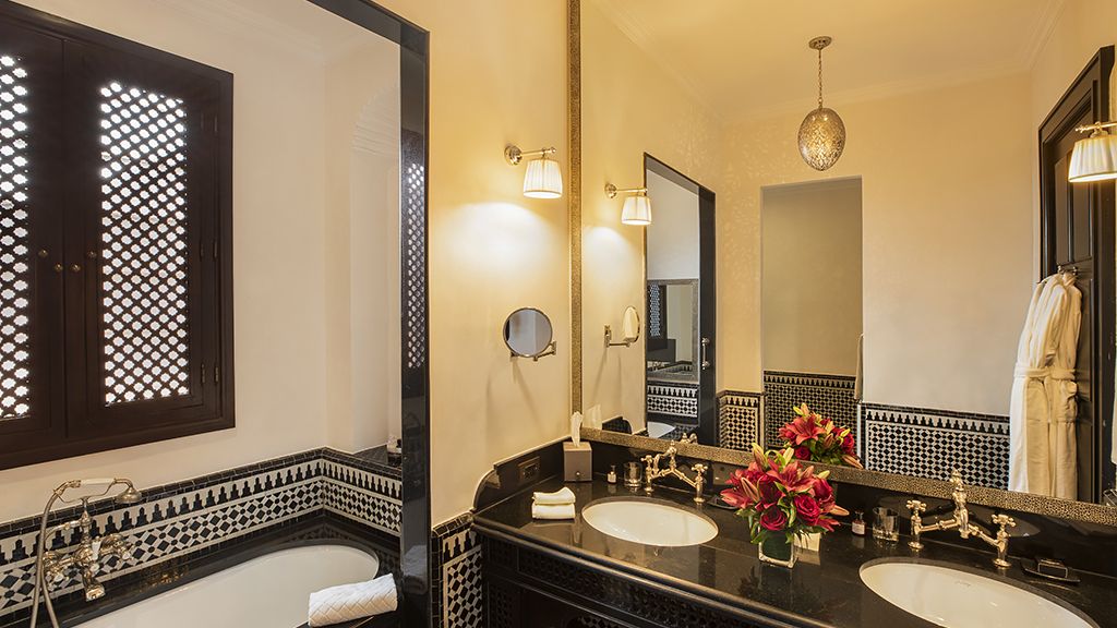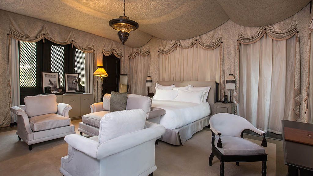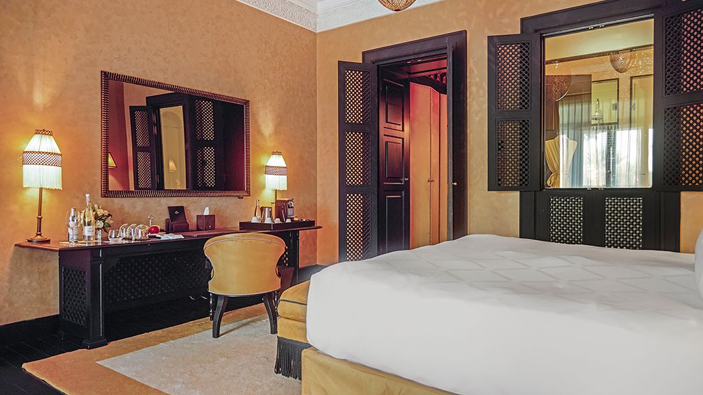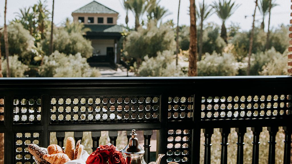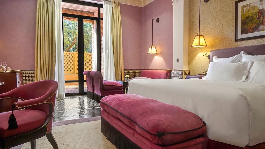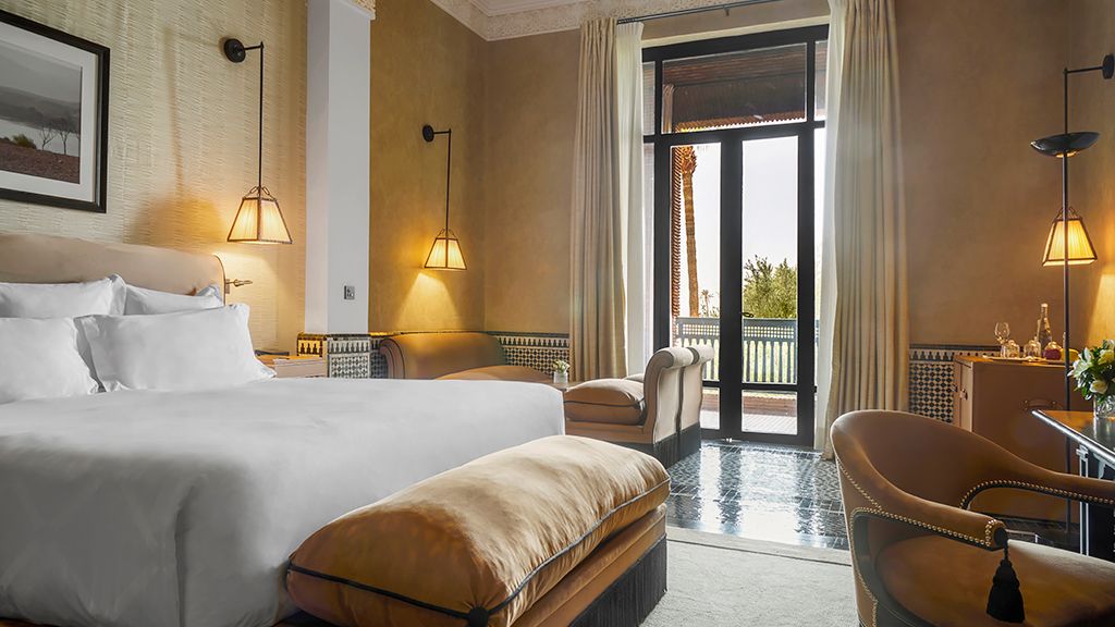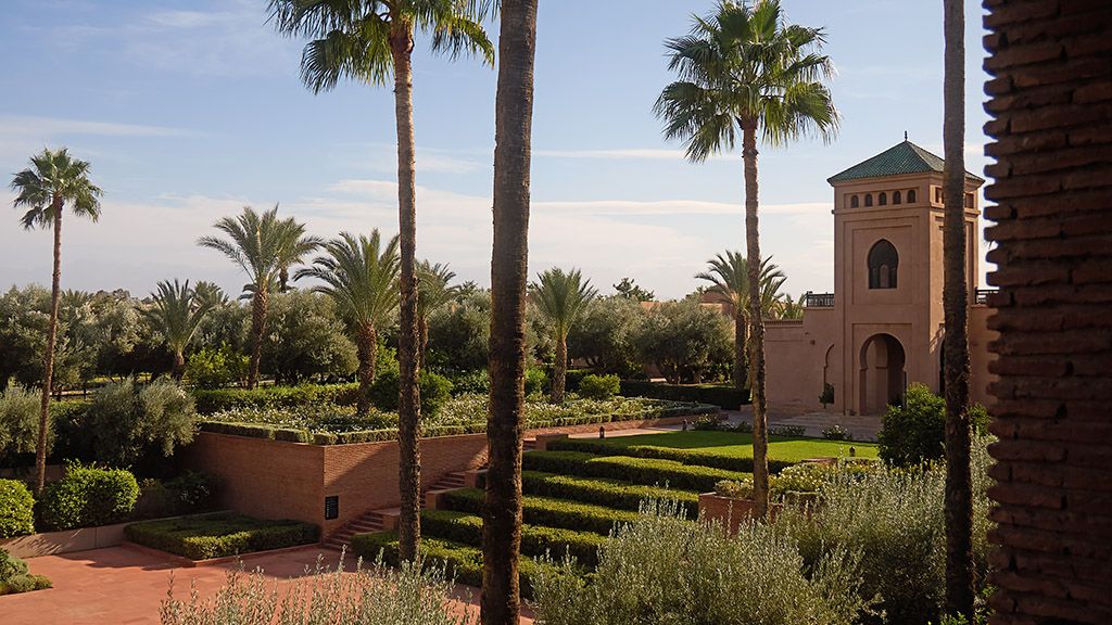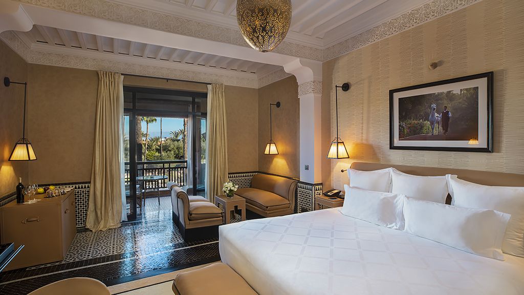 Nestled on six hectares of pristine gardens, the palace holds 60 rooms, suites and villas, all with private outdoor areas and beautiful views of the gardens, Atlas Mountains, and the 80-meter long swimming pool.