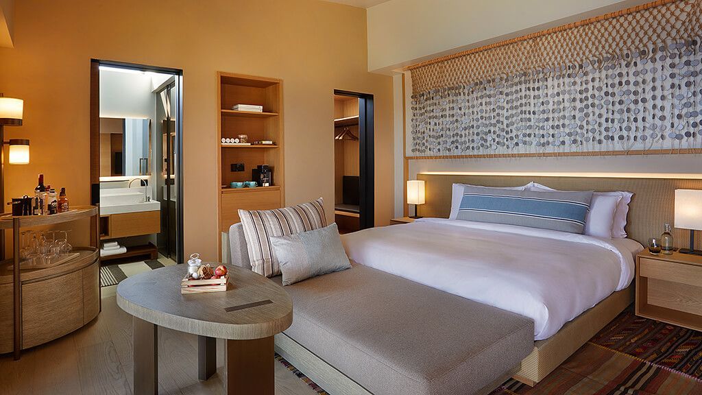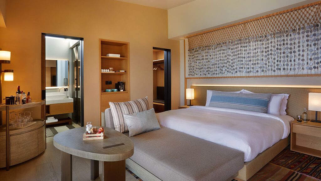 The room's soft decor along with indigo and ochre and flashes of deep turquoise offers a twin bed plus a cozy corner sofa, occasional table and desk. A beautifully fitted walk-in closet and dressing room feature light timber finishes together with a well-stocked fridge bar. The spacious marble bathroom features a luxurious soaking tub and a double vanity. Floor-to-ceiling windows open onto out-of-the-ordinary Aegean vistas.