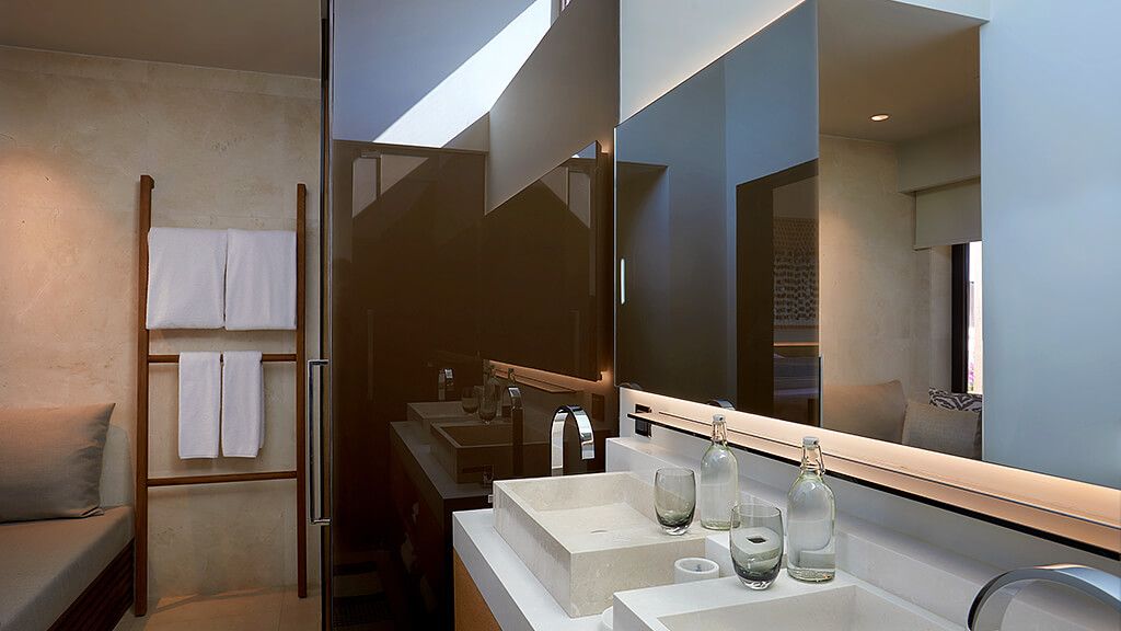 An indulgent 130-square foot (12-square meter) private pool complements the room’s generous personal space which offers one king bed and two single sofa beds for one child. Large windows open to the private pool terrace with tables and chairs. An interior stairway leads to a rooftop terrace and beautiful views of the Aegean Sea. A thoughtfully fitted walk-in closet and dressing room feature light timber finishes together with a well-stocked fridge bar while the oversize marble bathroom has a double vanity and shower.