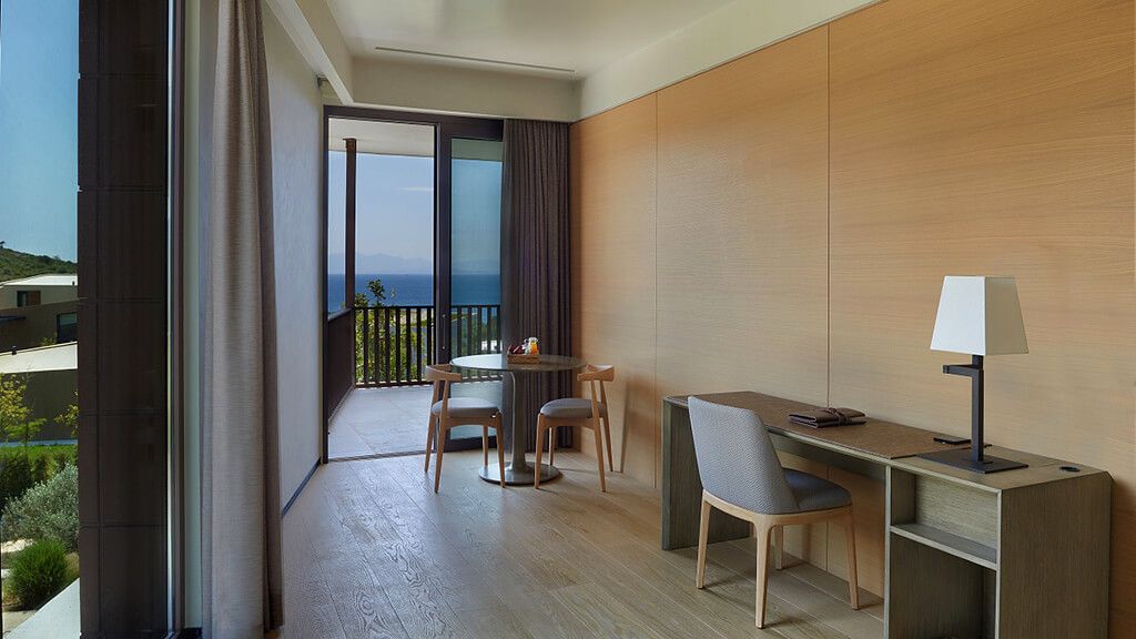 The soft-hued contemporary living area has a thoughtfully screened sleeping space with one king bed plus a cozy corner sofa, occasional table and desk. A beautifully fitted walk-in closet and dressing room feature light timber finishes together with a well-stocked fridge bar. An enchanting spot for dining and drinks in the very agreeable weather is the private balcony with wonderful views out to the Aegean Sea. The spacious marble bathroom features a luxurious soaking tub and a double vanity.