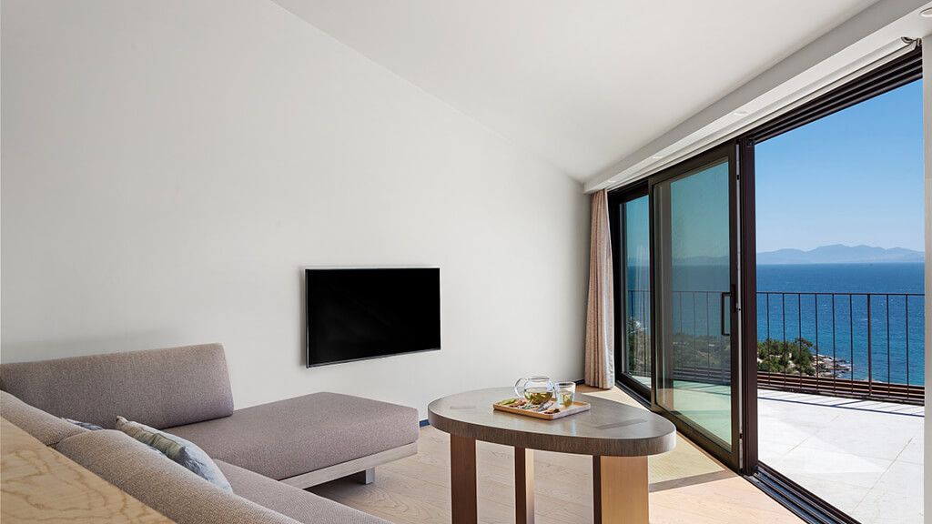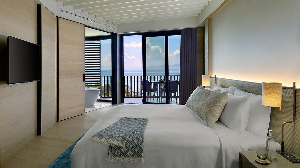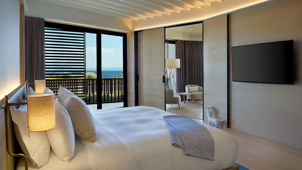 A beautifully screened sleeping space with one king-bed separates the contemporary timber-floored living area with its plumped corner sofa and occasional table, a desk plus a custom crafted walk-in closet and dressing room together with a well-stocked fridge bar. Floor-to-ceiling windows open to a private balcony with table and chairs for relaxed dining and drinks and superb views of the Aegean Sea. The spacious marble bathroom features a large decadent soaking tub, shower and a double vanity.