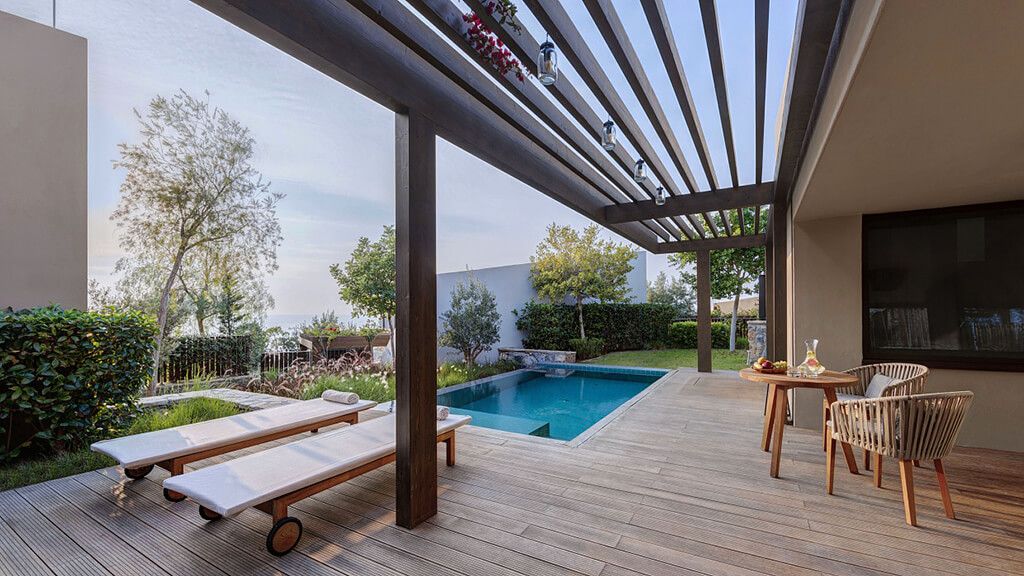 A private pool complements spectacular Aegean Sea views and personal space. Set on a hill away from the main building of Six Senses Kaplankaya, the rooms offer one king bed plus cozy seating for two and an occasional table. A beautifully fitted walk-in closet and dressing room feature light timber finishes together with a well-stocked fridge bar. An enchanting spot for dining and drinks is the pool deck with wonderful panoramas. The spacious marble bathroom features a double vanity.