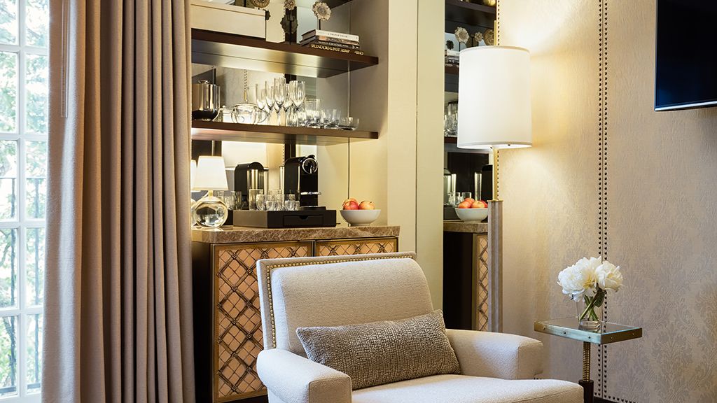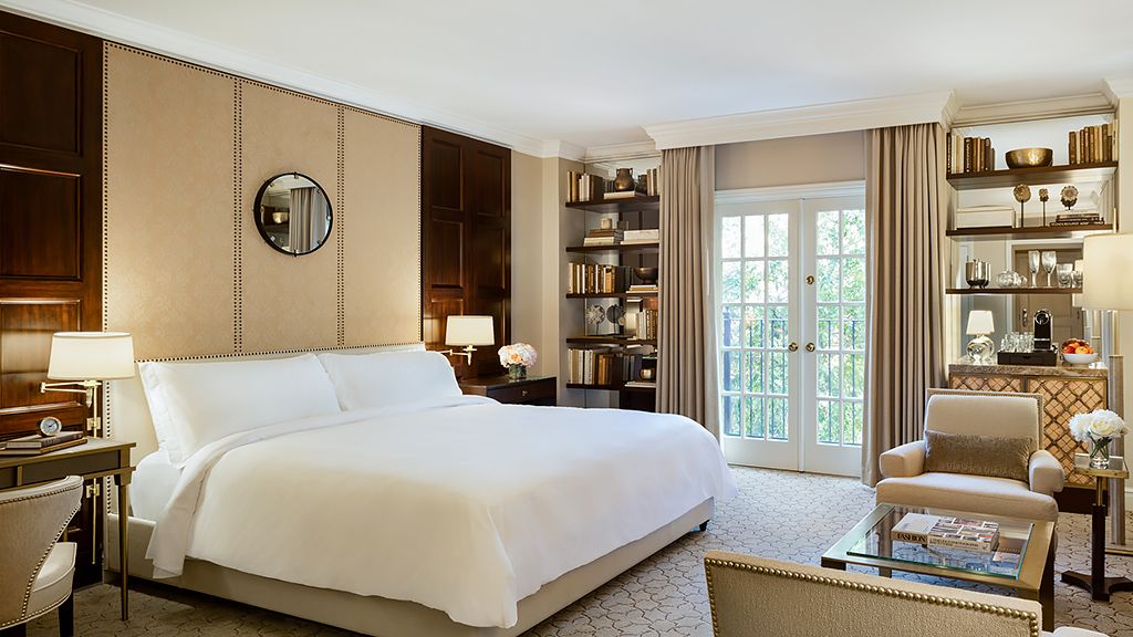 Brilliantly situated on the hotel’s top floor, the 900-square-foot mansion suite features soaring ceilings and arched palladium-styled french doors that open to petite balconies offering the most enchanting views of turtle creek’s neighborhood. Elegant mirror-paneled double doors separate the living room from the king bedroom and a guest powder room is located off the foyer. The suite’s spacious bathroom is styled with waterworks fixtures and features a dual vanity, soaking tub and oversized walk-in rain shower.