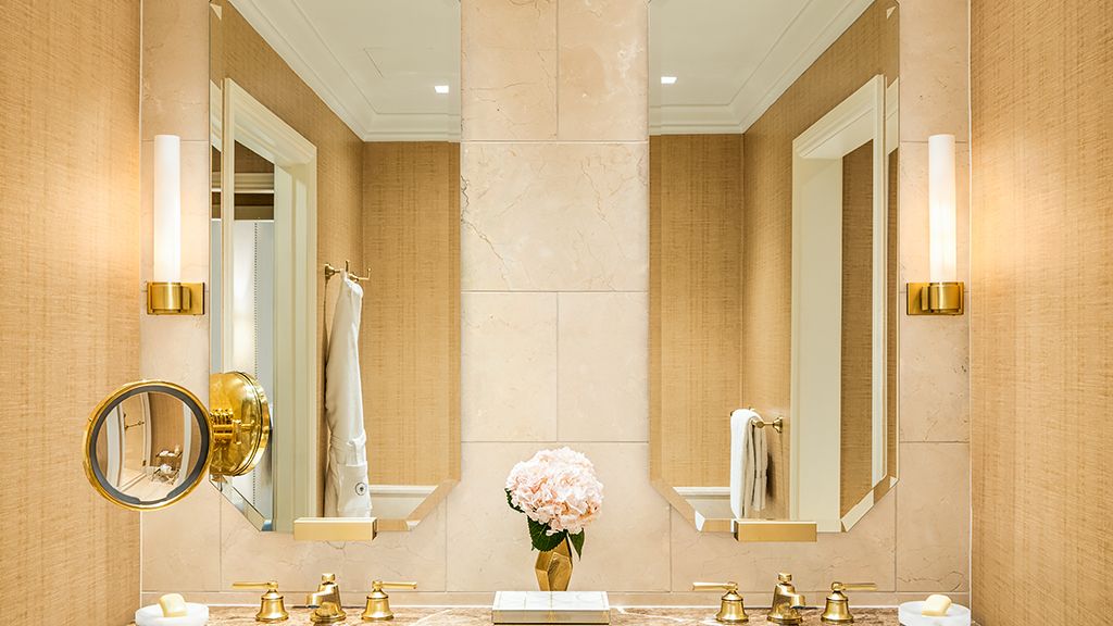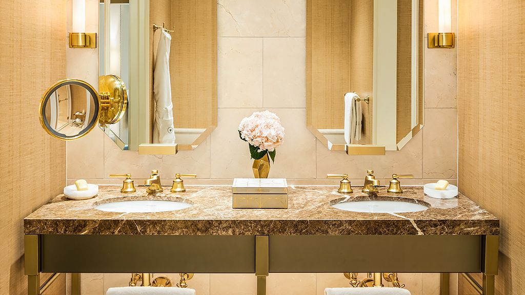 This elegant 900-square-foot, one-bedroom suite delivers absolute comfort. Separated by mirror-paneled double doors, the living room and king bedroom both open to petite balconies overlooking the mansion’s manicured lawn or courtyard. A guest powder room is located off the foyer. The suite’s spacious bathroom features a dual vanity, soaking tub and oversized walk-in rain shower.