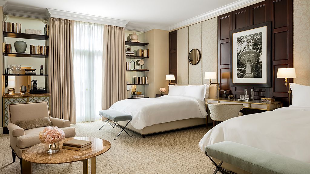 Offering 450 square feet of living space and two queen beds, this stylish room features a sitting area, writing desk and french doors that open to a petite balcony with lovely residential views. The bathroom has an over sized walk-in shower.