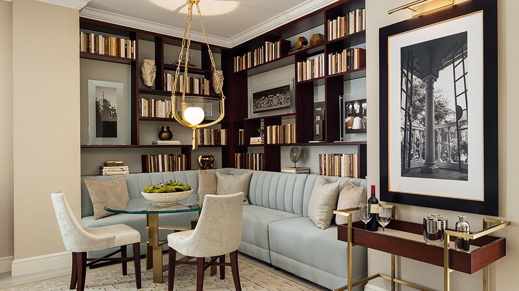 The expansive turtle creek suite provides 1, 350 square feet of impeccably designed living space. Offering the comforts of a sophisticated urban residence, the suite features an accessible entry foyer, living room, dining area, kitchenette and guest powder room. A king bedroom is located beyond elegant mirror-paneled double doors. Styled with waterworks fixtures, the spacious bathroom features a dual vanity, grab bars and a roll-in shower. The suite can connect to a premier room to create a two-bedroom apartment-style accommodation encompassing 1, 800 square feet.
