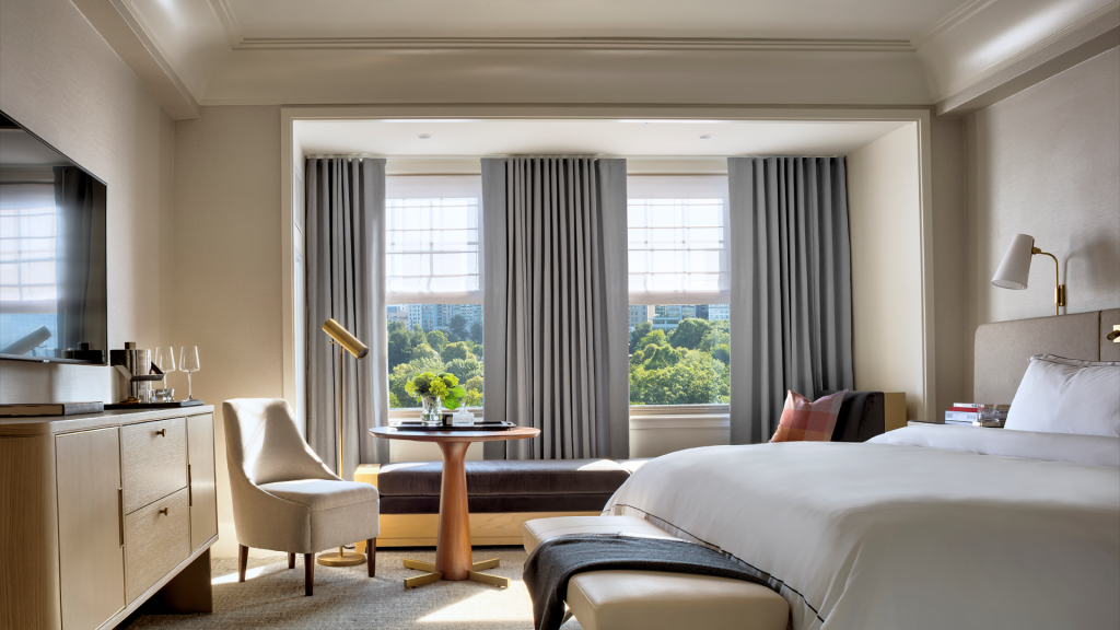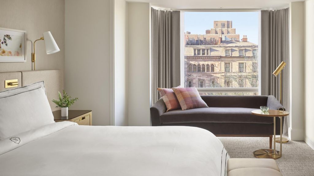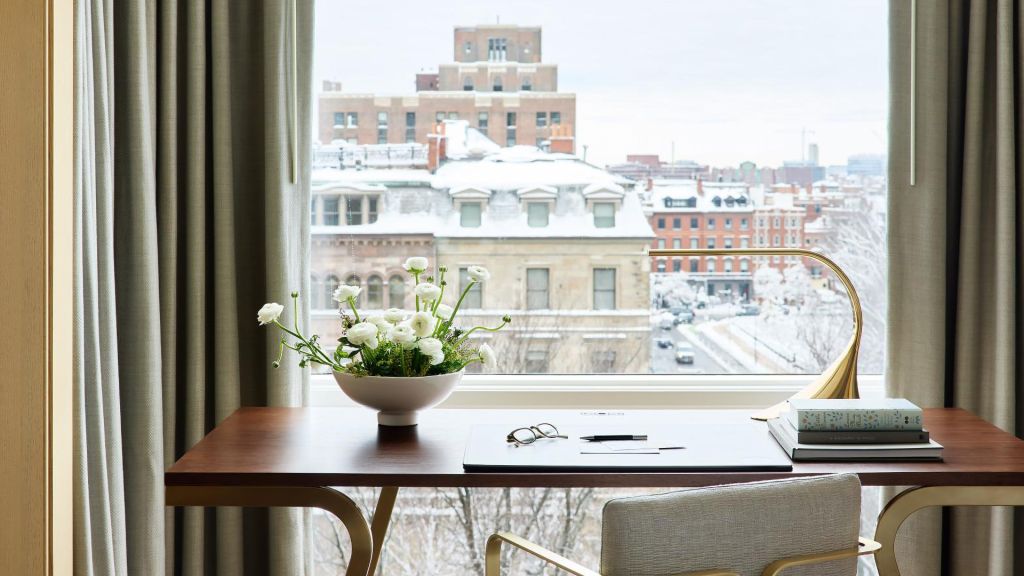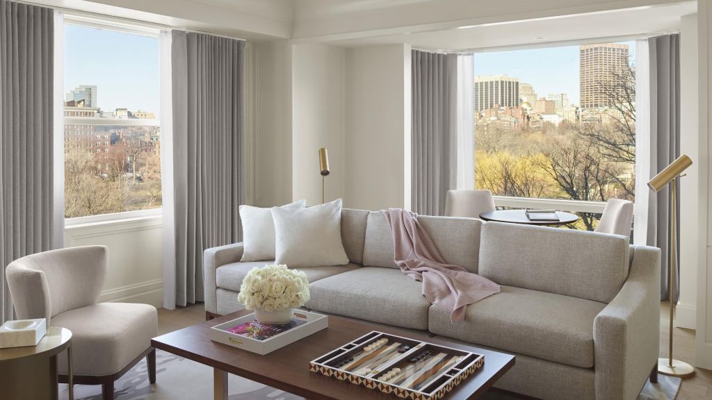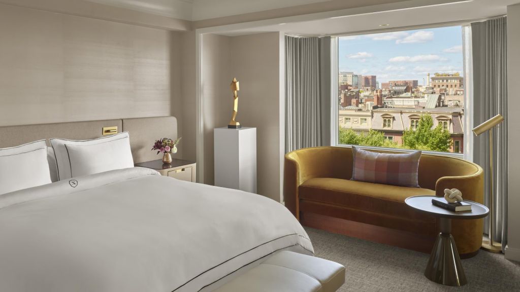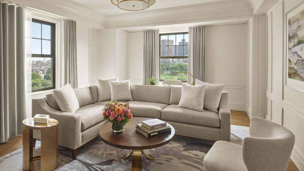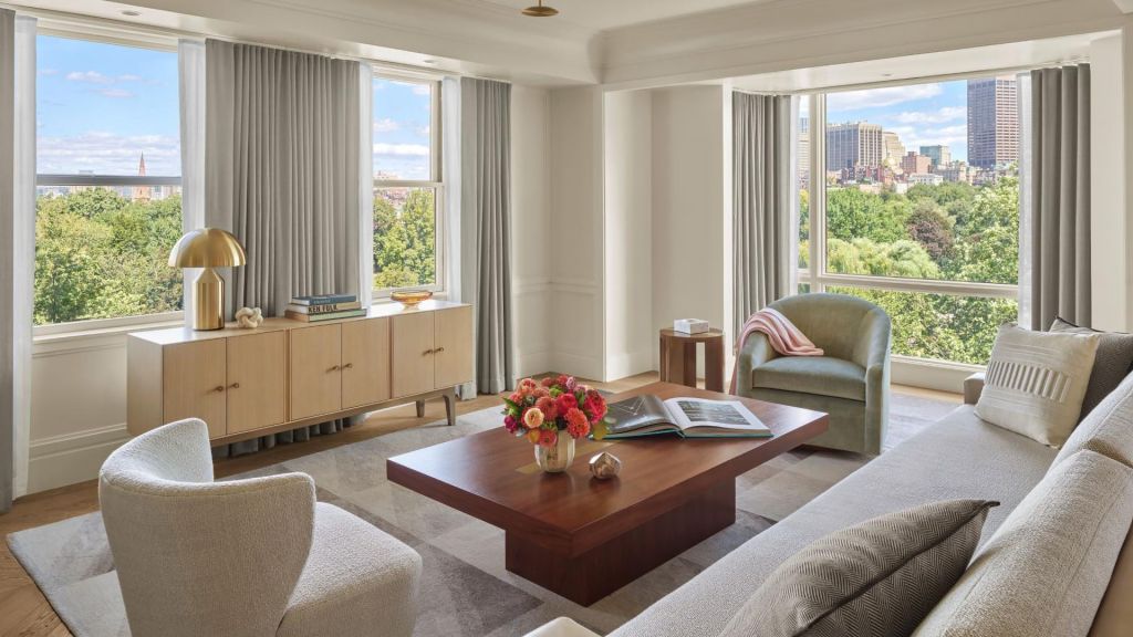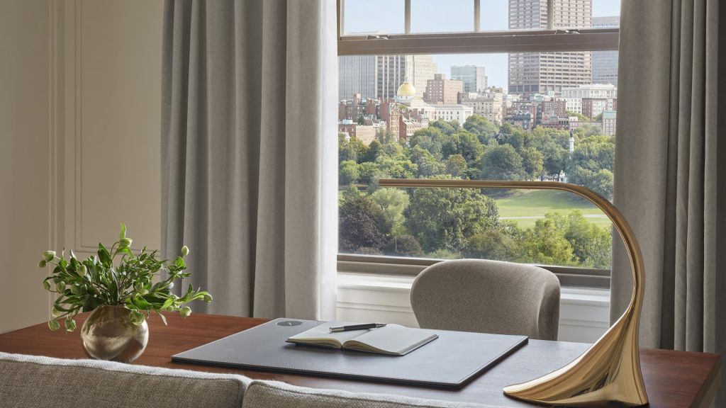 Rooms and suites invite lingering mornings and easy evenings. Interiors are defined by warm woods, custom furnishings, original artwork, and marble finishes that echo the city’s aesthetic. Views frame either the leafy expanse of the Public Garden or the rhythm of Back Bay streets. Spacious layouts include plush king beds, velvet chaise lounges, and rainforest showers—each detail calibrated for comfort.