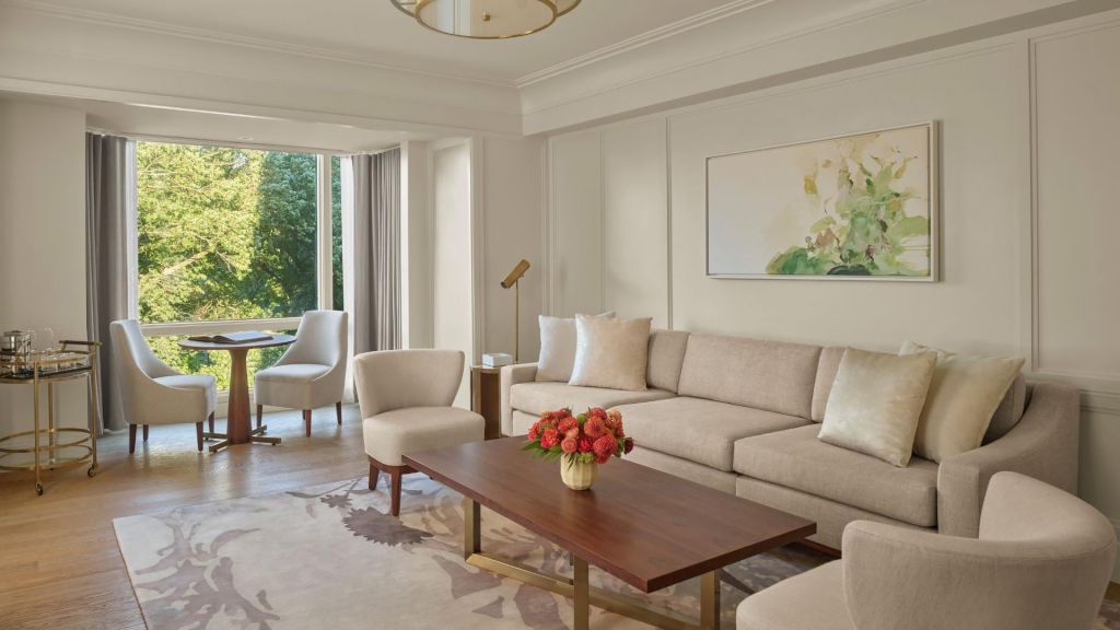 Classic corner park view suite 705-768 sqf 65sqm-king- fireplace- living room one-bedroom corner suites -views of public garden king bed library and gym access wood-burning fireplaces separate living area. Preferred seating at the street bar