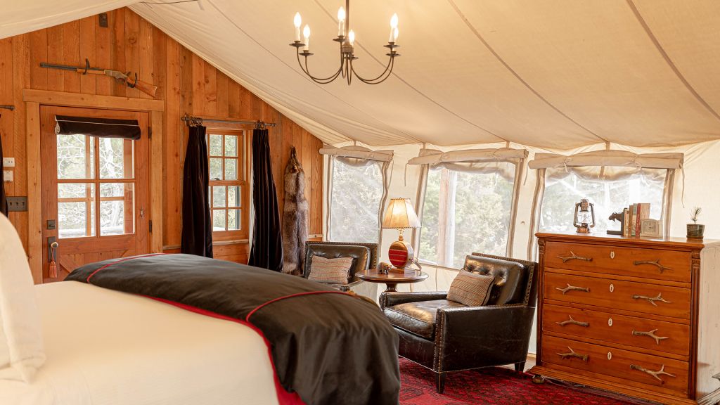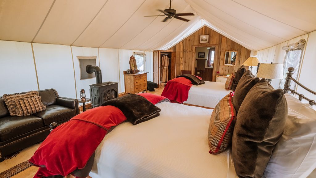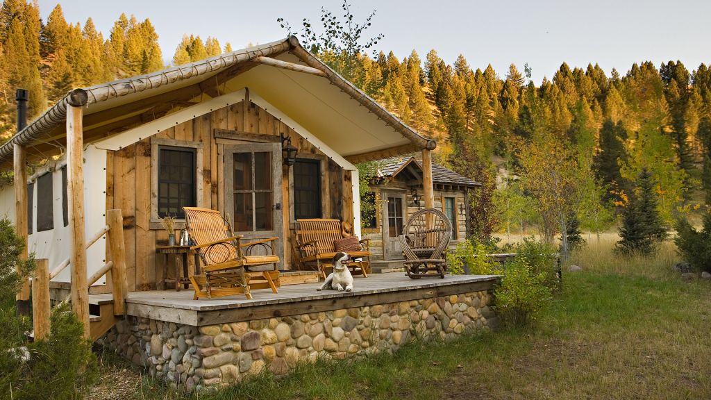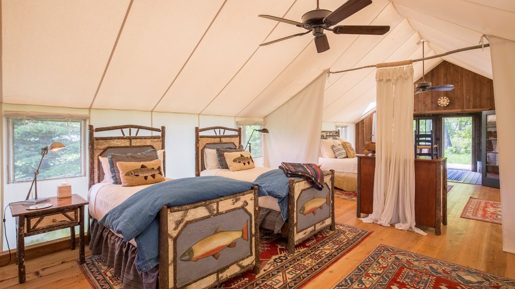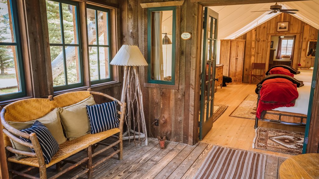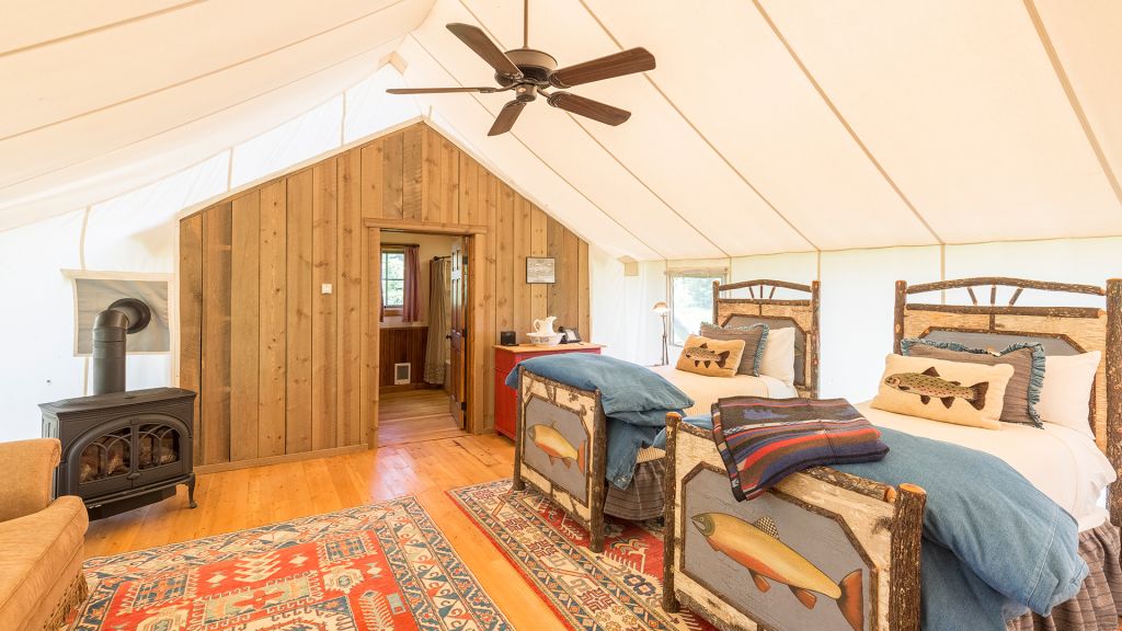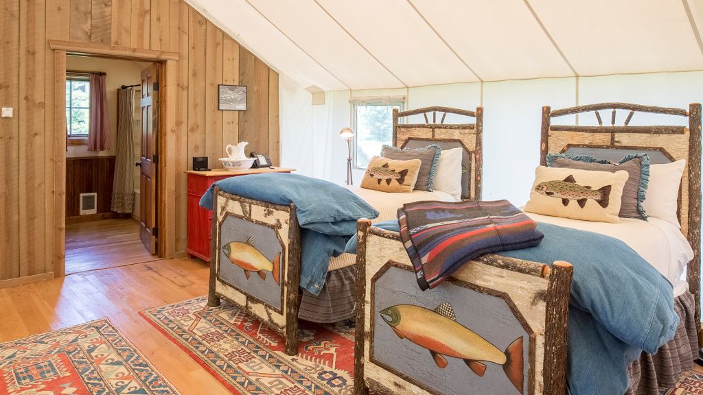 2 bedrooms separated by canvas room divider – 1 king bed and 2 twin beds – 97sqm / 1047sqft – sitting area – dining table – screened in porch– twin day bed on porch – the cabins are distinctly furnished in a rustic camp style – view of rock creek – featuring private en-suite bathrooms with shower over bath – hairdryer – bathrobes – slippers – montana amenities – complimentary wi-fi – telephone – mini fridge – safe deposit box – 6 persons maximum