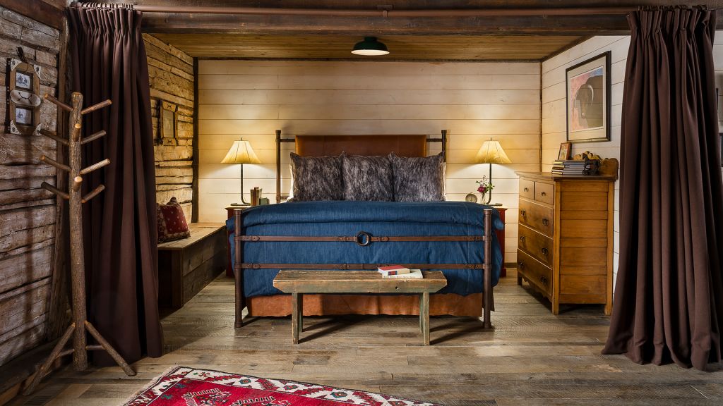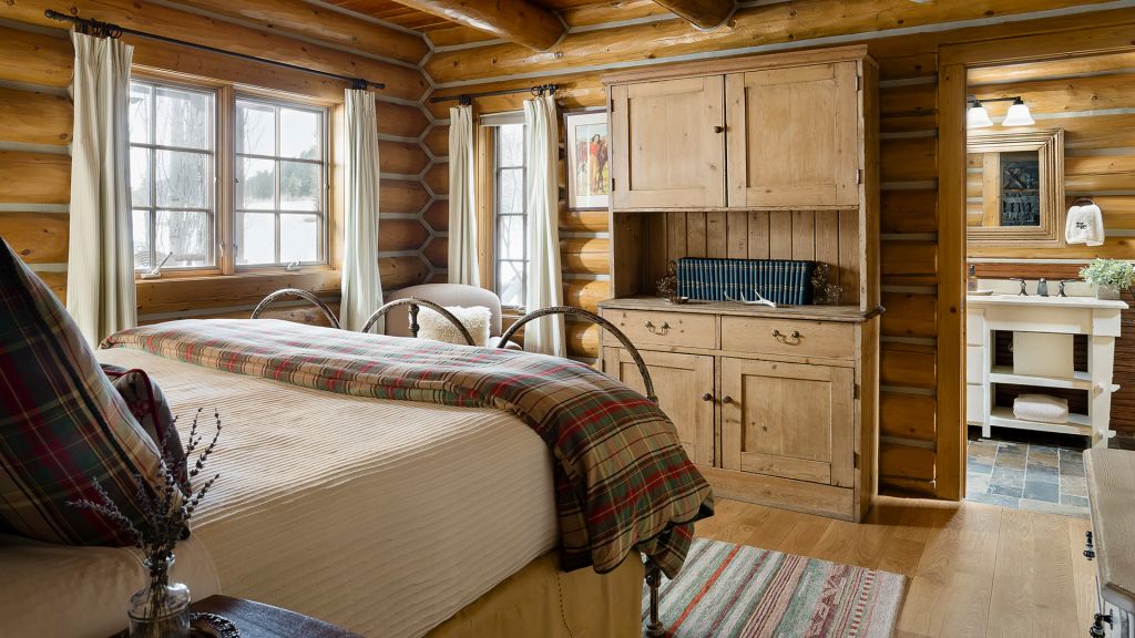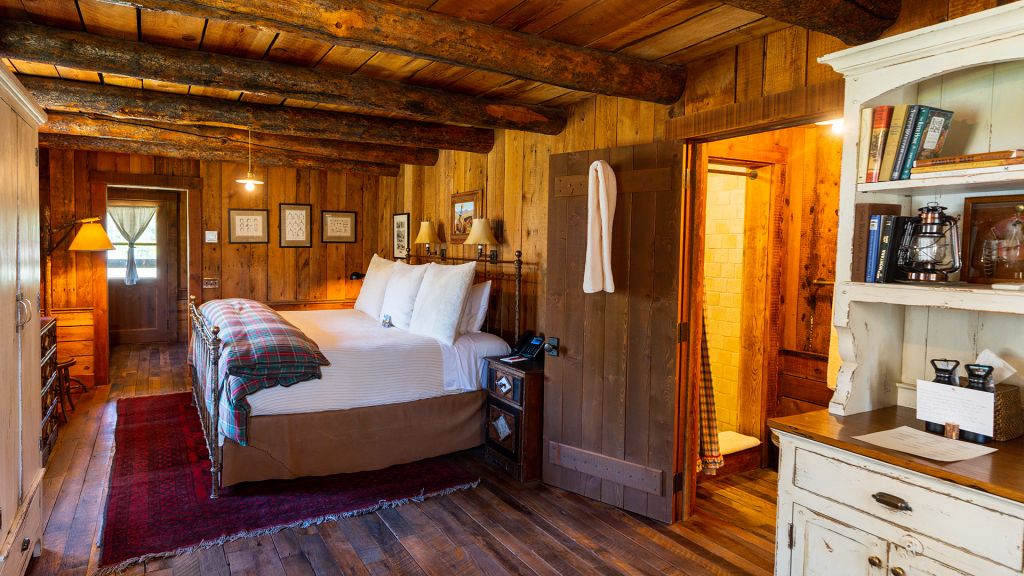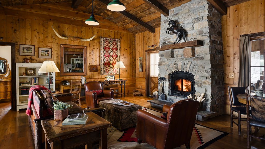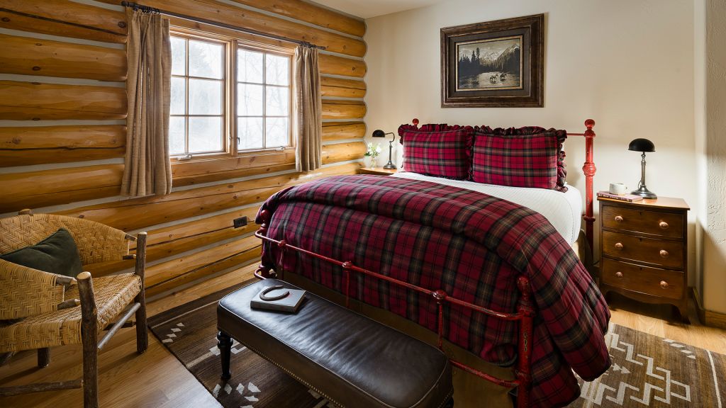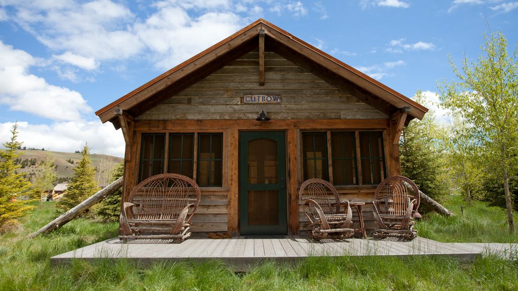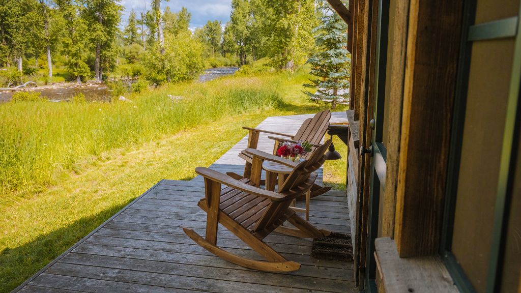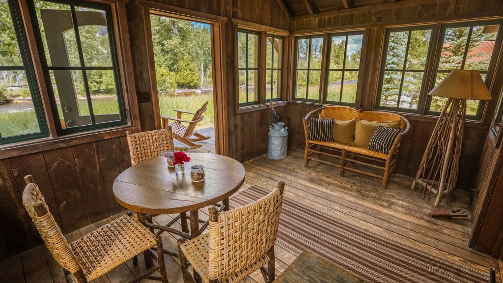 1 king bed & 1 queen pull-out sofa or 2 queen beds - 59sqm / 630sqft – sitting area with gas burning stove – dining table – screened in porch and a deck facing the creek – spacious bedroom featuring luxurious bedding – western textiles and antique furniture – rustic camp style – view of rock creek – en-suite bathroom with a shower over bath – hairdryer – bathrobes – slippers – montana amenities – complimentary wi-fi – telephone – mini fridge – safe deposit box – 4 persons maximum