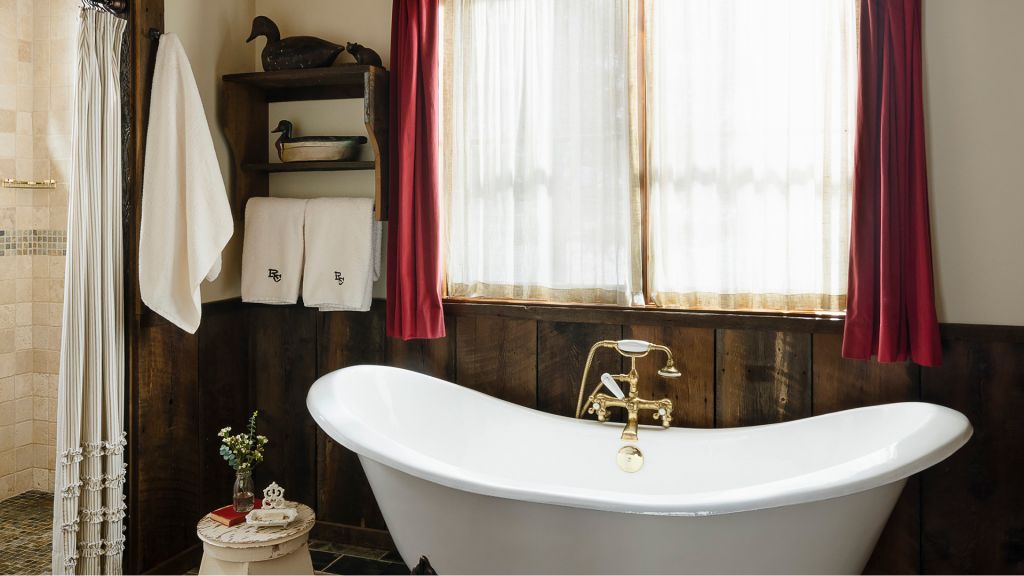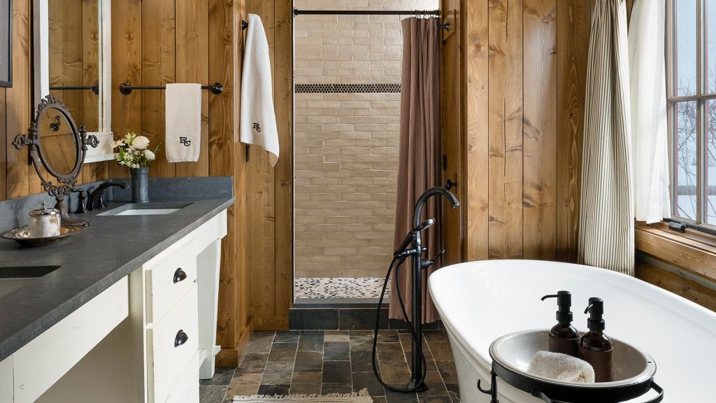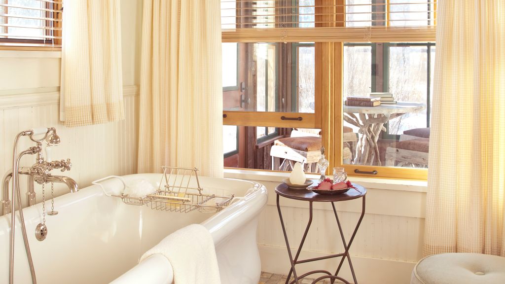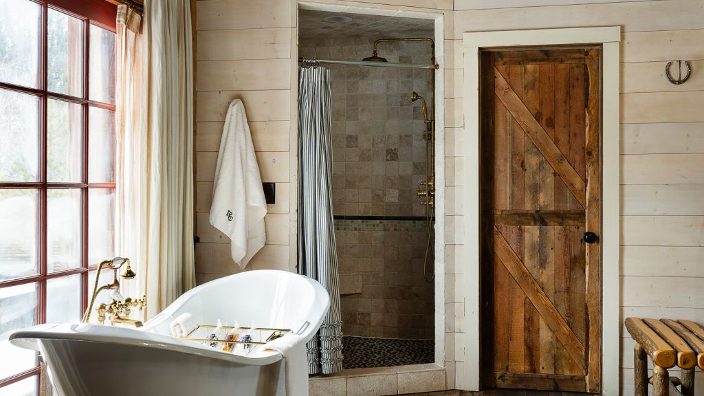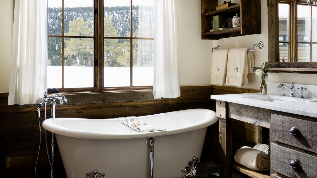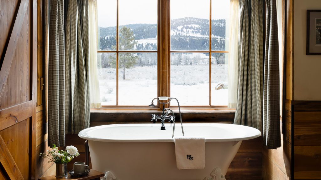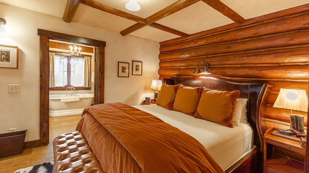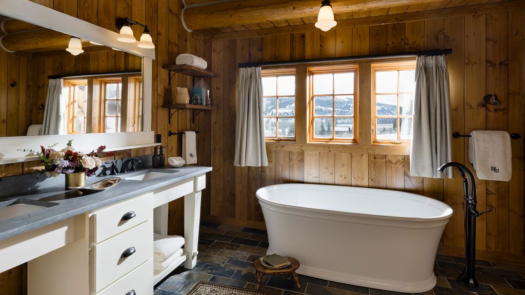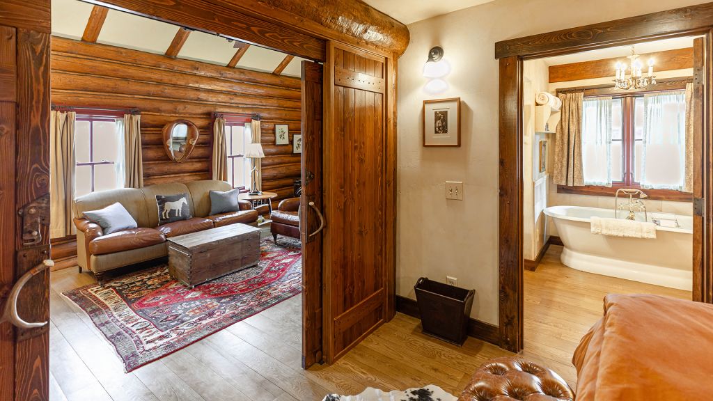 Features a king bed, eight-person cedar private sauna, heated enclosed porch, views of Rock Creek, en-suite bathroom with clawfoot bathtub and separate rain shower, hair dryer, bathrobes, slippers, Montana amenities, WiFi, TV, minibar, and safe. Located in the Creekside Cabin.