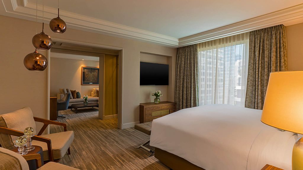 Soak in the sights from high above this stunning South American city at the majestic Ritz-Carlton, Santiago in Chile.
