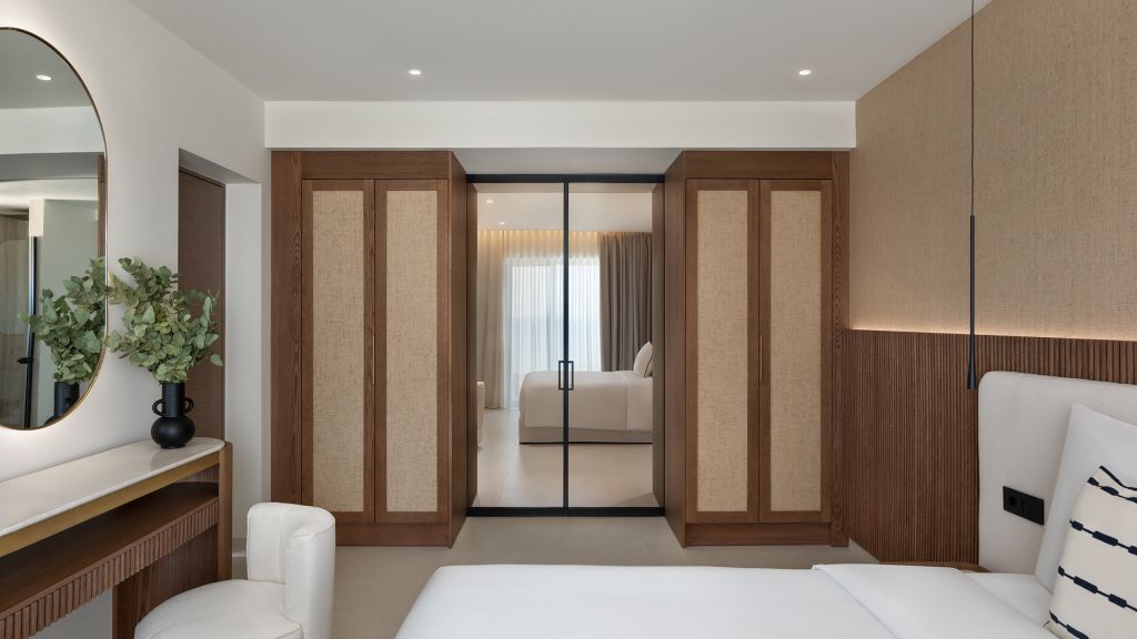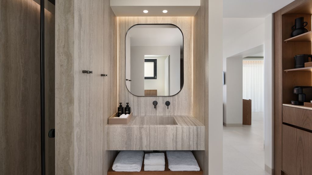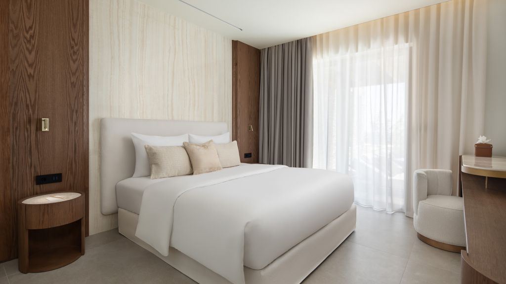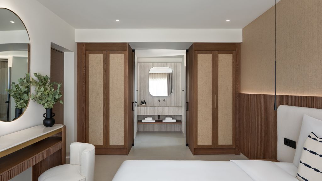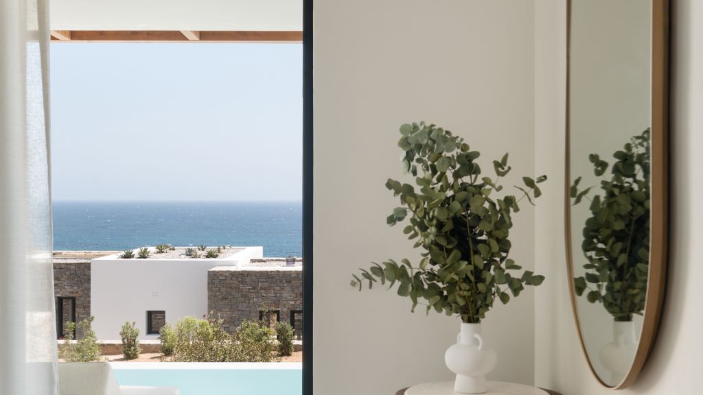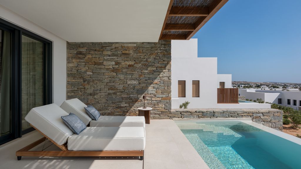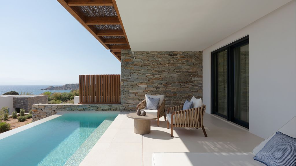 Suites are designed with a contemporary Cycladic sensibility with muted palettes, natural textures, and interiors that prioritize space and light over ornament. Large openings draw the outdoors inward, allowing the shifting colors of the Aegean to become part of the room itself. Many accommodations include private pools, reinforcing the sense of privacy that defines the stay.