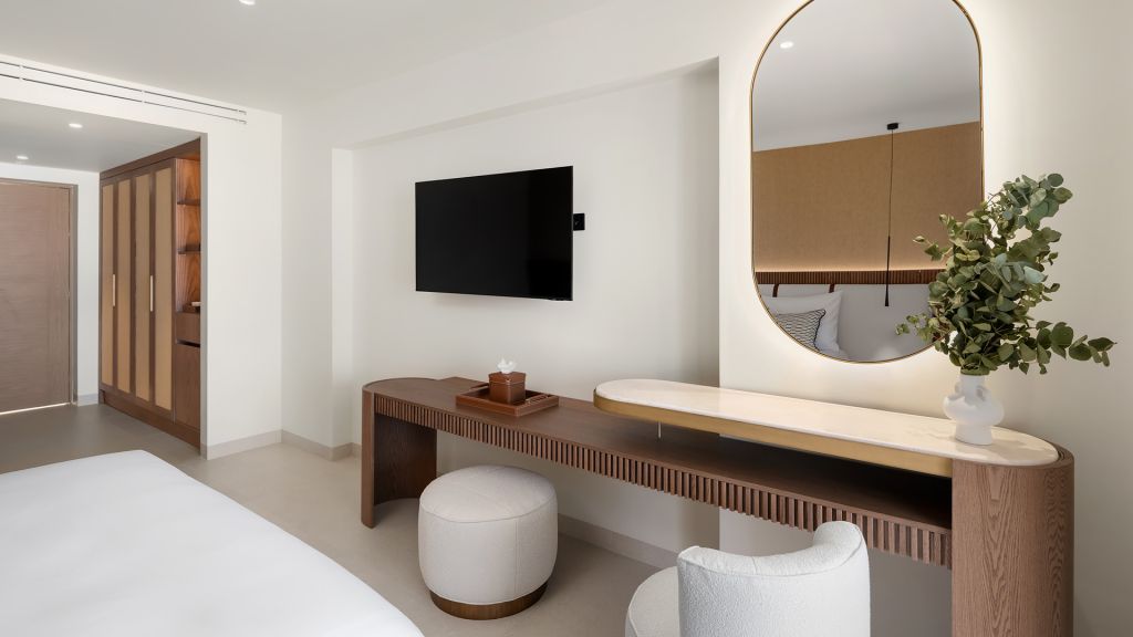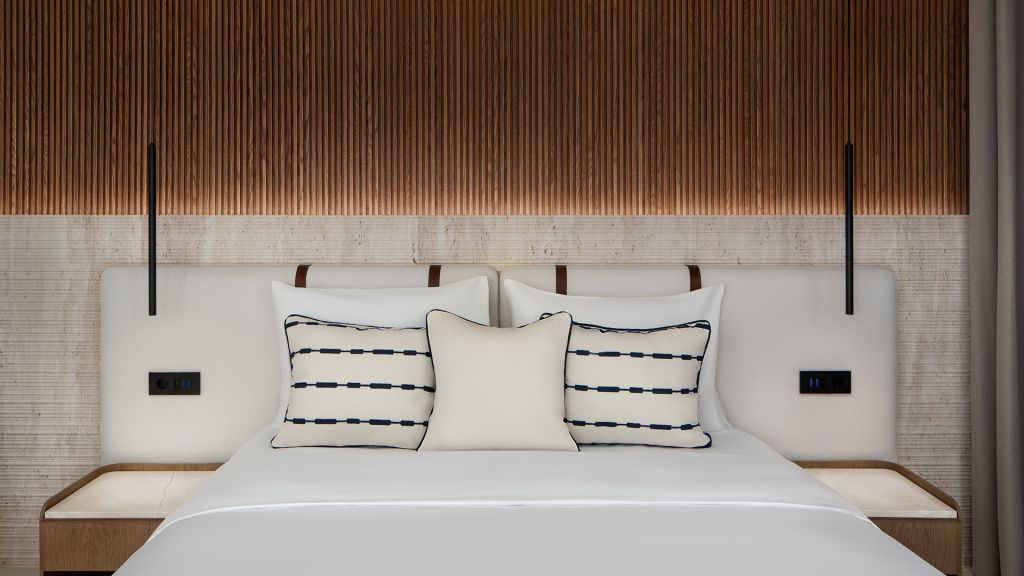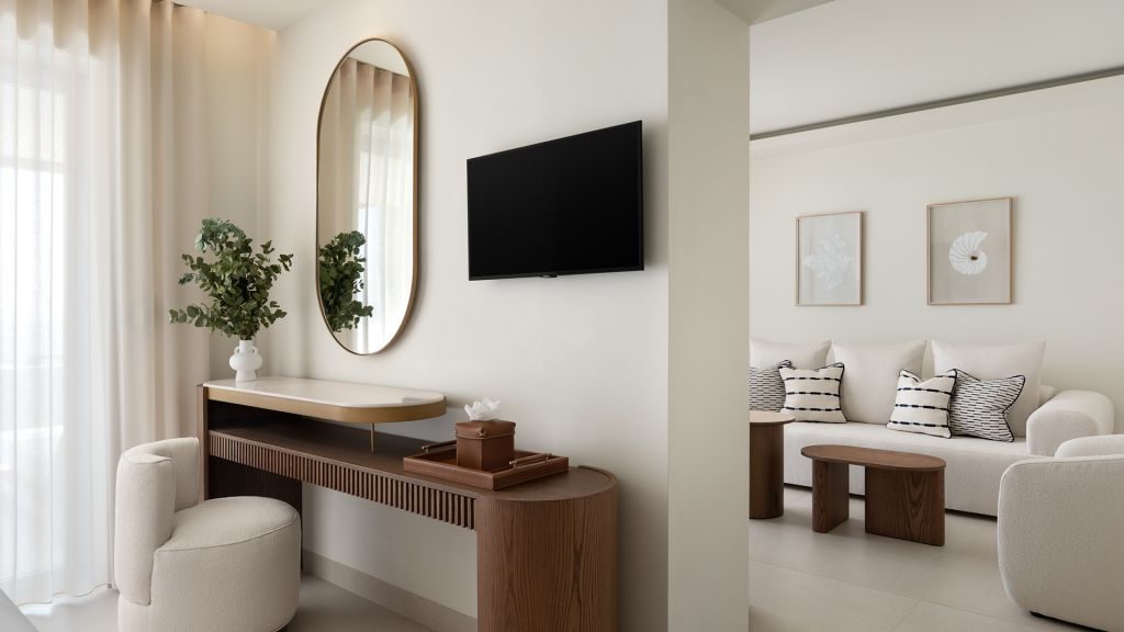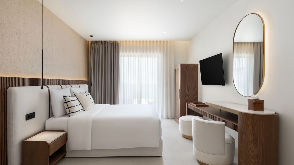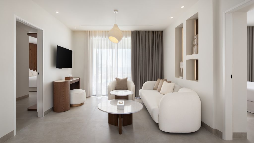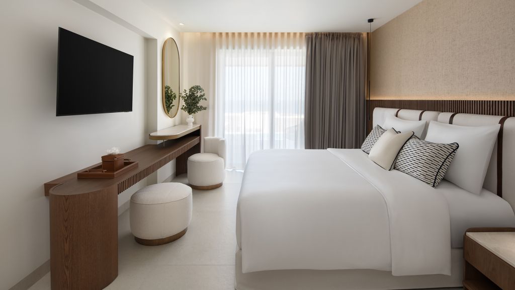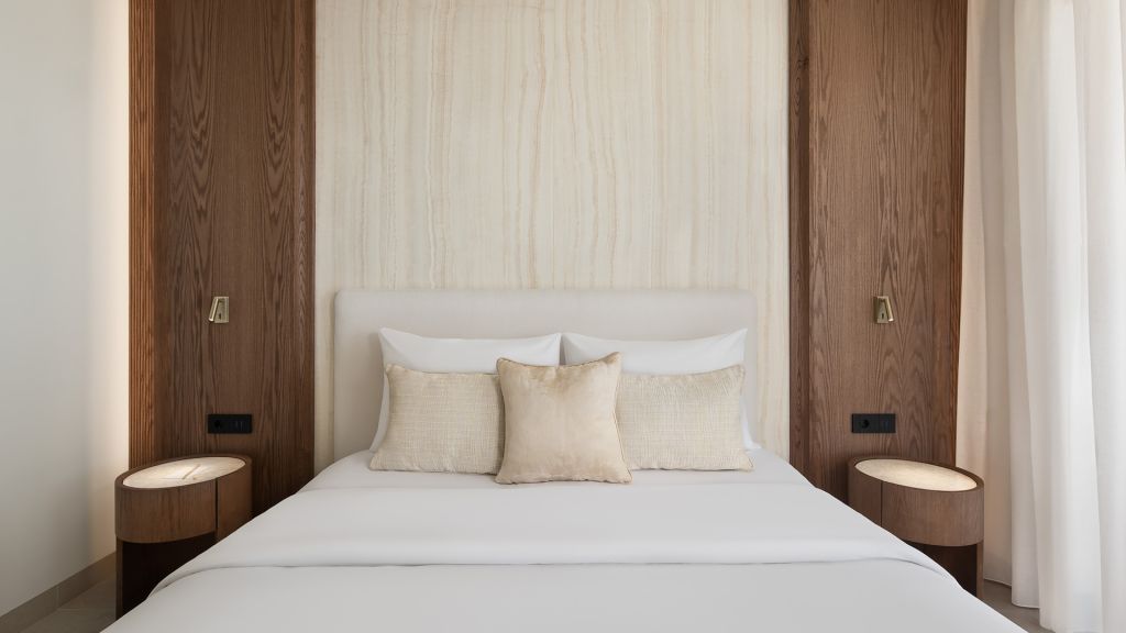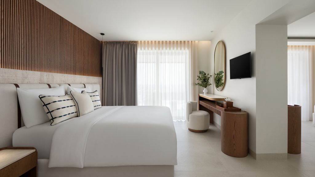 Suites are designed with a contemporary Cycladic sensibility with muted palettes, natural textures, and interiors that prioritize space and light over ornament. Large openings draw the outdoors inward, allowing the shifting colors of the Aegean to become part of the room itself. Many accommodations include private pools, reinforcing the sense of privacy that defines the stay.