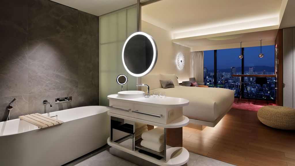 The hotel offers a range of accommodations that reflect the vibrant energy of Osaka. Floor-to-ceiling windows frame postcard-perfect views of the city's skyline, while spacious rooms feature modern touches, including neon lights and MixBar counters that embody the dynamic spirit of the city. In the bathrooms, rain showers and deep soaking bathtubs provide the perfect space to unwind after a busy day, offering an oasis of comfort amid the city’s bustling pace.