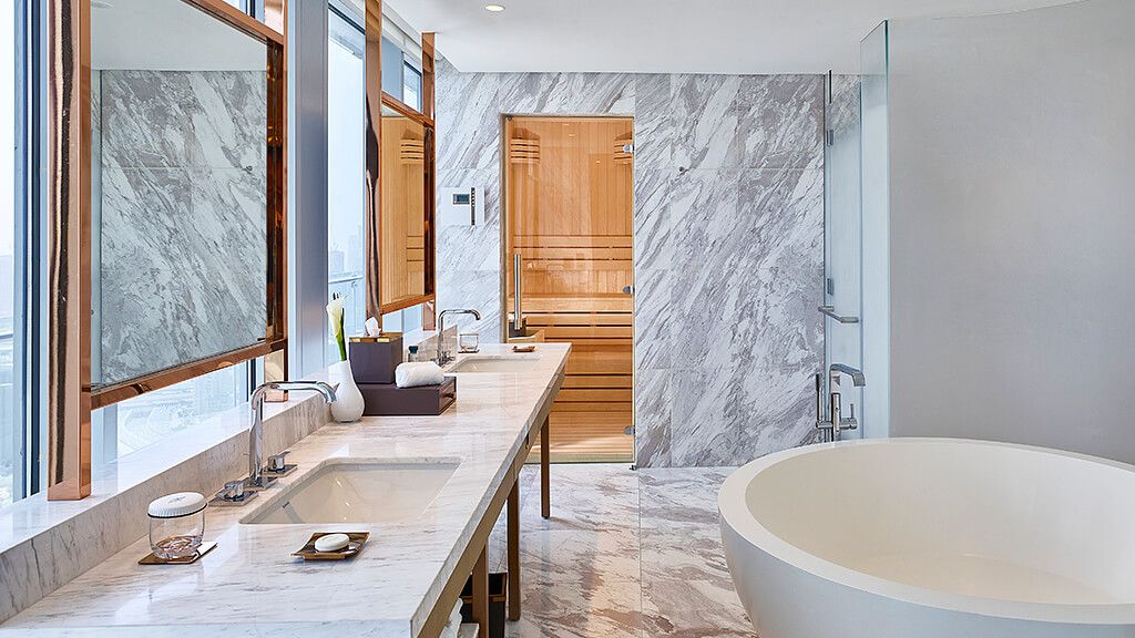 Believe it or not, Dubai’s second Waldorf Astoria hotel is located on Happiness Street in the International Financial Centre. This special hotel occupies the 18th to 55th floors of the Burj Daman, a striking skyscraper that’s as impressive on the outside as it is on the inside. The Mad Men comparison in our introduction may have seemed out of left field, but the iconic TV show inspired much of this hotel’s art and décor, mixing marble, ebony, brass and bronze to nail a mid-century New York aesthetic.
