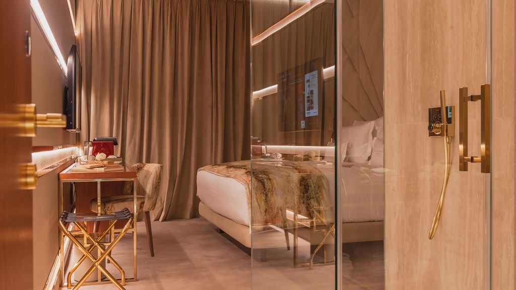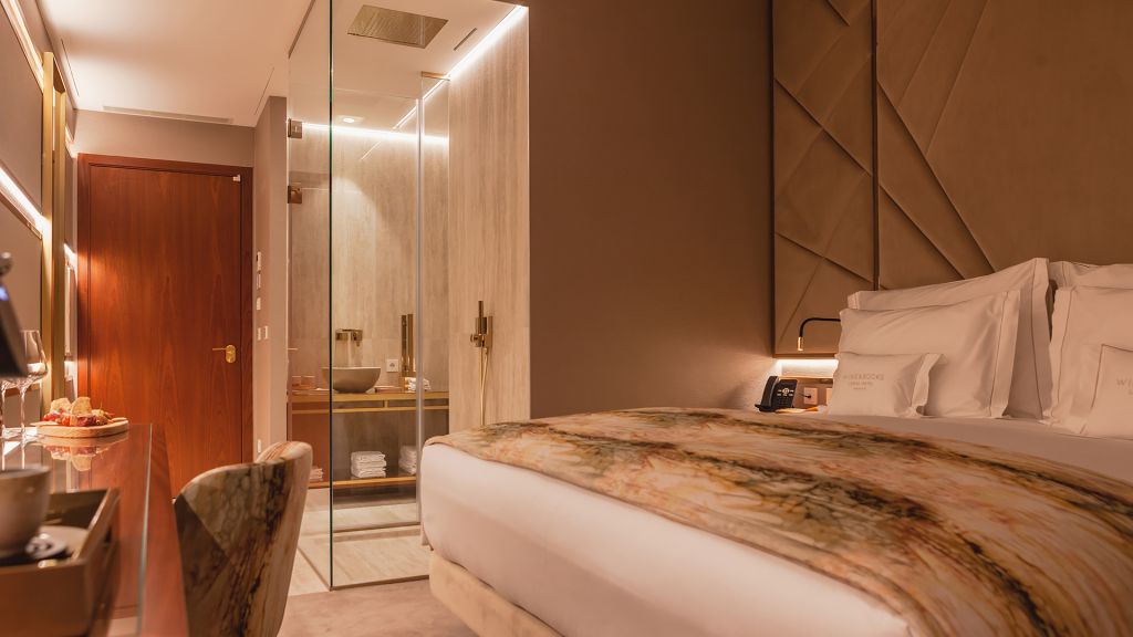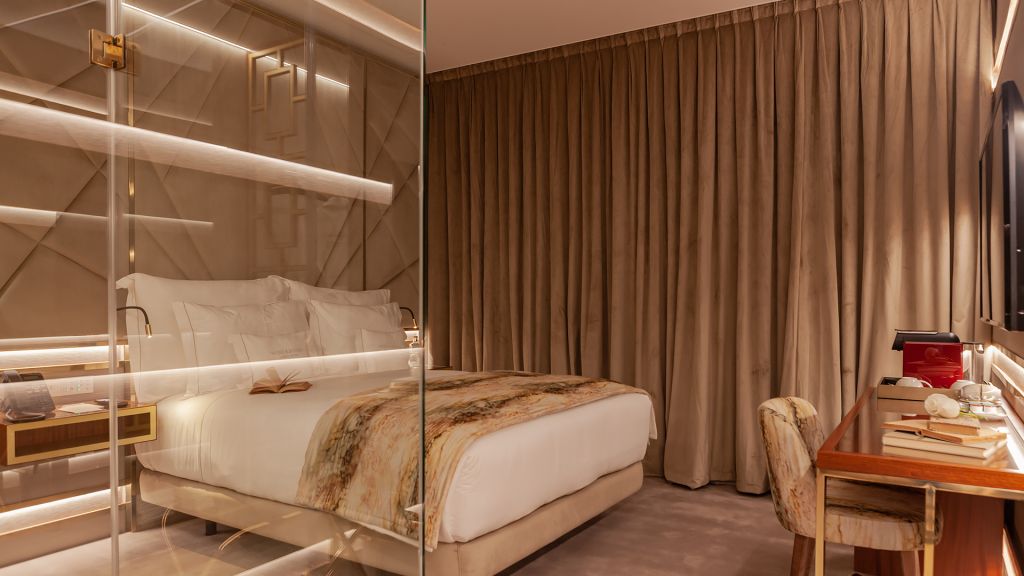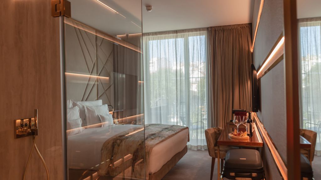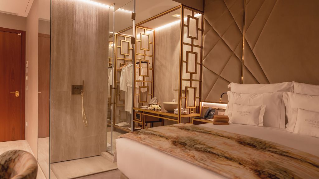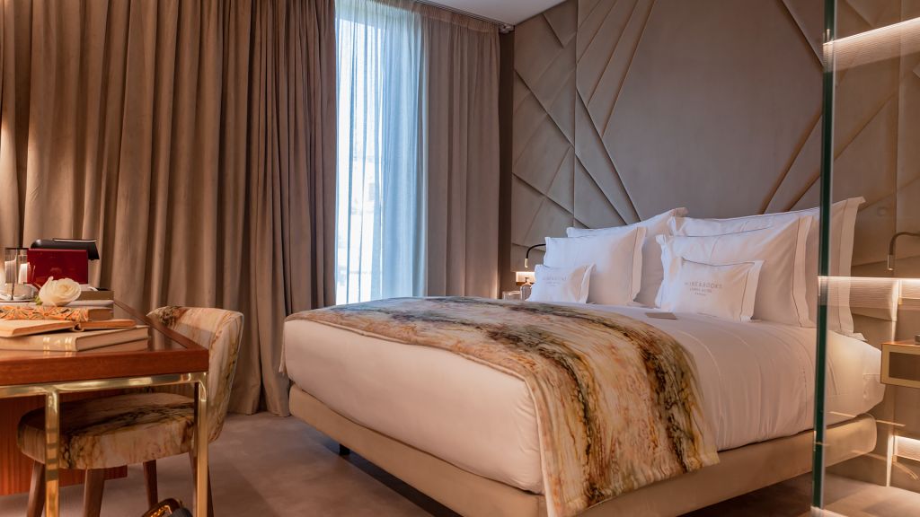 The hotel offers 24 rooms, each a study in refined simplicity. Standard rooms look toward the tiled Ajuda neighborhood, Superior rooms open onto the façade of Memória Church, and Deluxe and Premium categories add balconies for private views of Lisbon’s sunlit skyline.