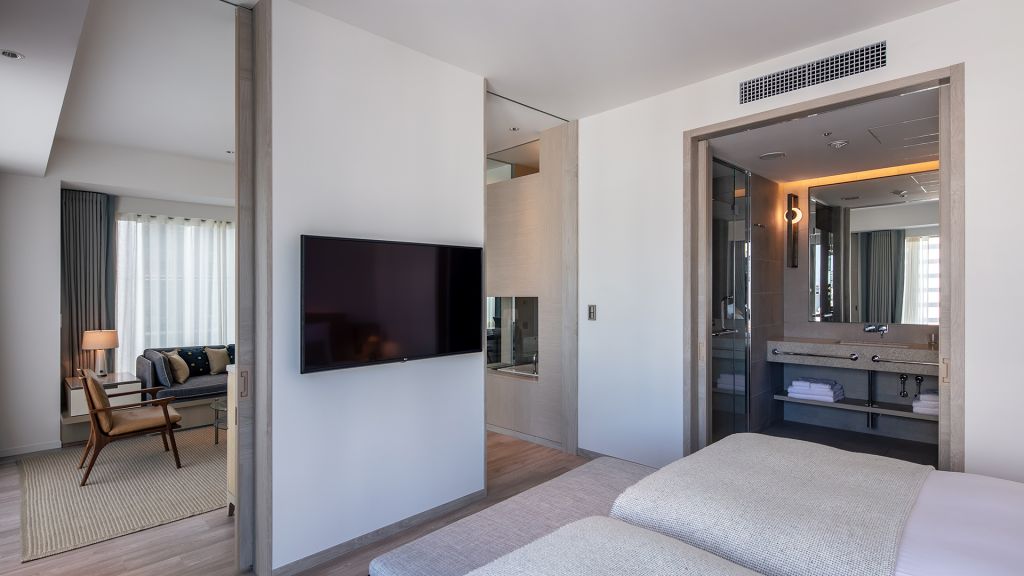 Corner Studio and adjoining Studio room can be configured into a two-bedroom unit via an exterior door that can be secured to create one combined living space. With a modern look and a prime location, Corner Studios feature an abundance of natural light and added space in which to work and play. - 32sqm (345sqft) and 25sqm(270sqft) - 2 twin beds + 1 king bed - Separate seating area - 49" 4K TV with Apple TV 4K - Rain shower - Separate soaking tub - Hairdryer - Kettle - Complimentary instant coffee & tea - Complimentary mineral water - Slippers - Sleepwear (pajamas) - Safety box - Complimentary WiFi