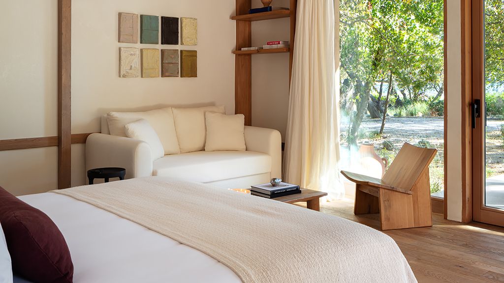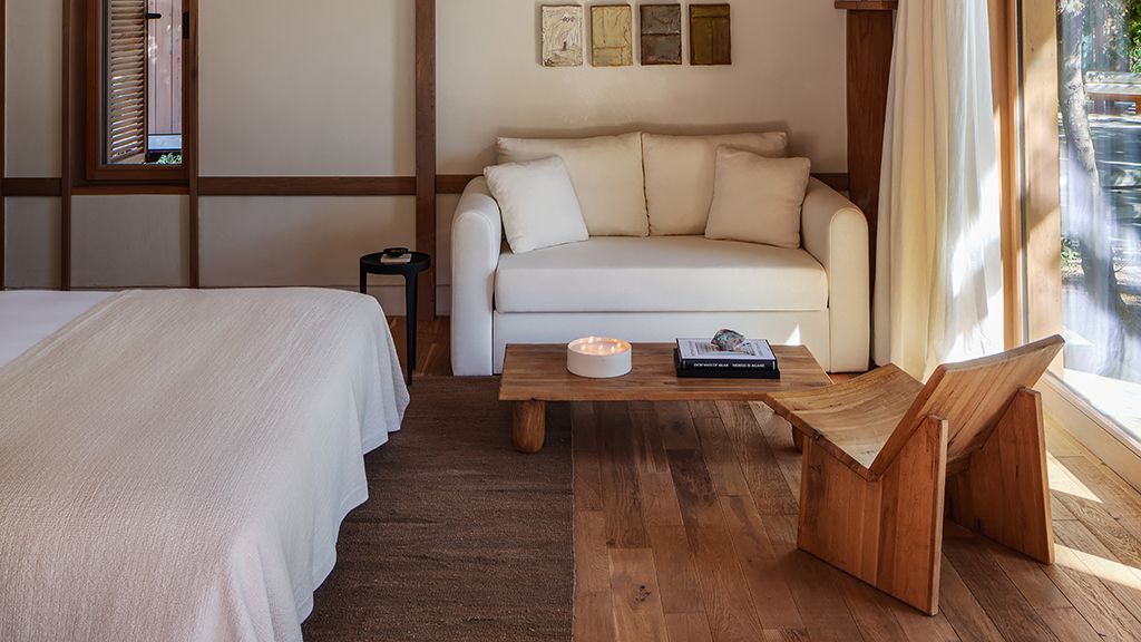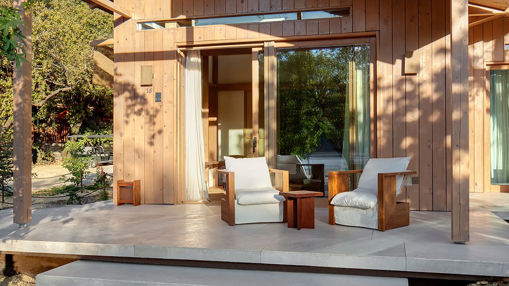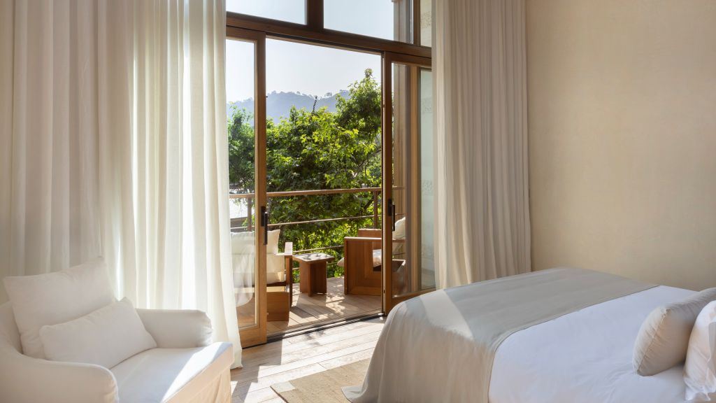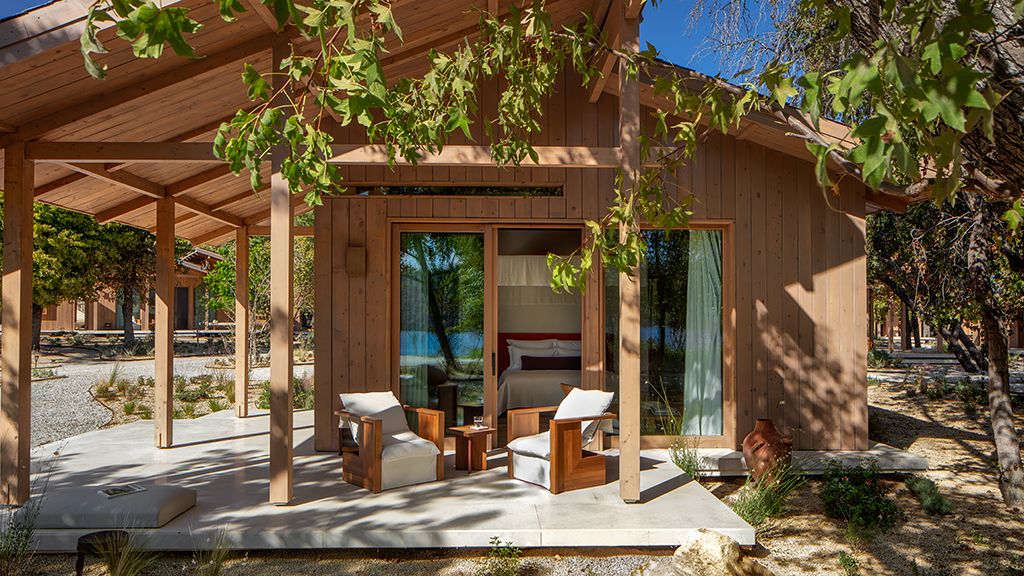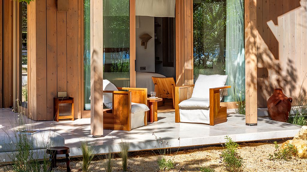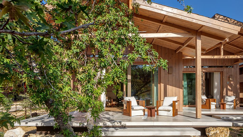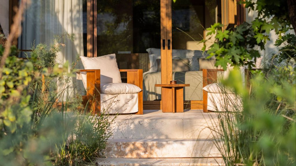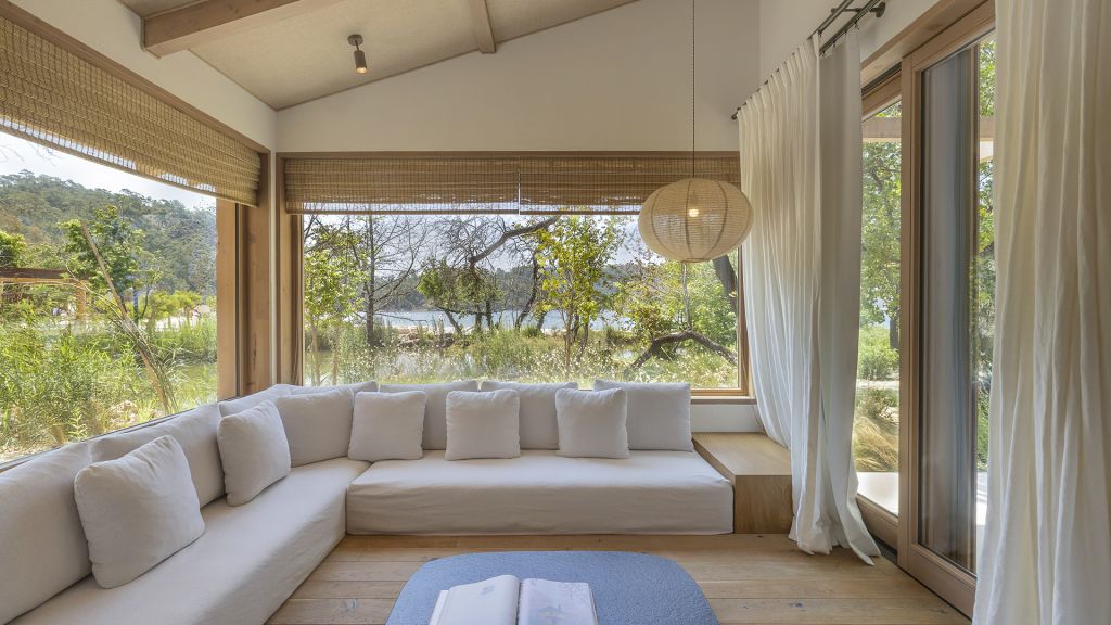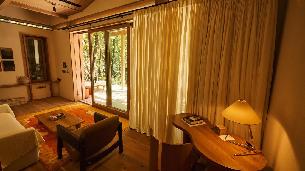 The cabana features a private terrace, two bedrooms with ensuite bathrooms, queen or twin bed, living room, fireplace, minibar, shower, coffee and tea setup, safe. The interiors are inspired by the light and airy essence of the Mediterranean, overlooking the forest.