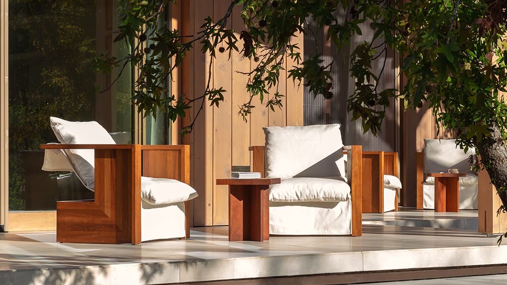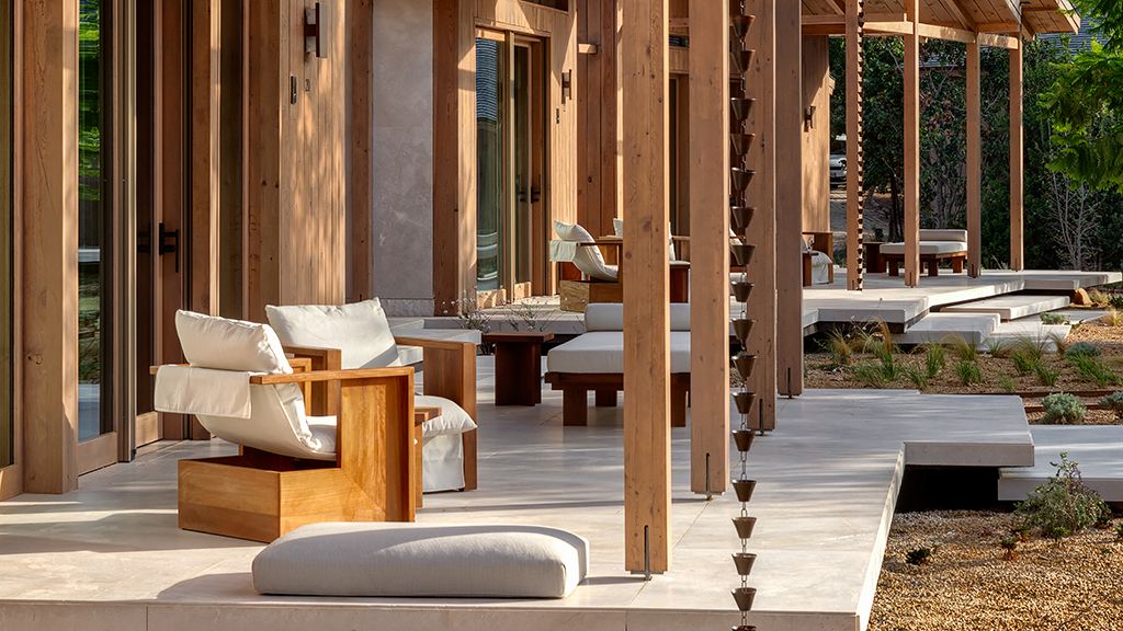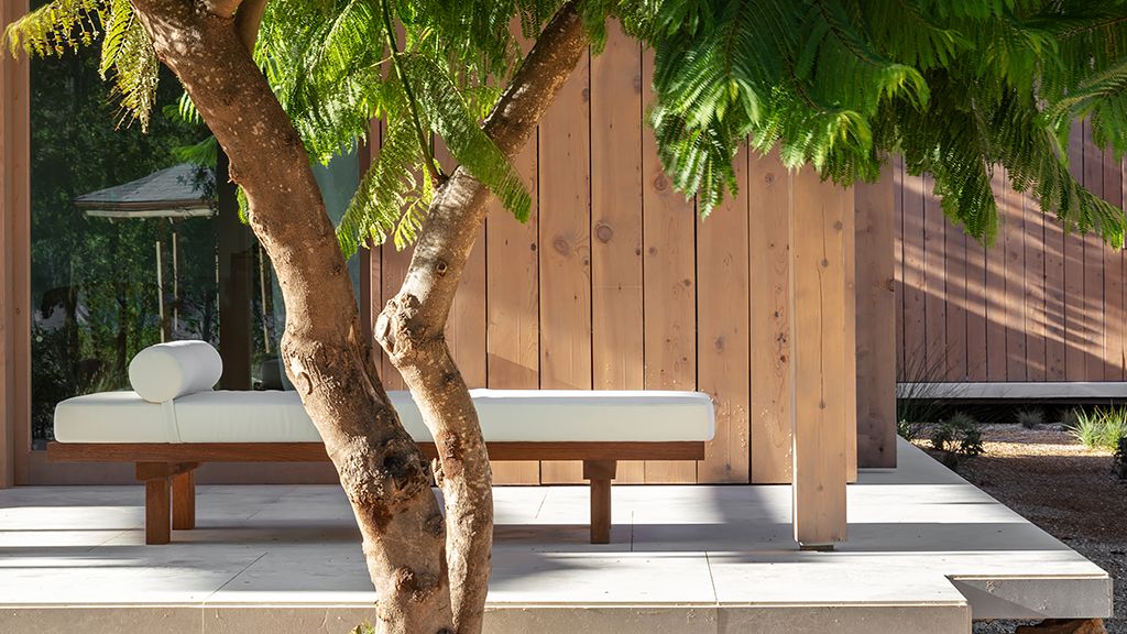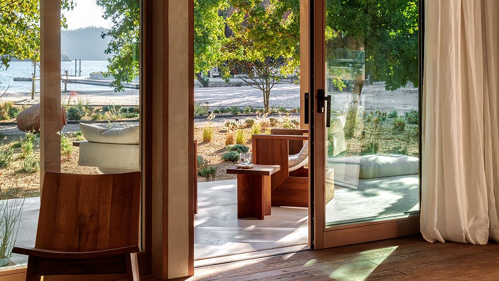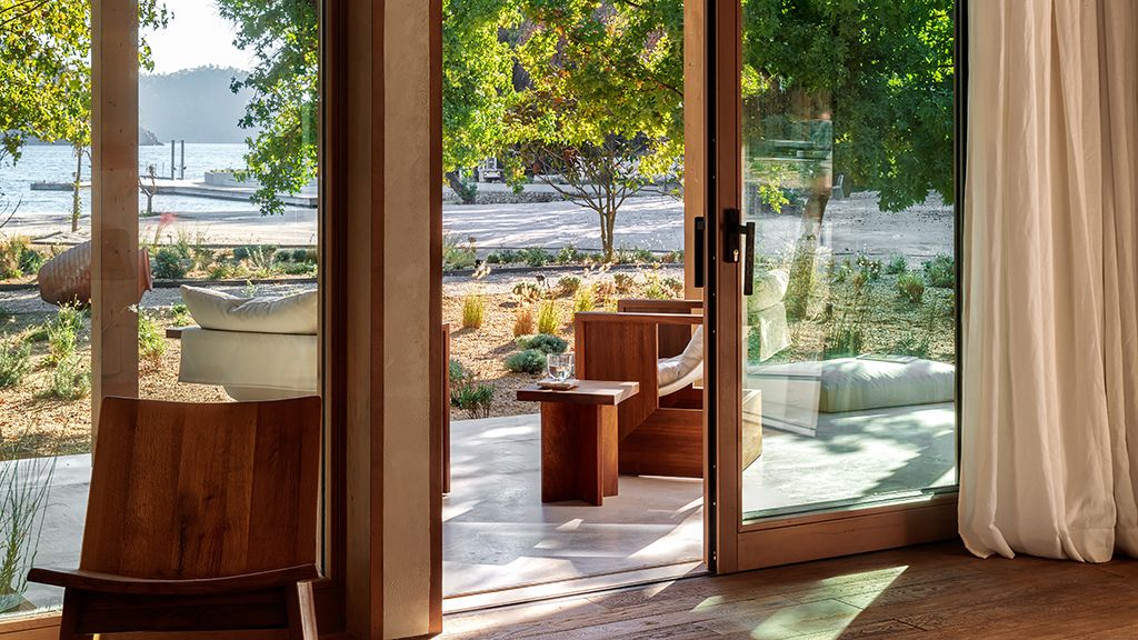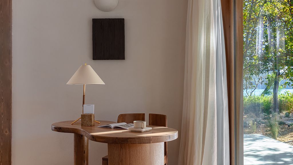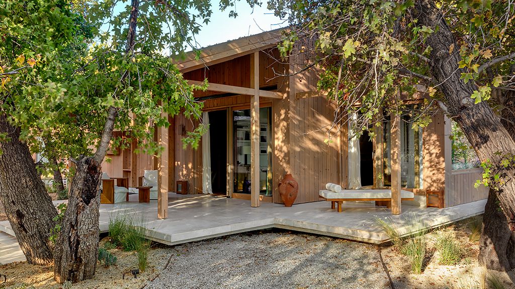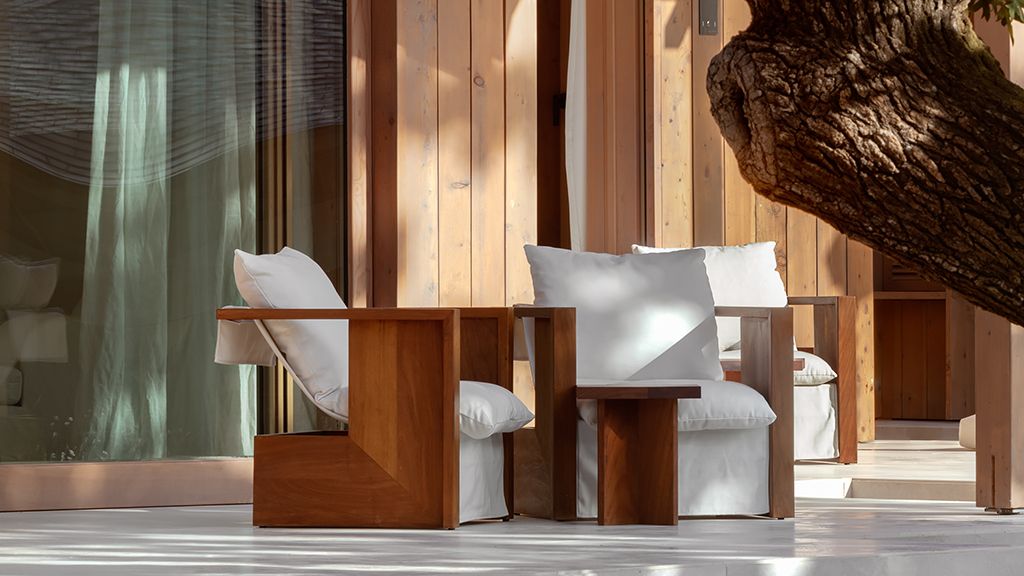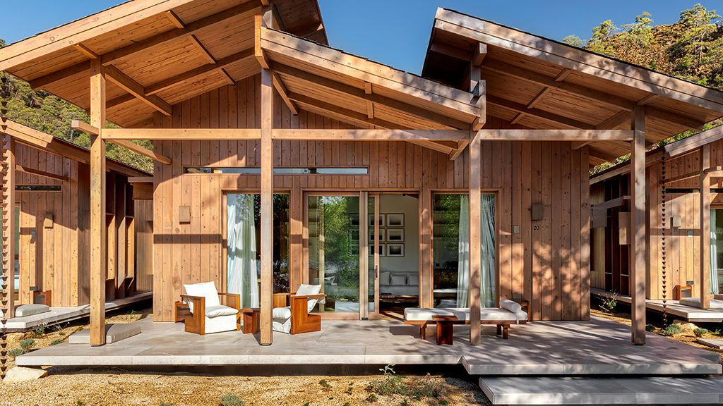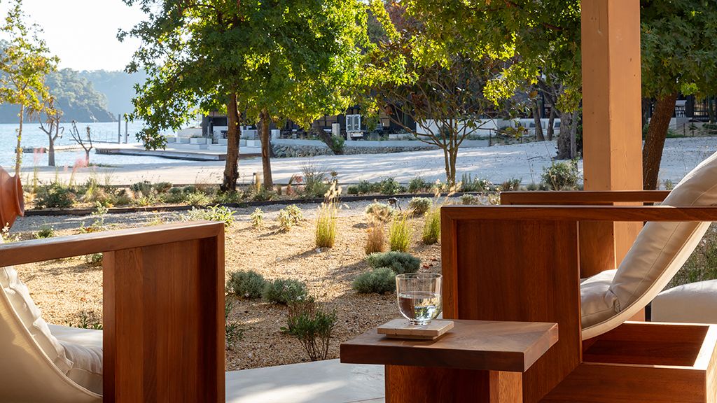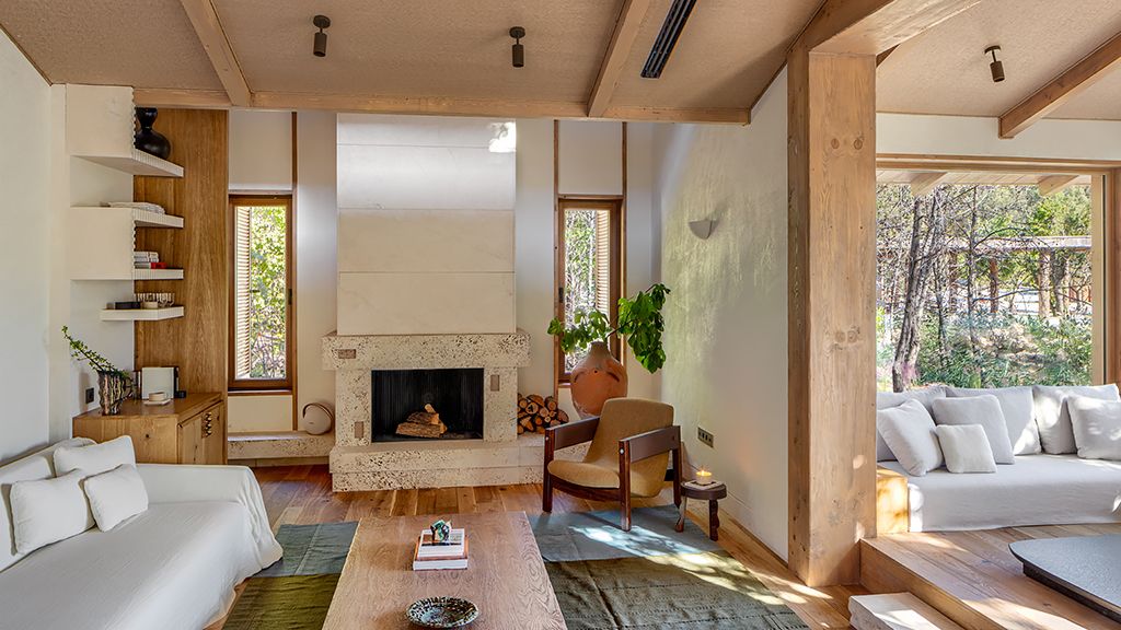 The cabana features a private terrace, two bedrooms with ensuite bathrooms, queen or twin bed, living room, fireplace, minibar, shower, coffee and tea setup, safe. The interiors are inspired by the light and airy essence of the Mediterranean, overlooking the forest.