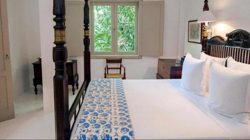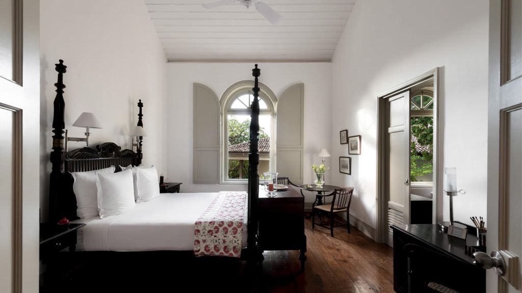 Suites enjoy views over the garden, or glimpses of fort ramparts and the harbour through the leaves of Para rubber trees.