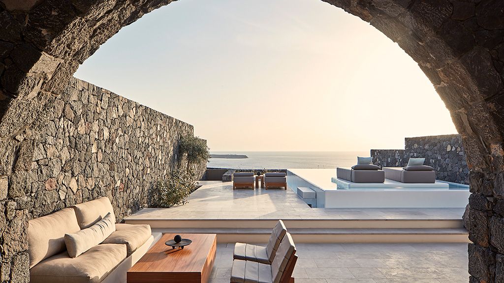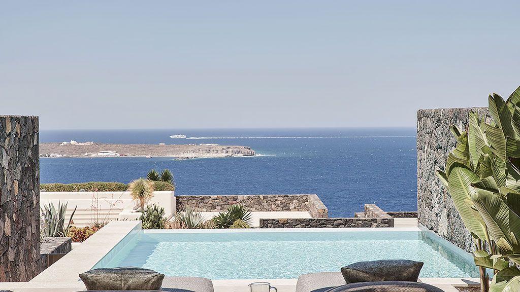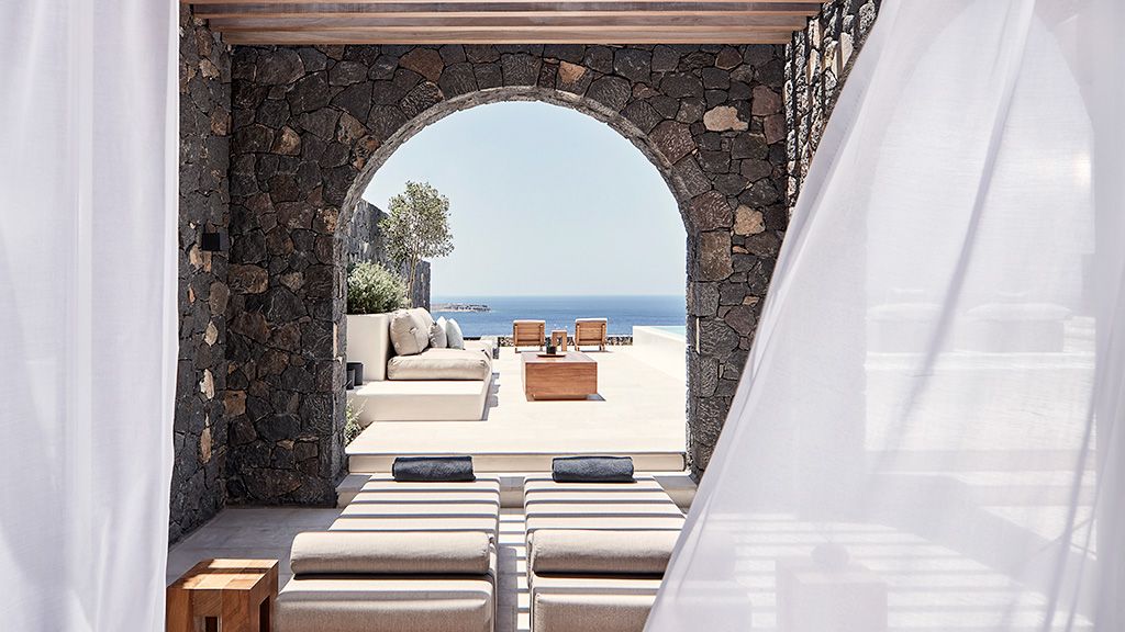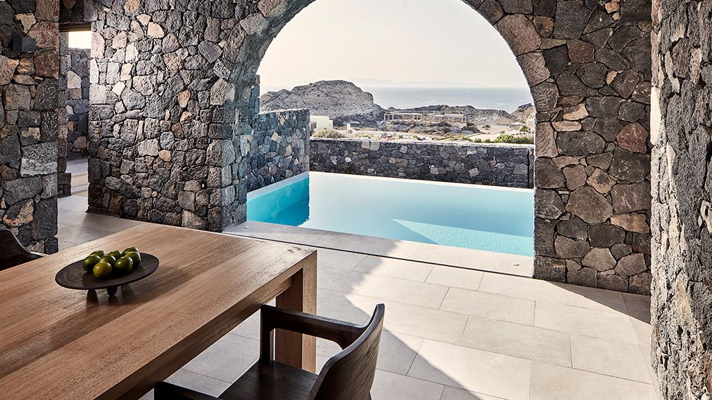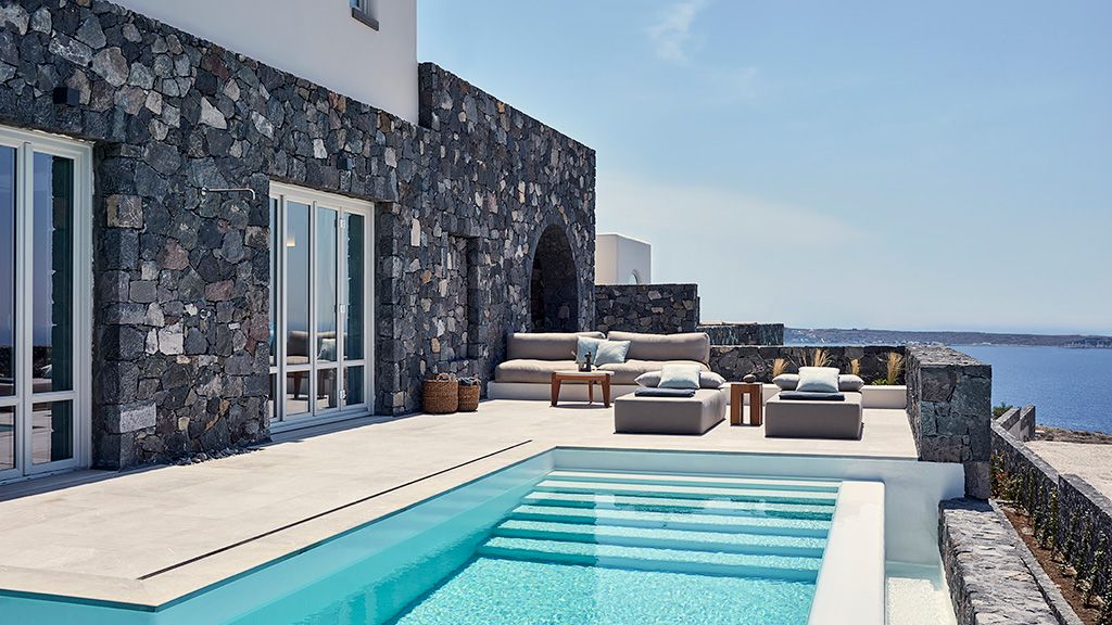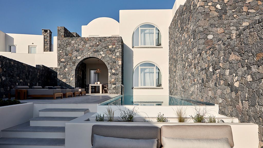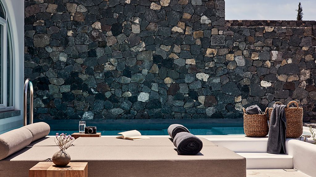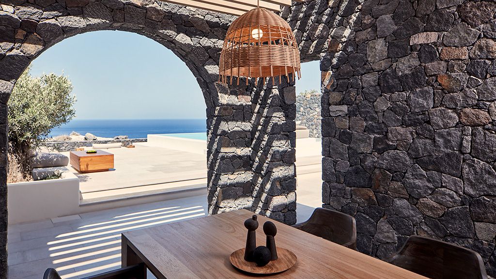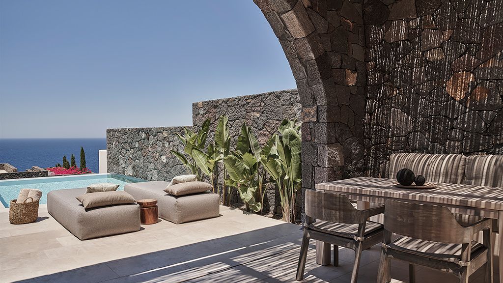 Located on a rugged cliffside above the picturesque fishing town of Ammoudi, Canaves Oia Epitome captivates with romantic island sunsets and enchanting plunge pools. Contemporary design mirrors the colors of the surrounding volcanic landscape, while cave-like interiors give a nod to the island's traditional architecture.