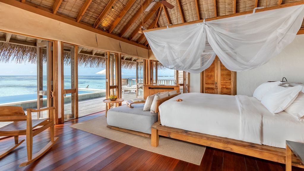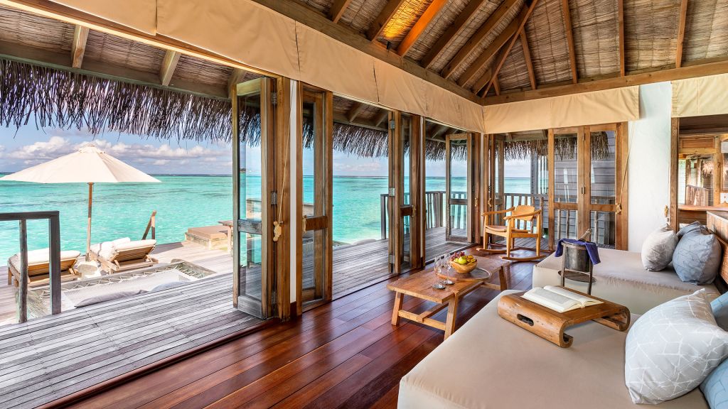 Features 1 King bed, large living room with daybeds, dining area and overwater sundeck. Includes air conditioning, safe, TV, bamboo bicycle, minibar and Nespresso machine.