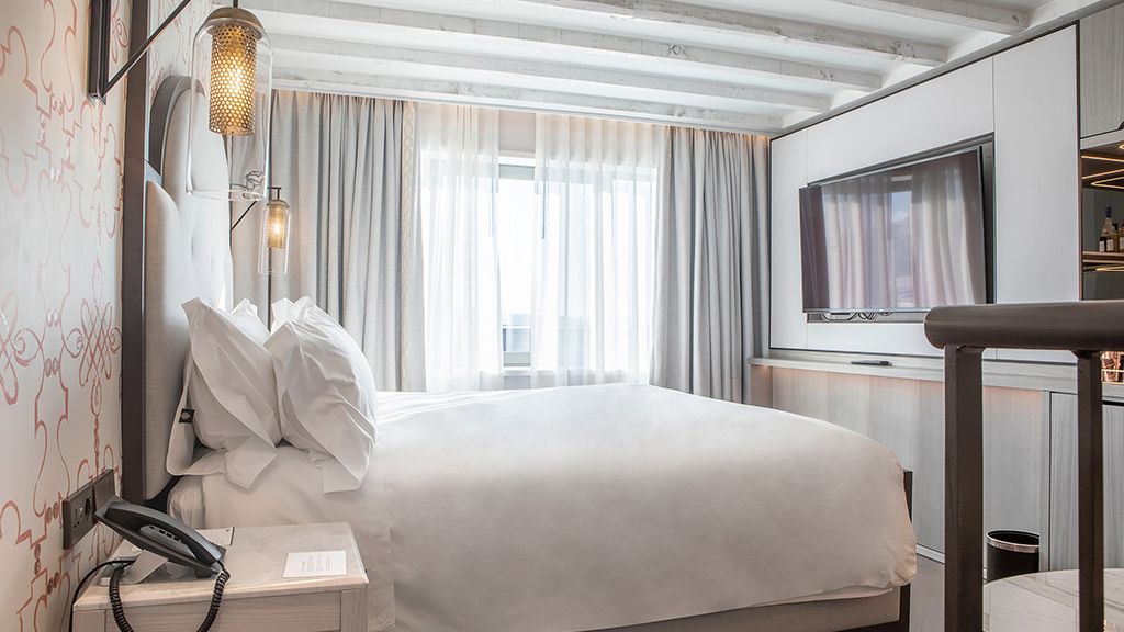 Room with 1 King bed, and view of the Square.
