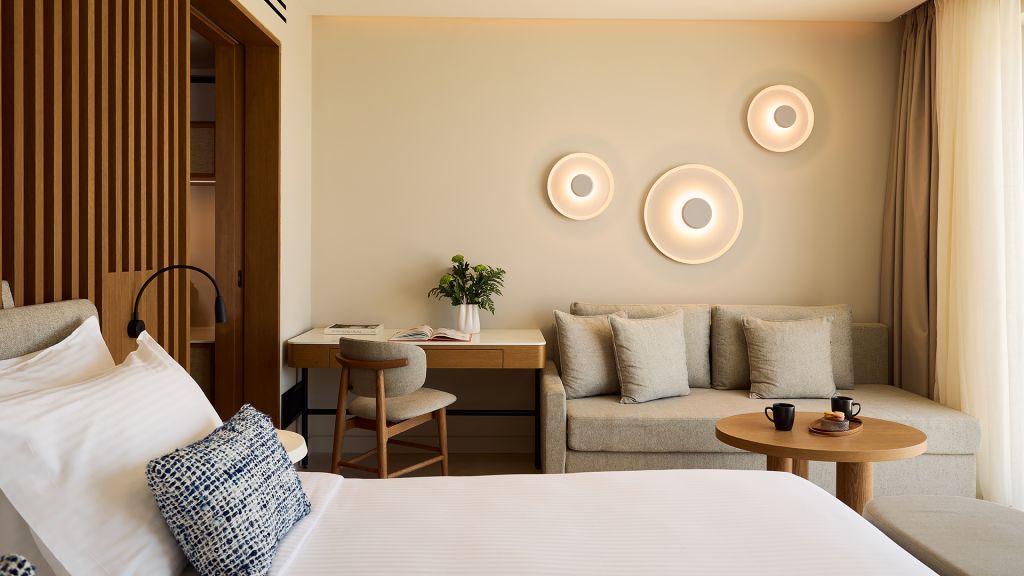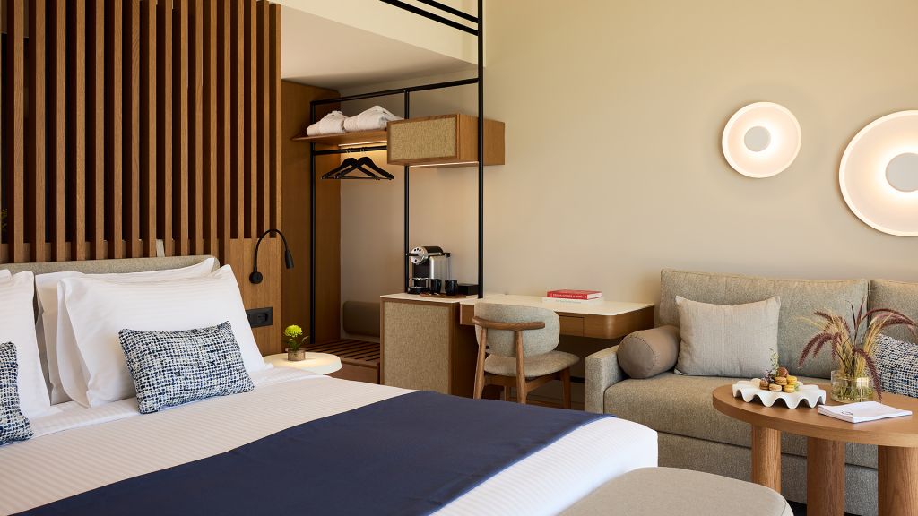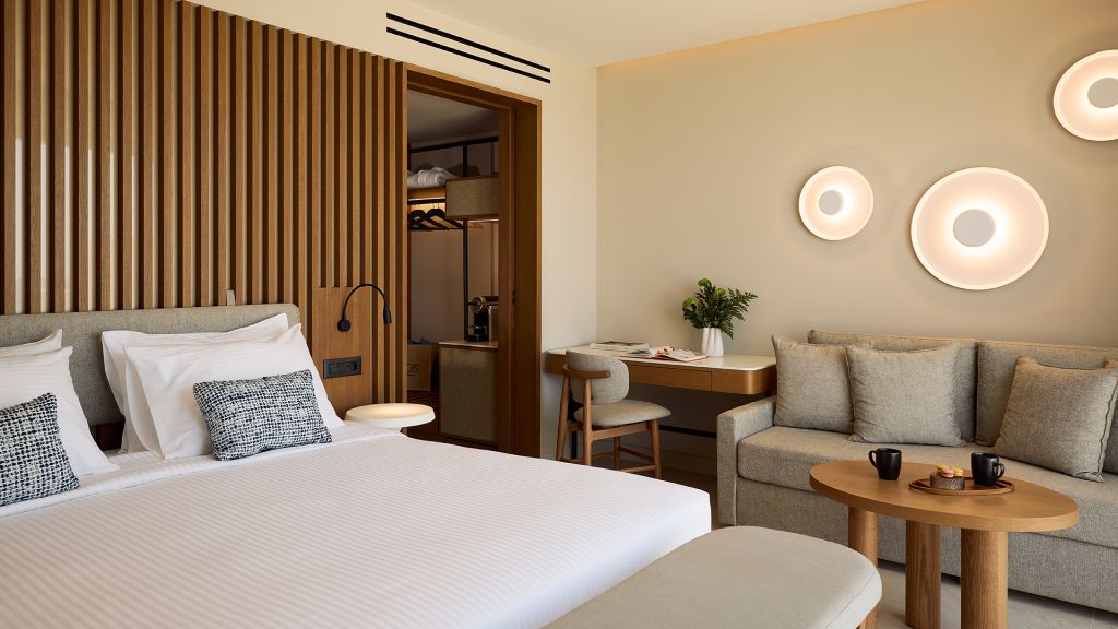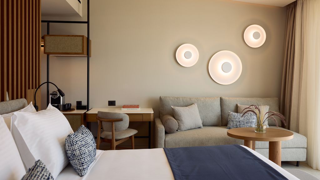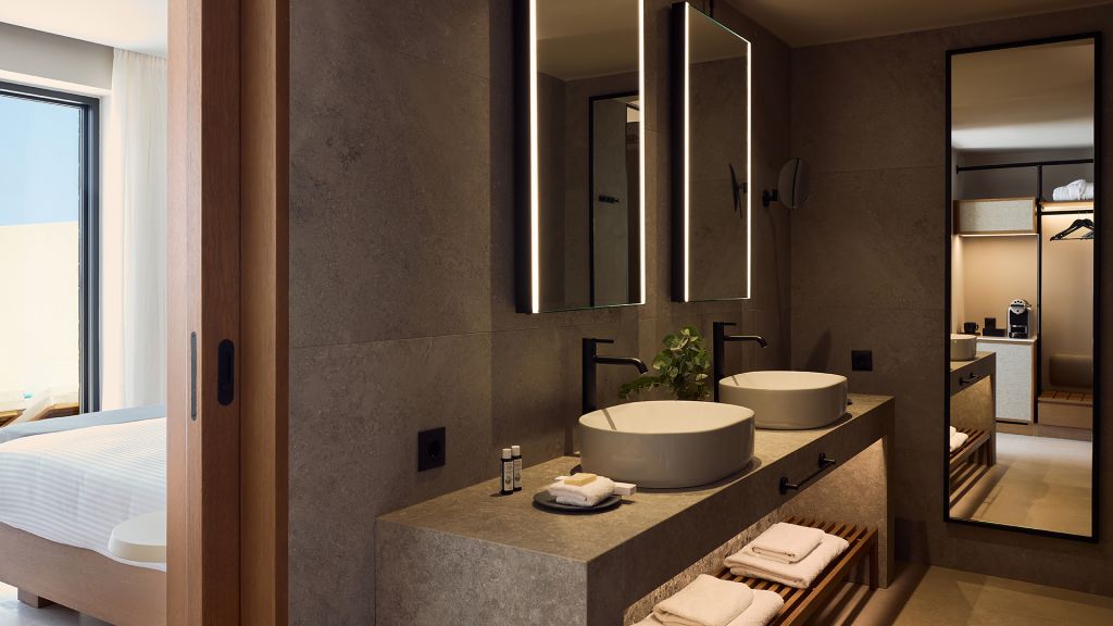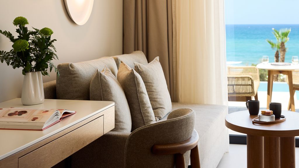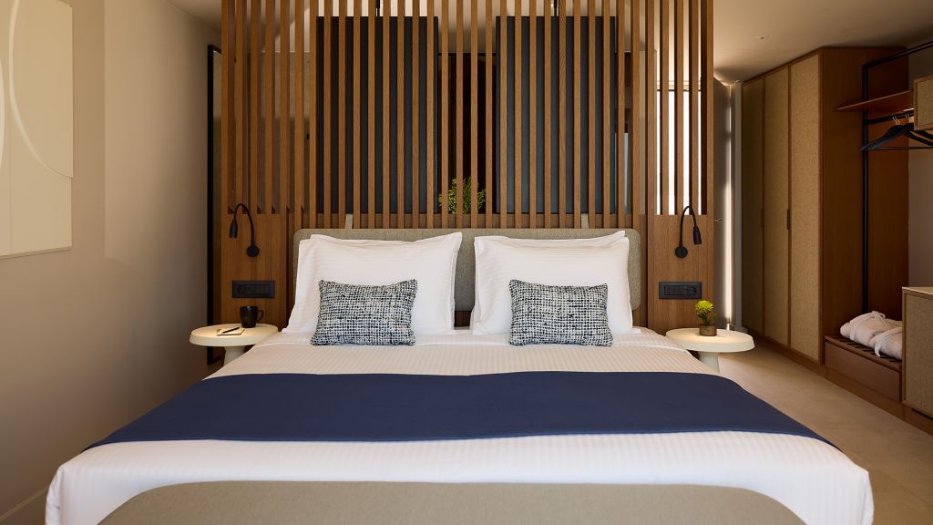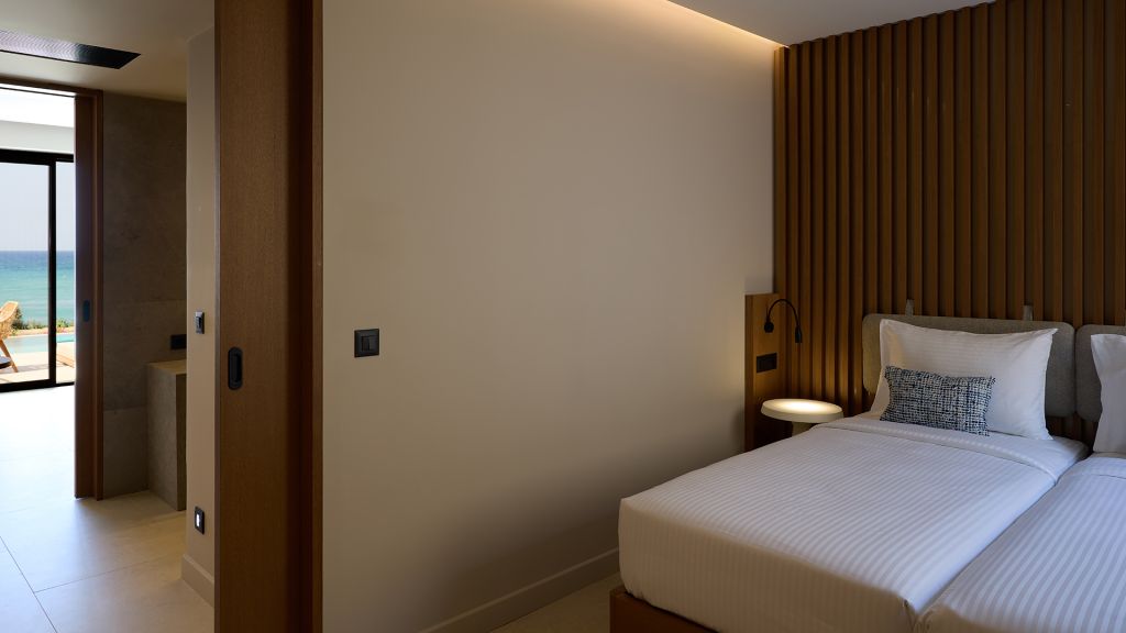 The resort’s rooms, spread across ten categories, combining modern comfort with earthy elegance. Accommodations range from deluxe rooms with expansive sea views to two-bedroom suites with private pools—ideal for couples, families, or small groups. Interiors favor clean lines, natural textures, and sun-washed tones, all working together to create a sense of quiet sophistication.