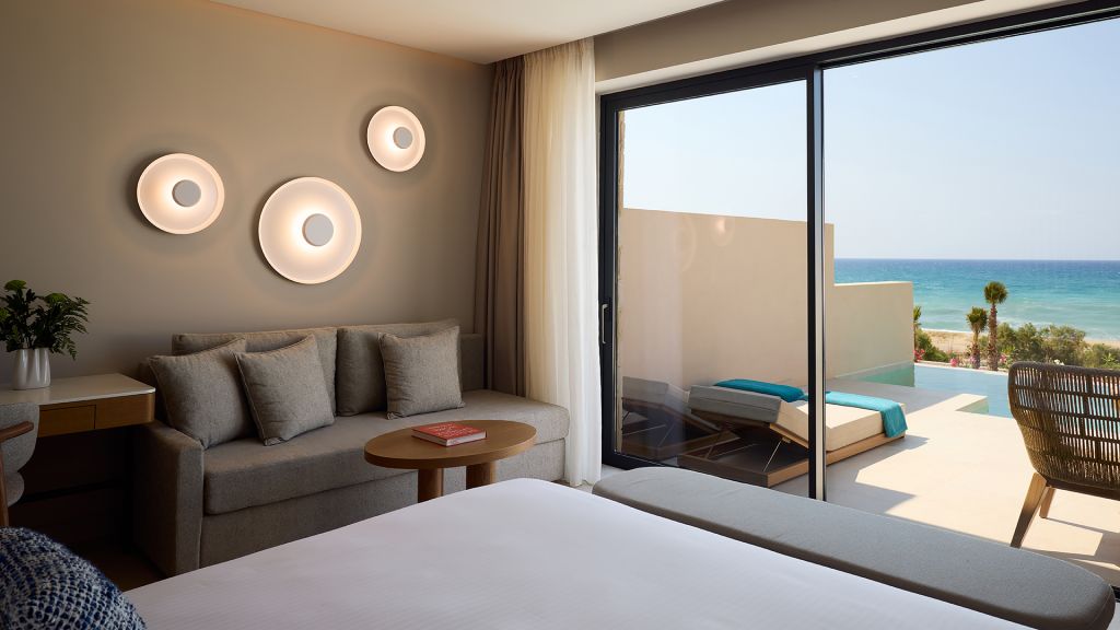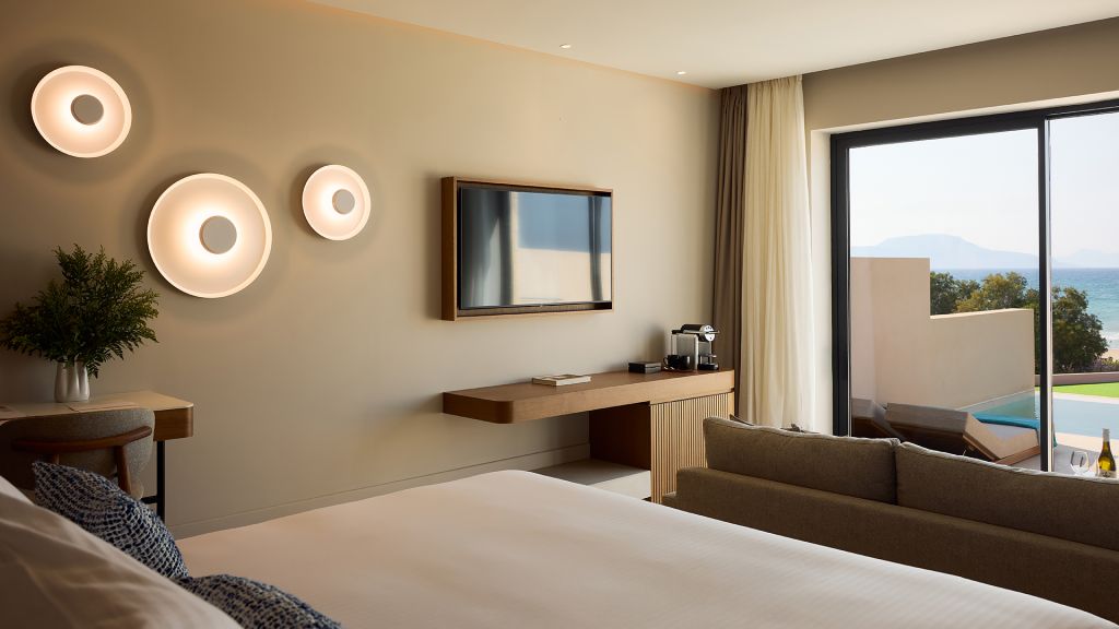 Two interconnecting rooms, 1 king size, 2 single, 1 sofa bed, individual A/C, mini bar, 50" TV, tea kettle, Nespresso, iron and ironing board, bathrobes and sleepers, expanded patio with private pool.