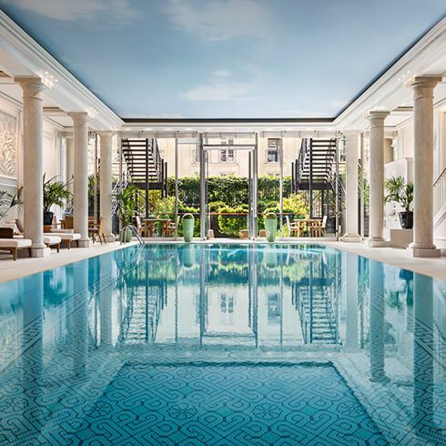 The inimitable Pierre-Yves Rochon has filled 100 rooms with beauty, utilizing a refined palate including rich golds, blues, and beige. Weary eyes and feet can refresh in the hotel's pool, the largest indoor option in Paris.
