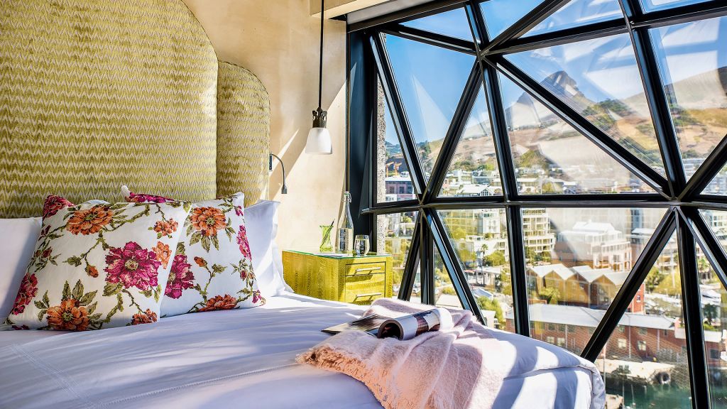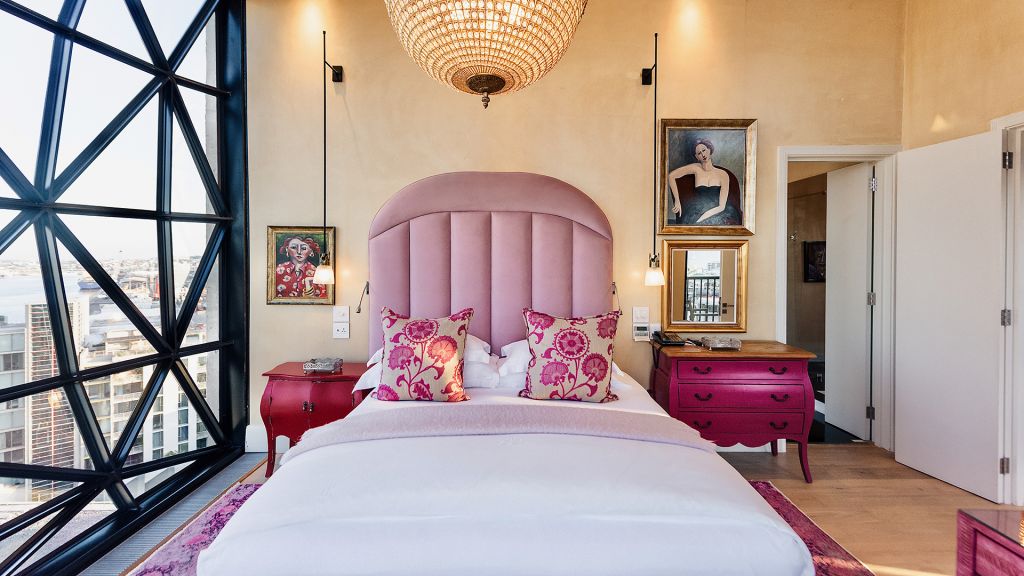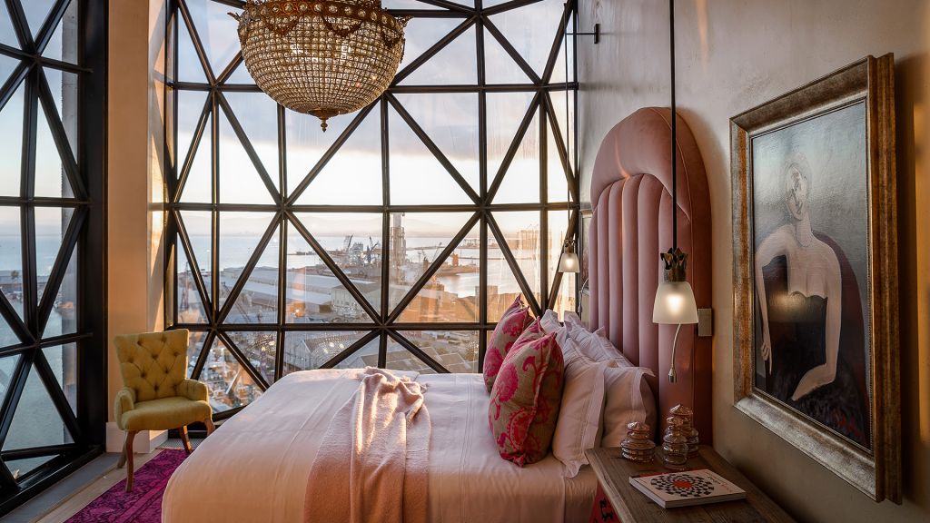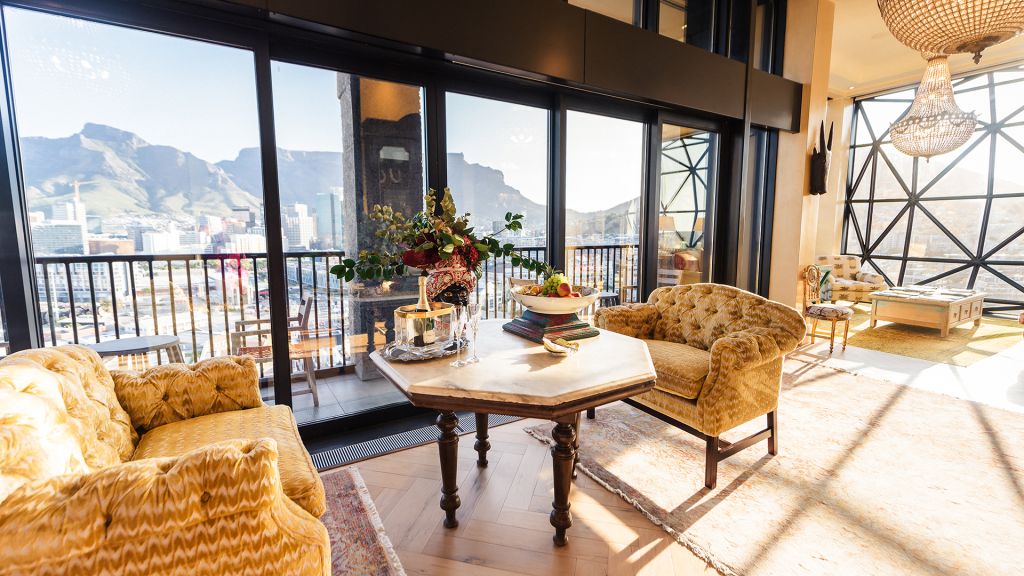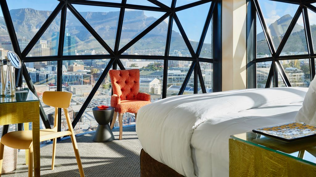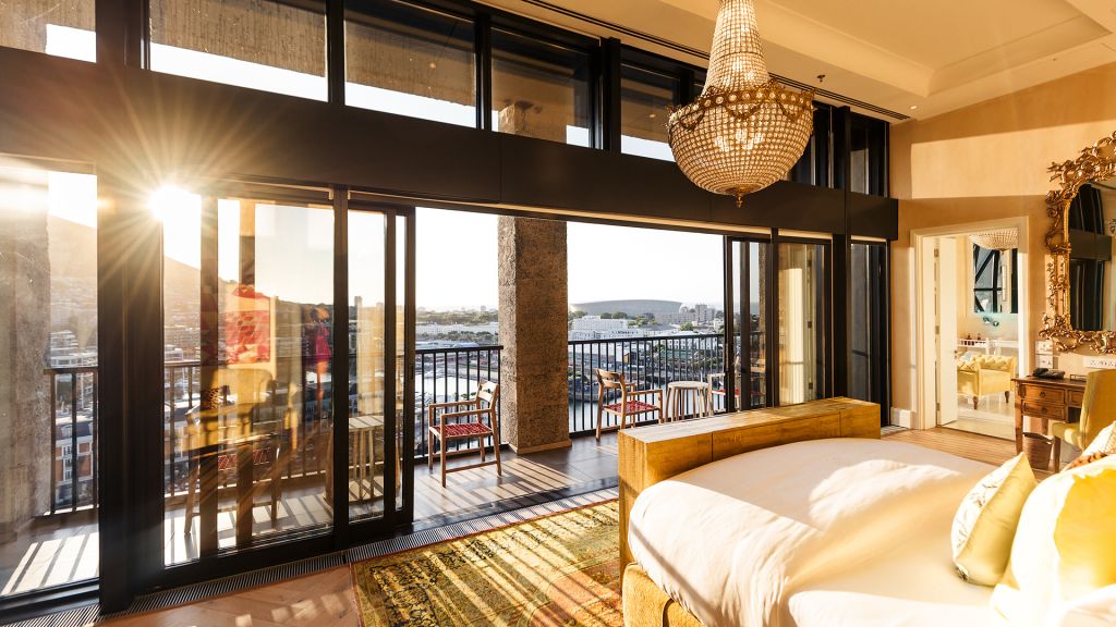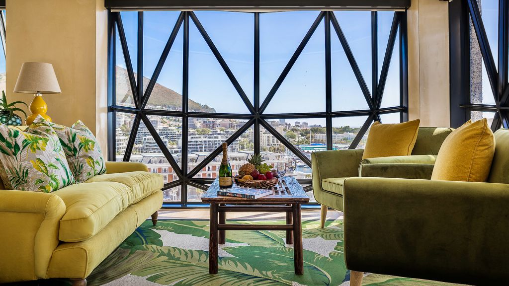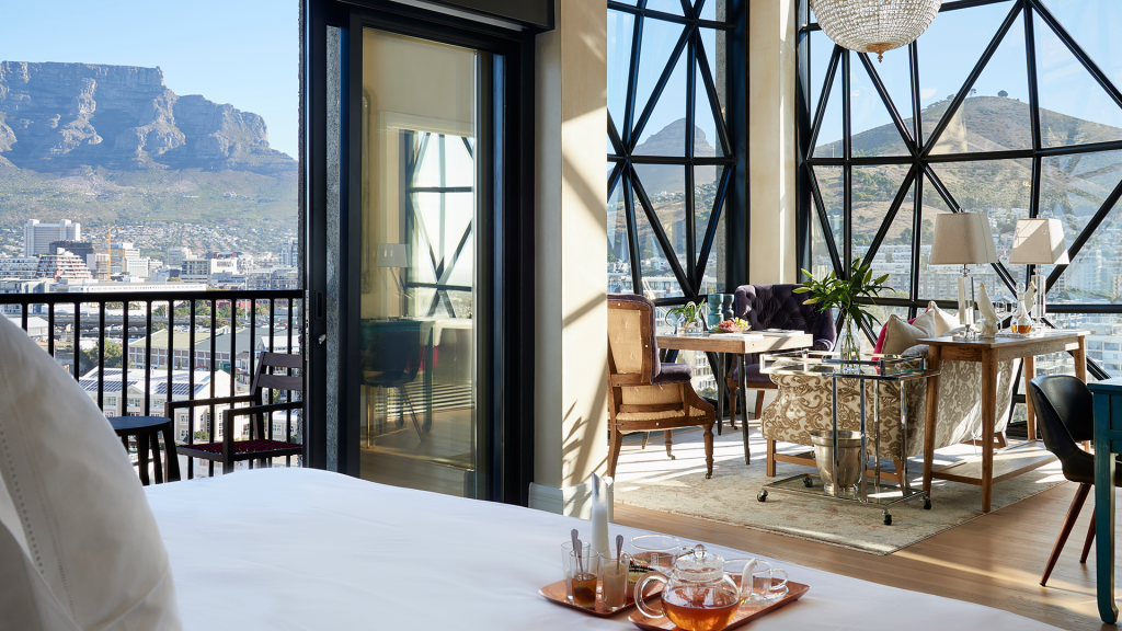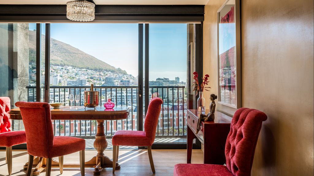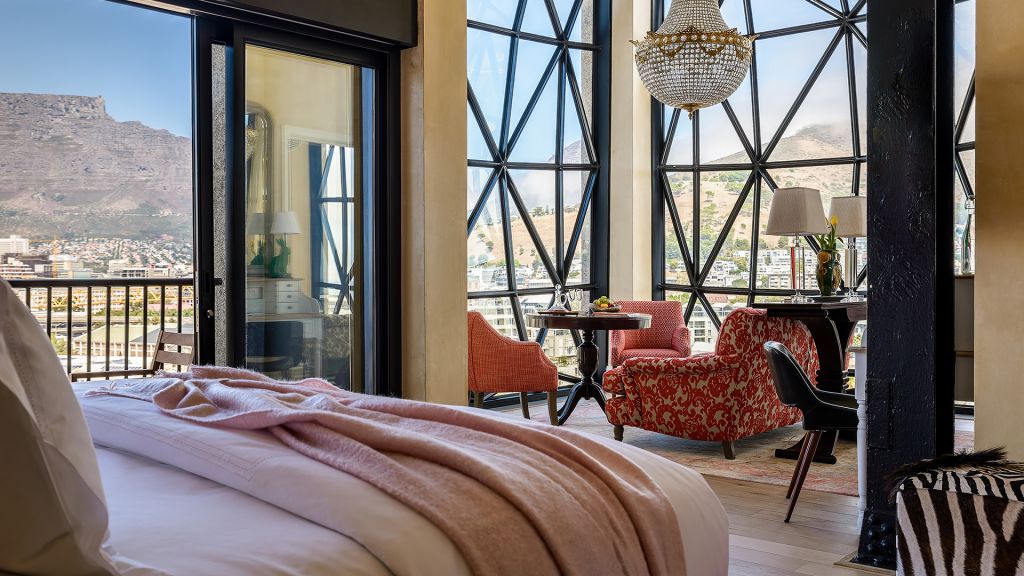 One Bedroom Penthouse Suite with king bed, panoramic views of Cape Town, TV and Wi-Fi.