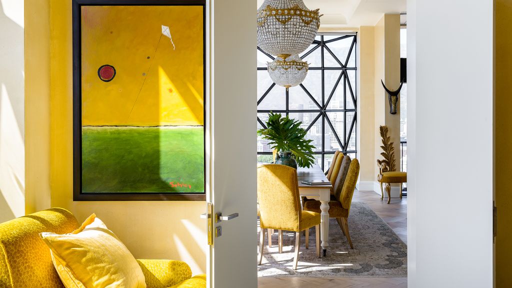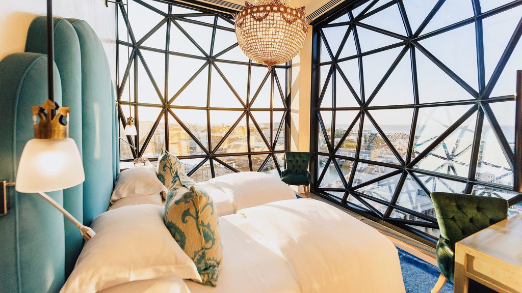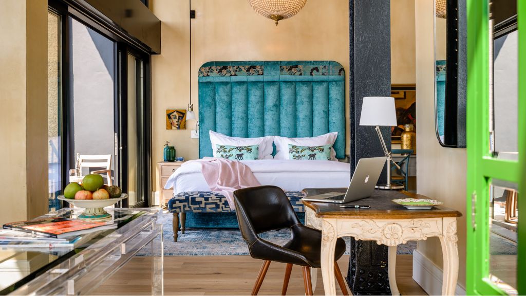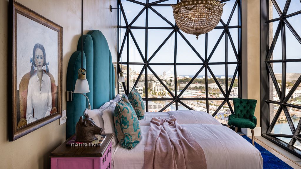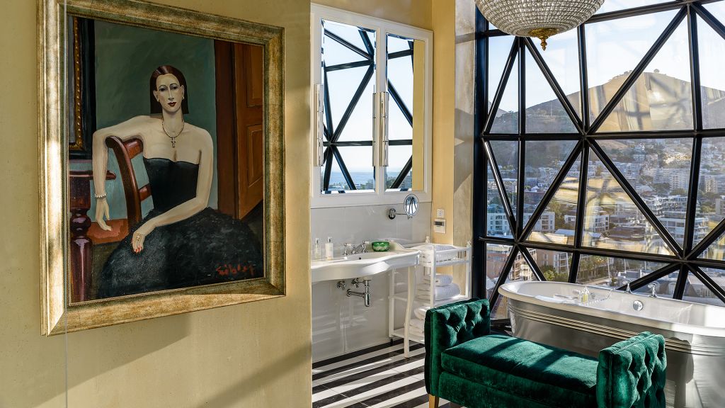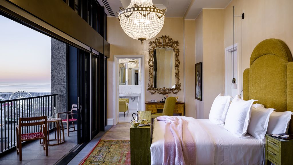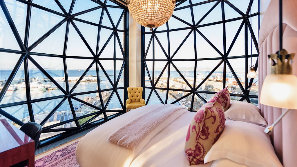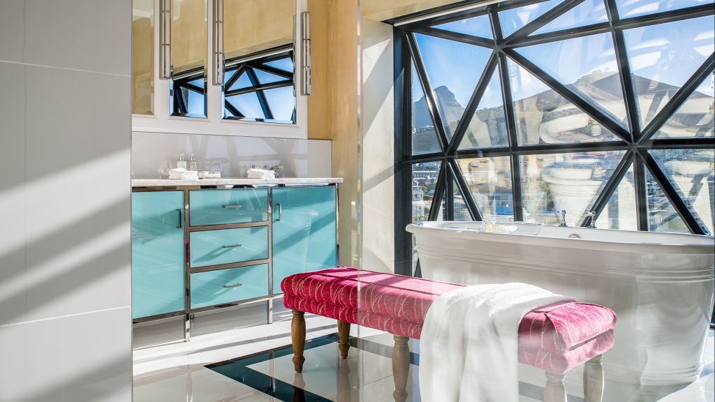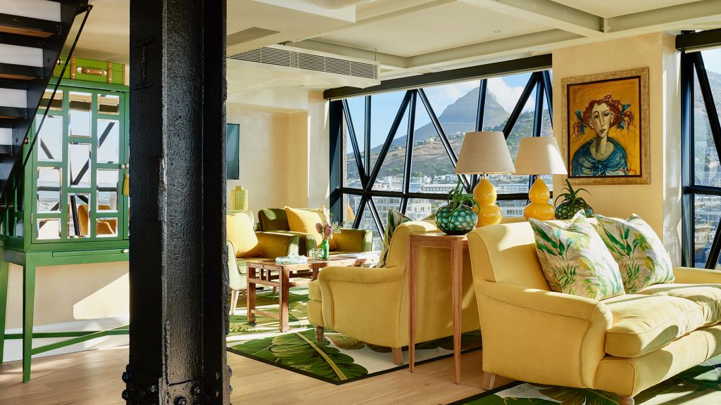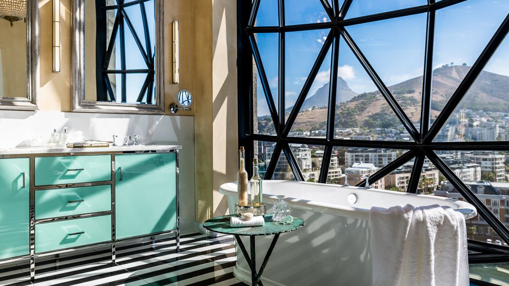 One Bedroom Penthouse Suite with king bed, panoramic views of Cape Town, TV and Wi-Fi.