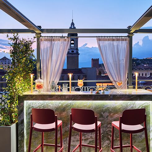 Steps outside the rooms and Vista Palazzo Verona’s features are the equal of much larger hotels. There’s a cozy library space that’s perfect for a quiet afternoon with a good book; a serene wellness space with indoor swimming pool, Turkish bath and hydromassage tub. Perhaps our favorite feature is the charming rooftop bar and restaurant, which offers dreamy views over the medieval rooftops to the rolling hills of Valpolicella. Here, guests can savor a menu brimming with Italian staples, with ingredients grown locally in the rolling hills outside the city.
